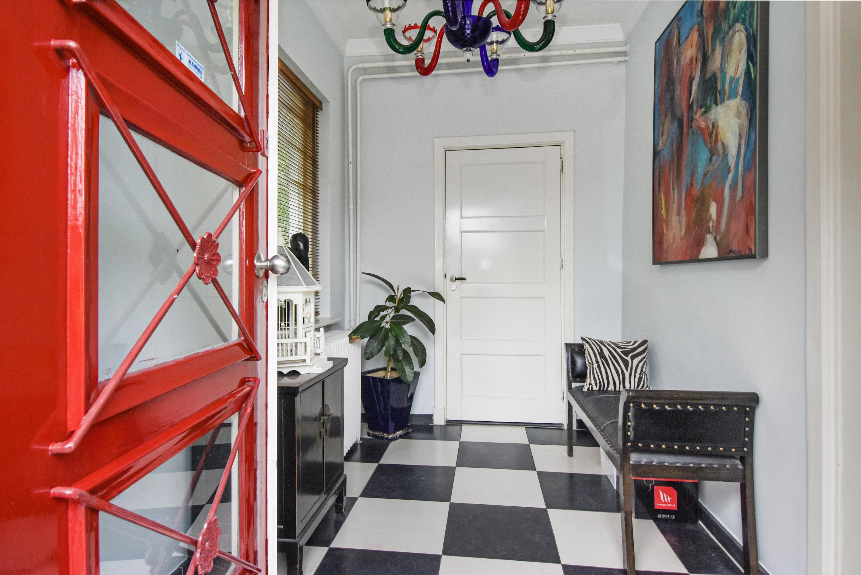 Begane grond: Binnenkomst via een charmante vestibule met zwart-witte tegels leidt naar een ruim toilet met marmeren wandtegels en verder naar de centrale hal.