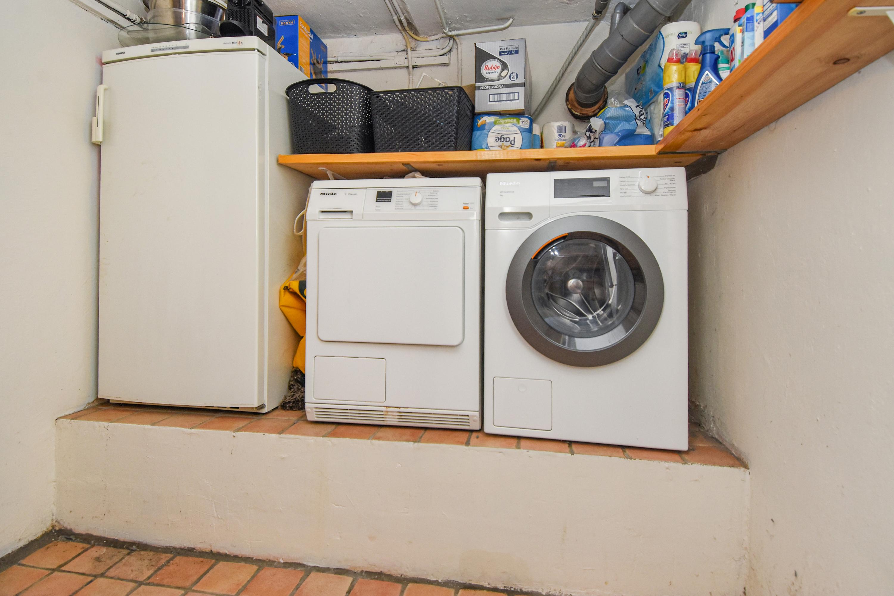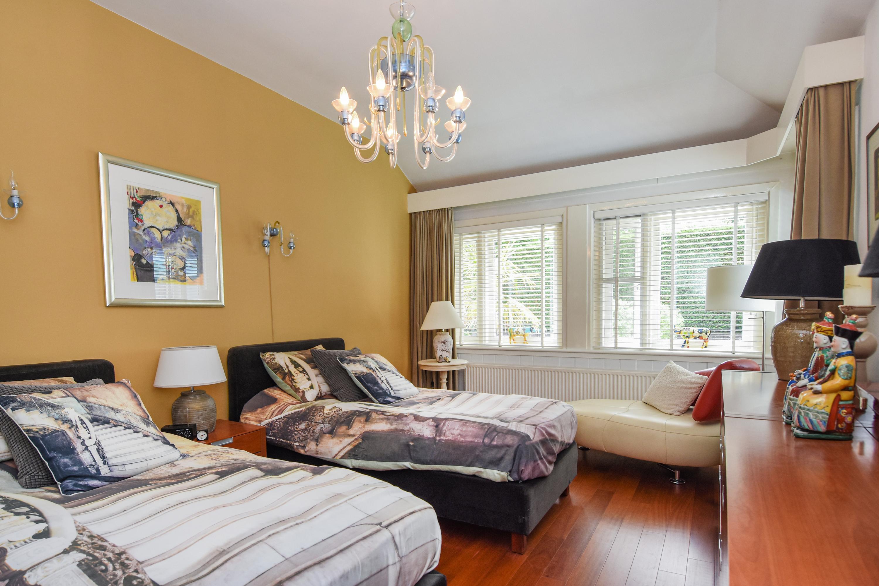 Een gang leidt naar de slaapkamers, met werkkamer met doorgang met dubbele deuren naar de achtertuin. De eerste badkamer beschikt over een voorportaal met vaste kasten met elektrische boiler, een inloopdouche, een breed wastafelmeubel en een toilet. De tweede badkamer beschikt over een douche, wastafel en een toilet. In de kelder bevinden zich de wasmachineaansluiting, een wijnkelder met houten rekken en een elektrische boiler.