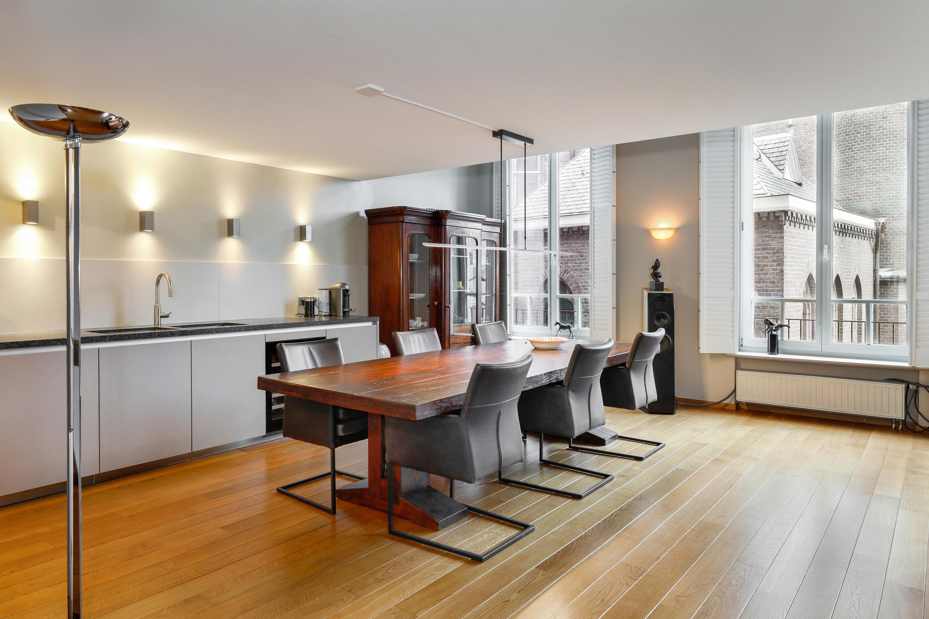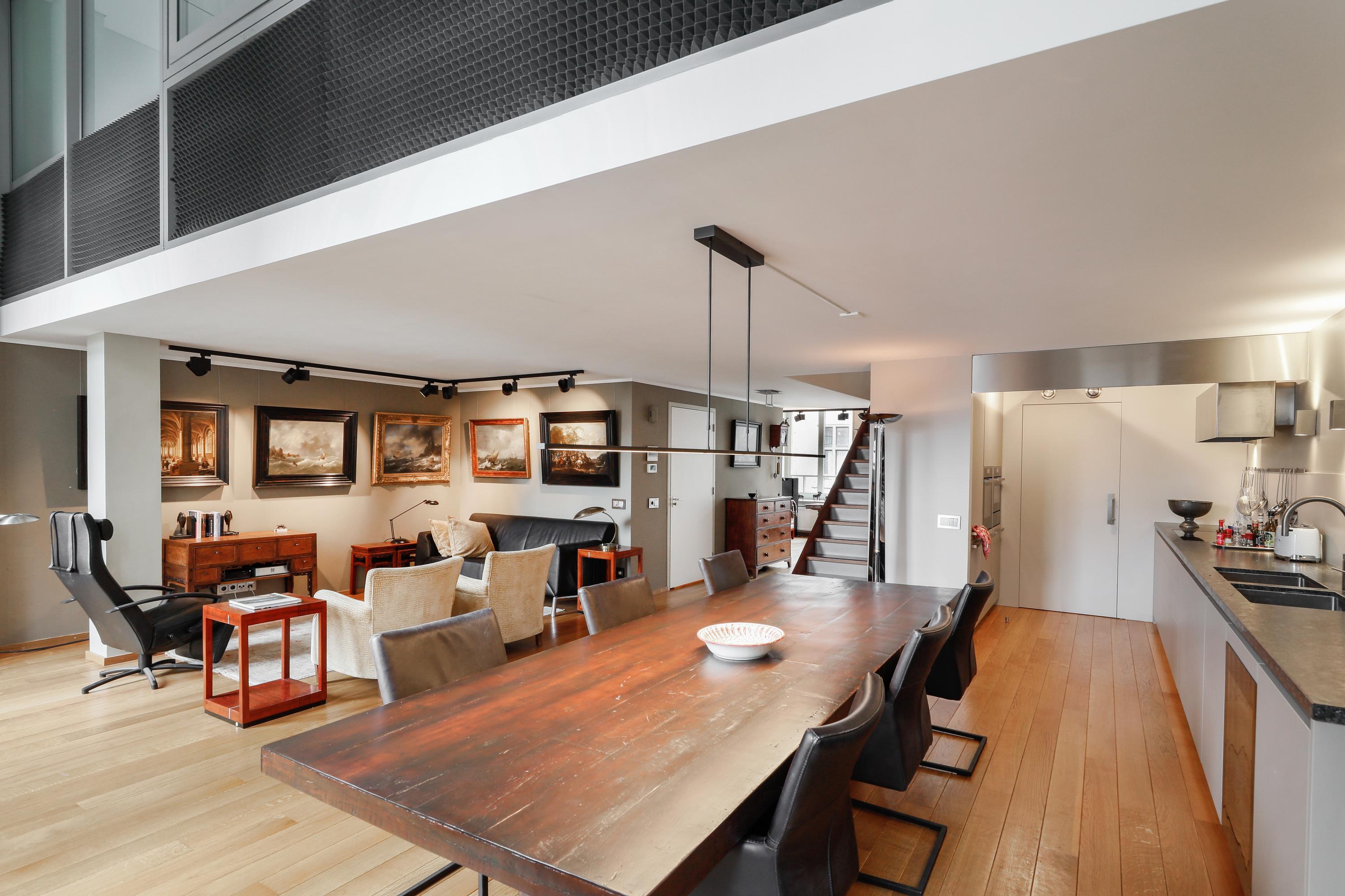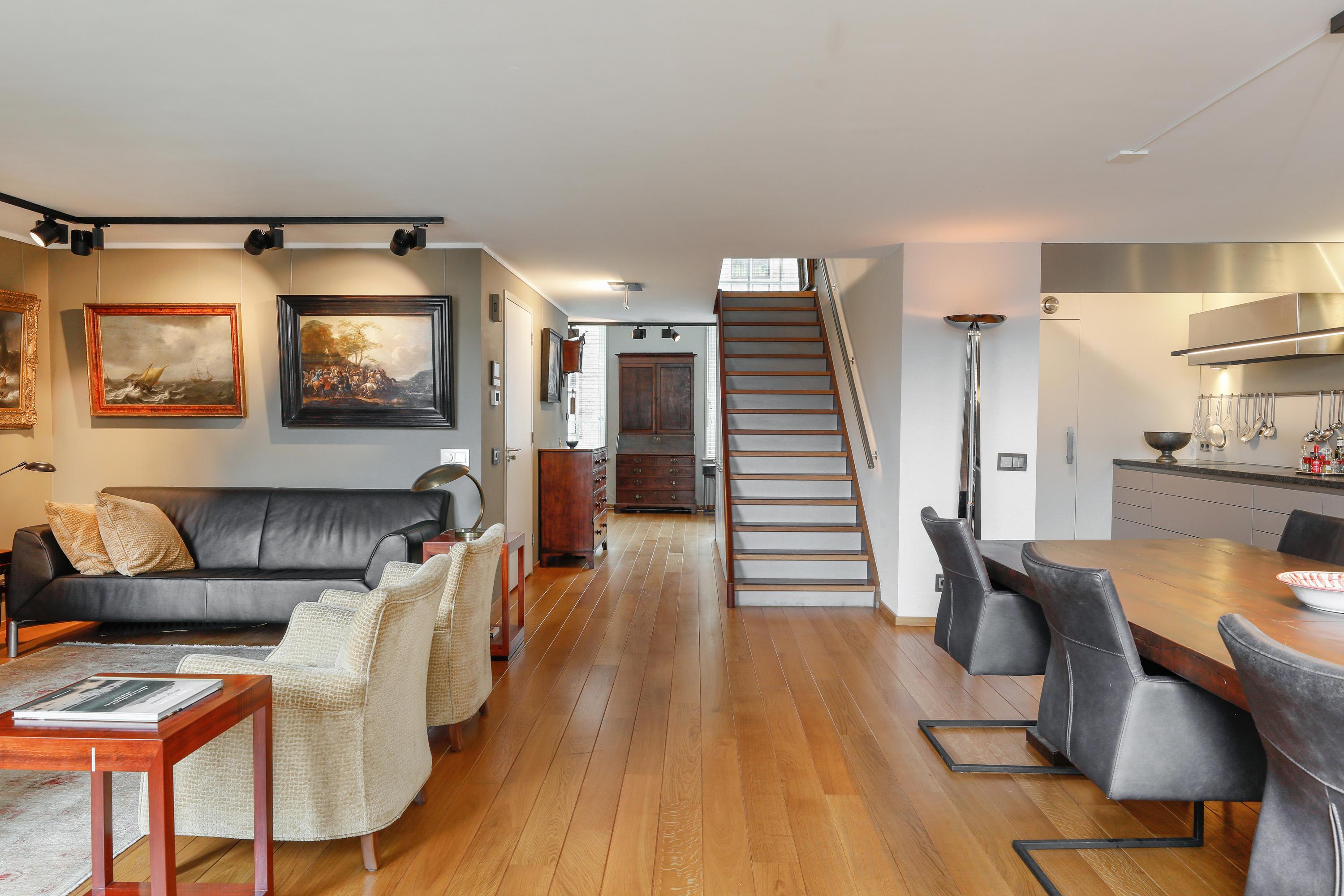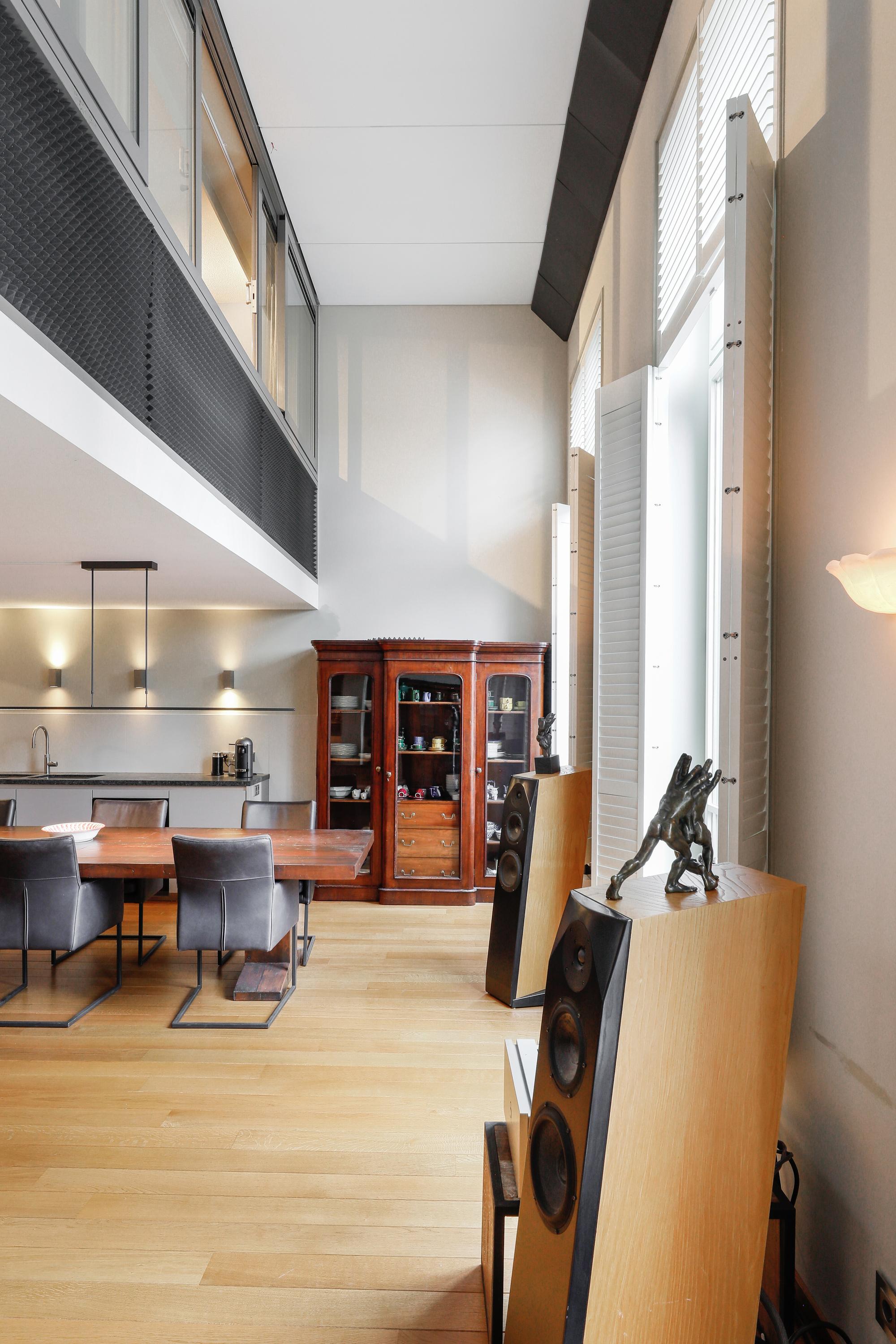 Het is heel bijzonder om, achter de historische gevel, deze moderne woning te vinden. Bij de renovatie / herbouw is dan ook alleen die voorgevel blijven staan. Met de hoge ramen dringt die historie je luxe appartement dan ook nog steeds binnen. Gelukkig maar. Aan de gevel is de plafondhoogte nog steeds ca. 580 cm. Prachtig, en zo valt het licht ook heel diep in je woning. Waar op tekening een loggia was gepland in 2001 is nu een ruimte die het hele jaar door gebruikt kan worden. Dus ook op die zomerse dag als loggia, door de grote hoge ramen open te zetten. Een knusse zit en de keuken treft u aan onder de verdieping.