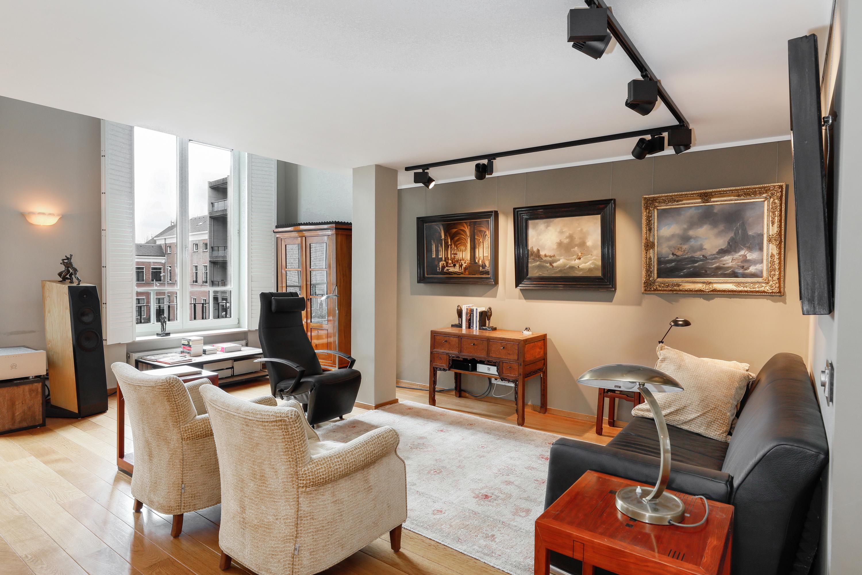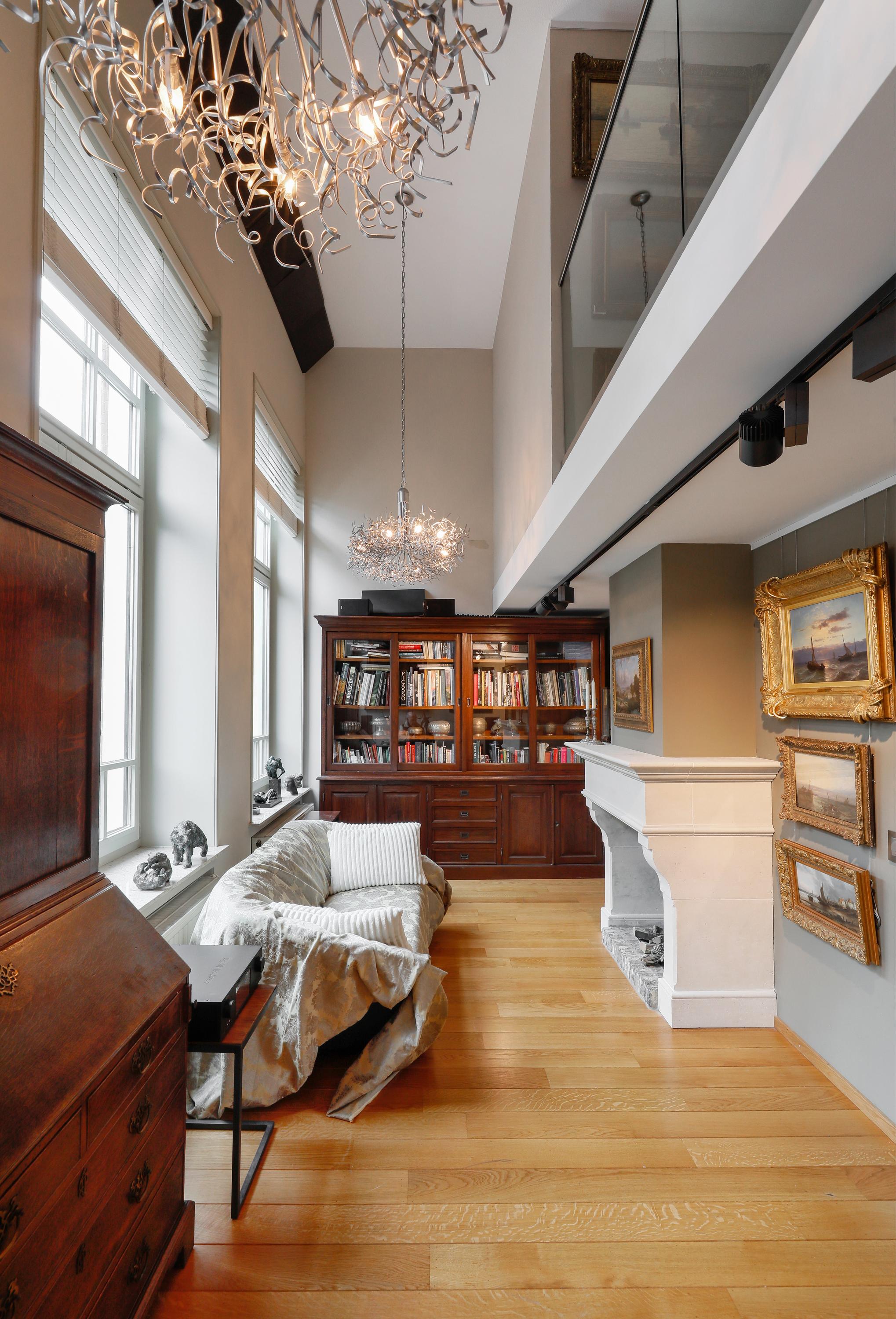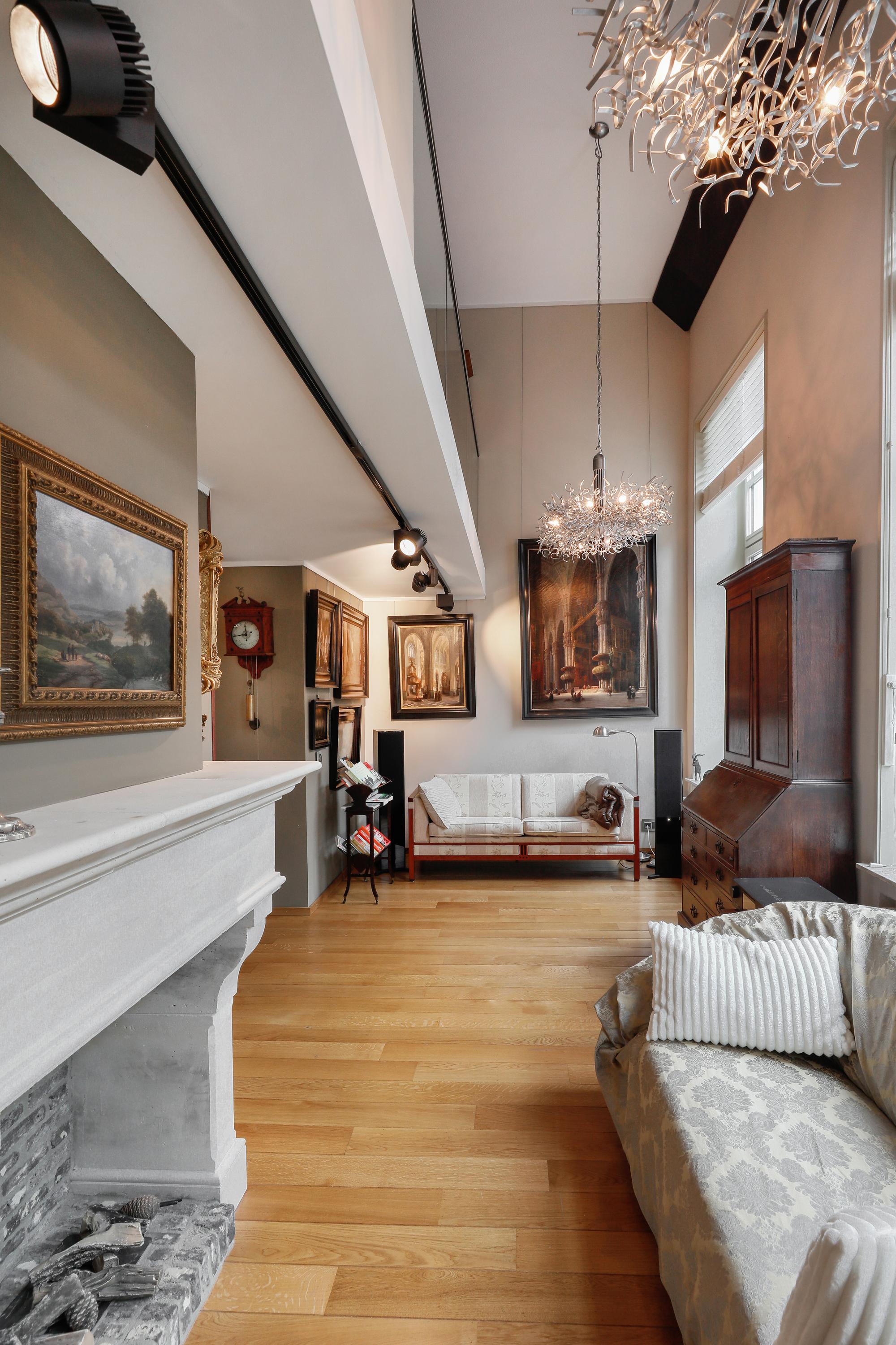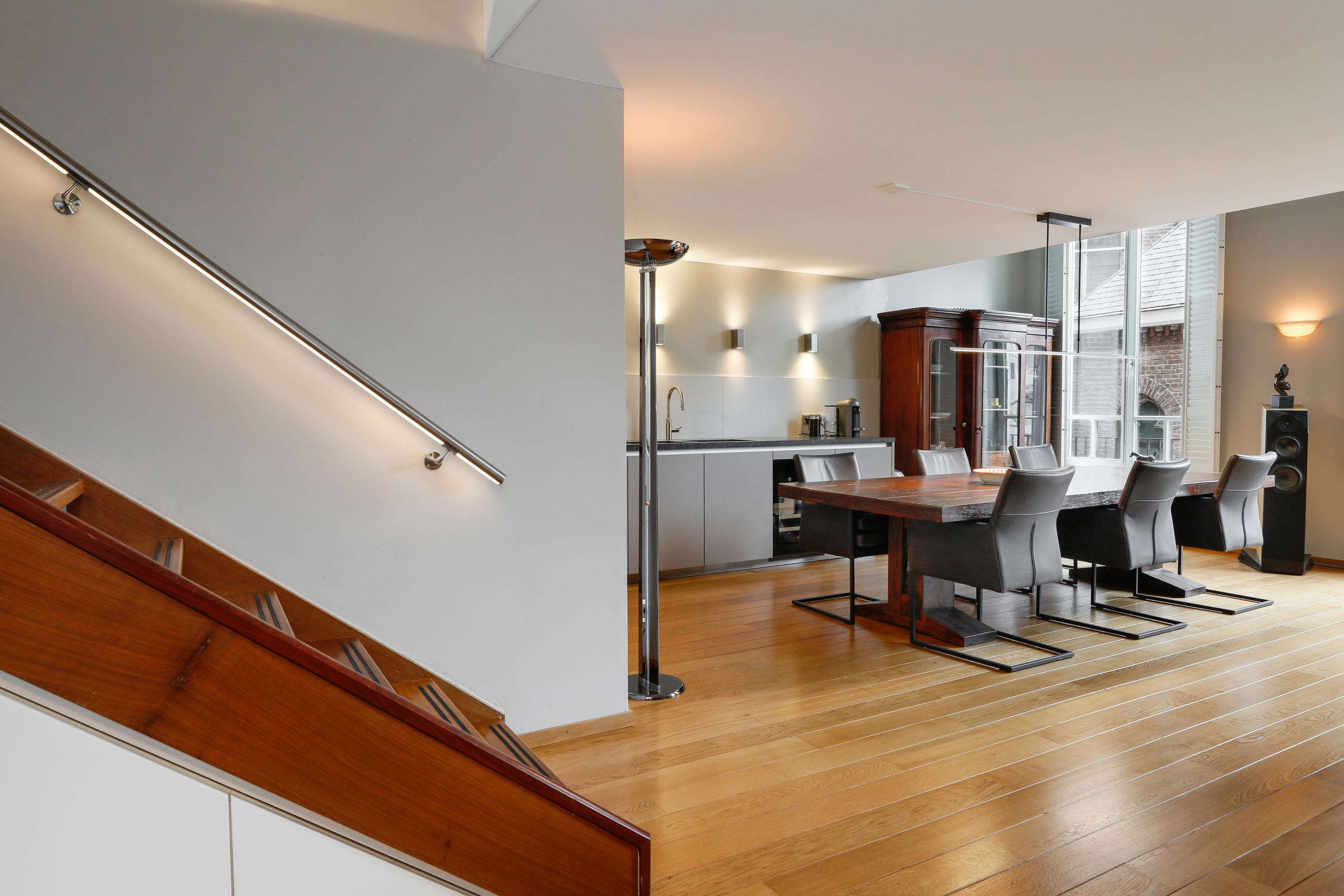 Het is heel bijzonder om, achter de historische gevel, deze moderne woning te vinden. Bij de renovatie / herbouw is dan ook alleen die voorgevel blijven staan. Met de hoge ramen dringt die historie je luxe appartement dan ook nog steeds binnen. Gelukkig maar. Aan de gevel is de plafondhoogte nog steeds ca. 580 cm. Prachtig, en zo valt het licht ook heel diep in je woning. Waar op tekening een loggia was gepland in 2001 is nu een ruimte die het hele jaar door gebruikt kan worden. Dus ook op die zomerse dag als loggia, door de grote hoge ramen open te zetten. Een knusse zit en de keuken treft u aan onder de verdieping.