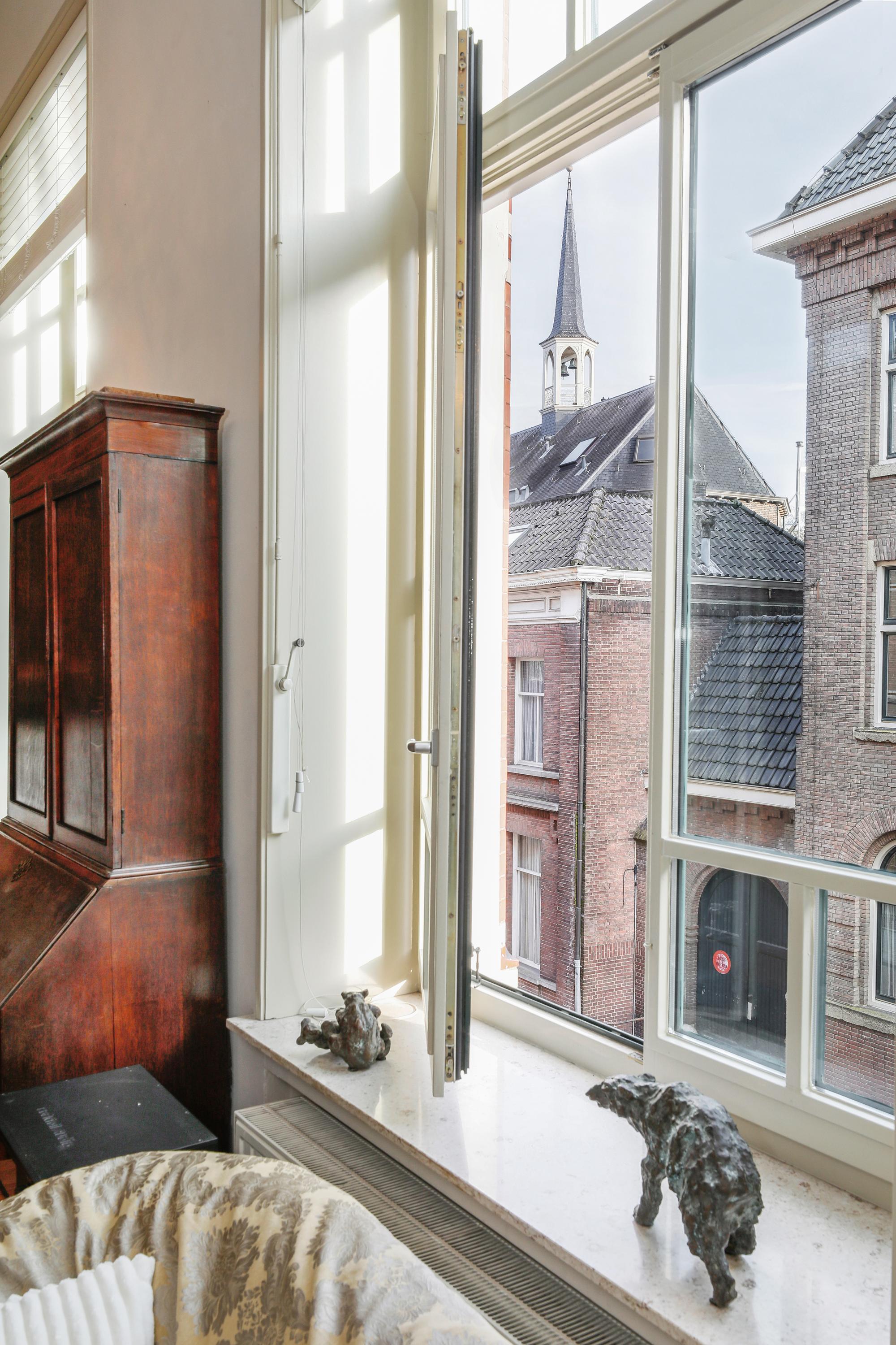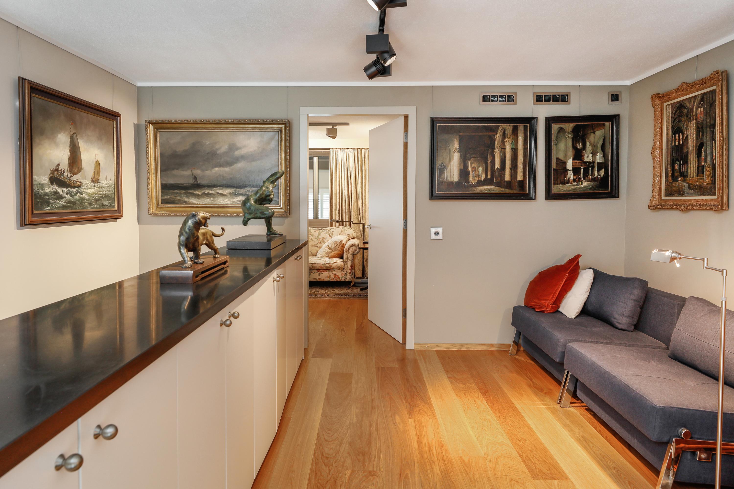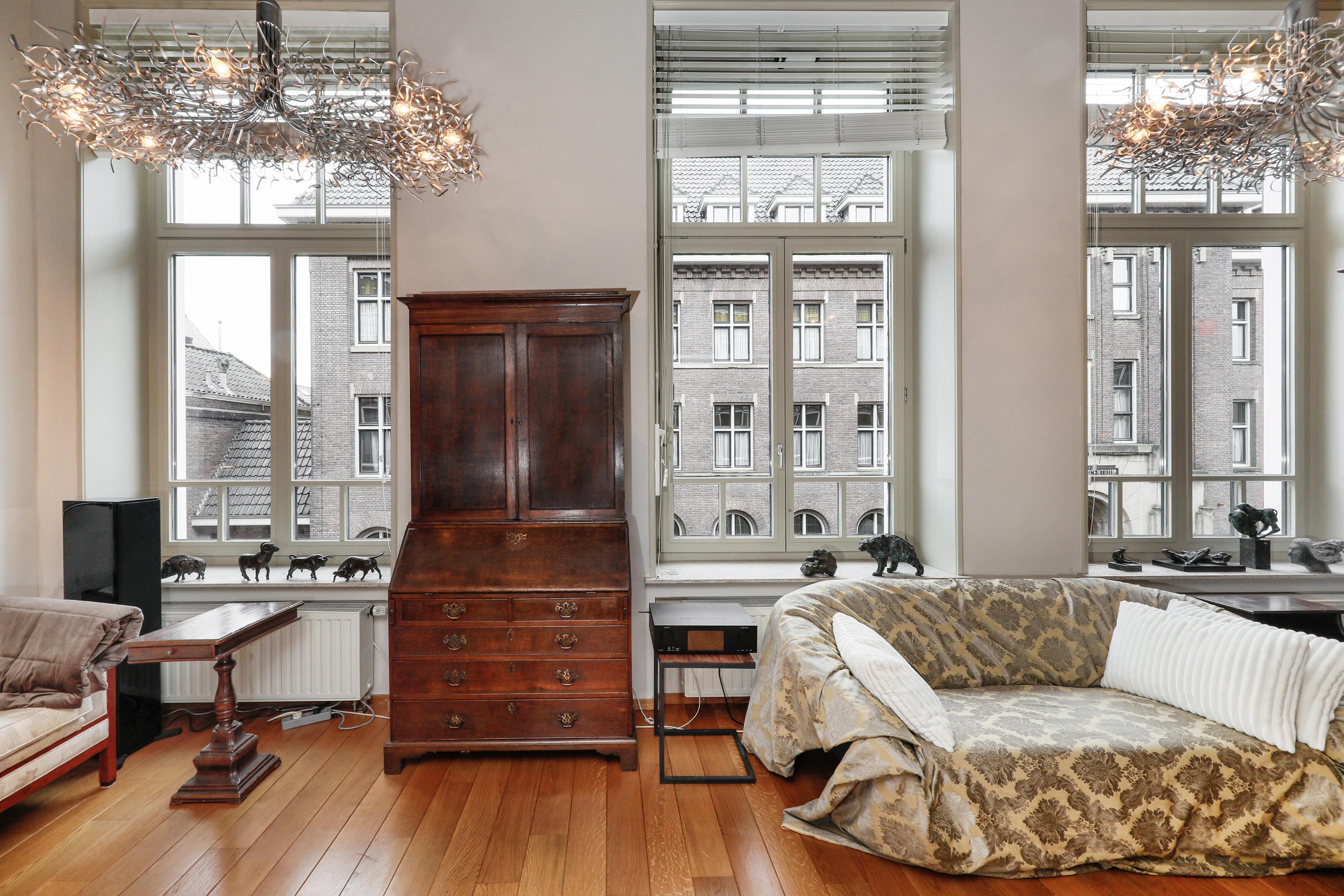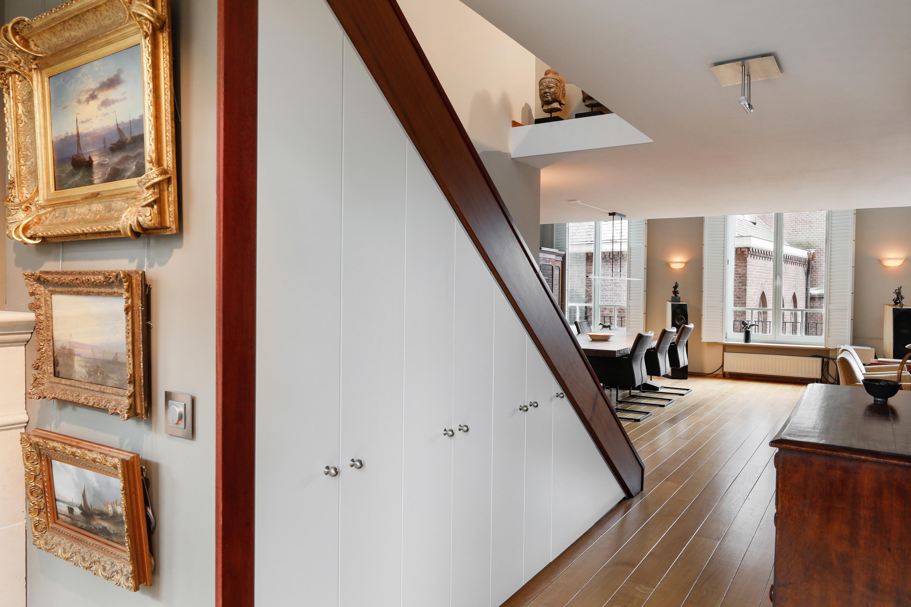 Het is heel bijzonder om, achter de historische gevel, deze moderne woning te vinden. Bij de renovatie / herbouw is dan ook alleen die voorgevel blijven staan. Met de hoge ramen dringt die historie je luxe appartement dan ook nog steeds binnen. Gelukkig maar. Aan de gevel is de plafondhoogte nog steeds ca. 580 cm. Prachtig, en zo valt het licht ook heel diep in je woning. Waar op tekening een loggia was gepland in 2001 is nu een ruimte die het hele jaar door gebruikt kan worden. Dus ook op die zomerse dag als loggia, door de grote hoge ramen open te zetten. Een knusse zit en de keuken treft u aan onder de verdieping.