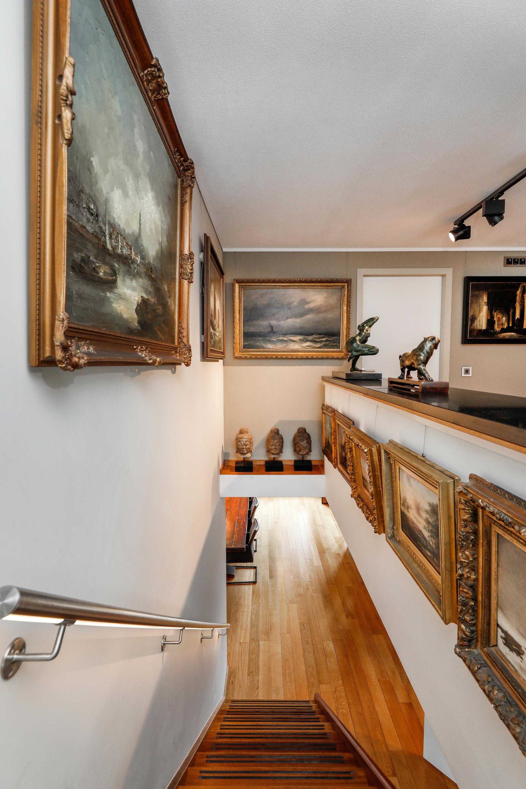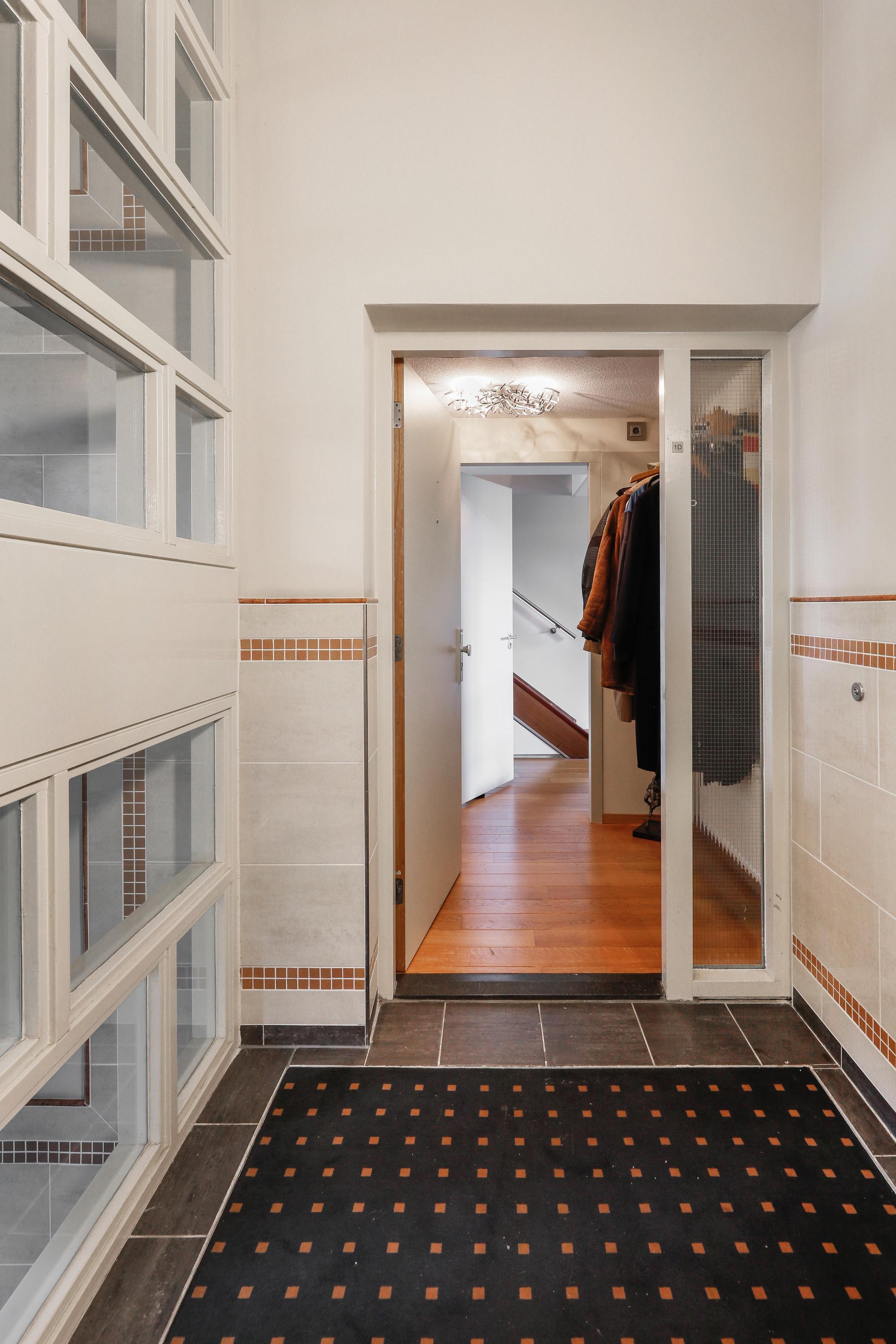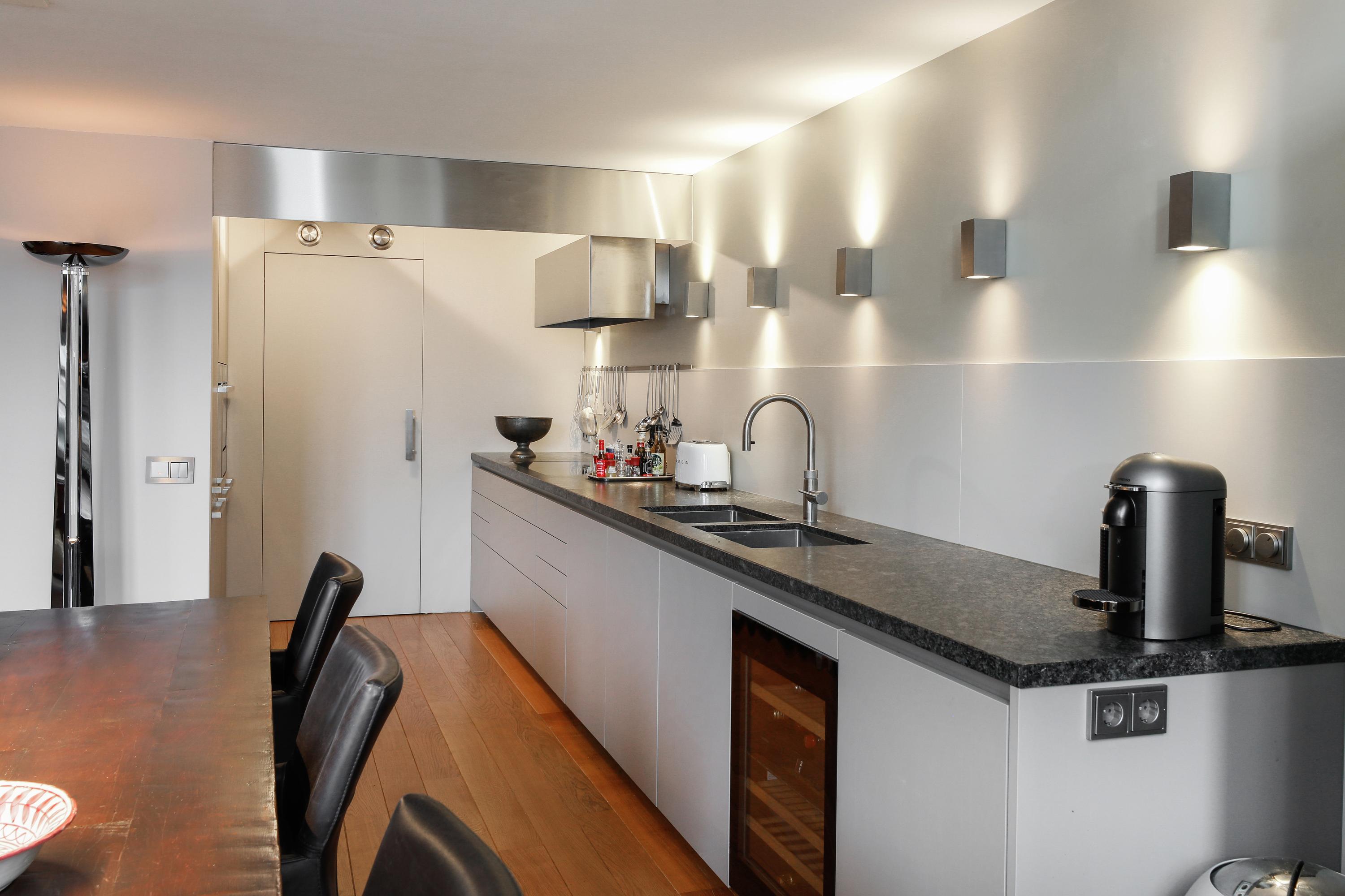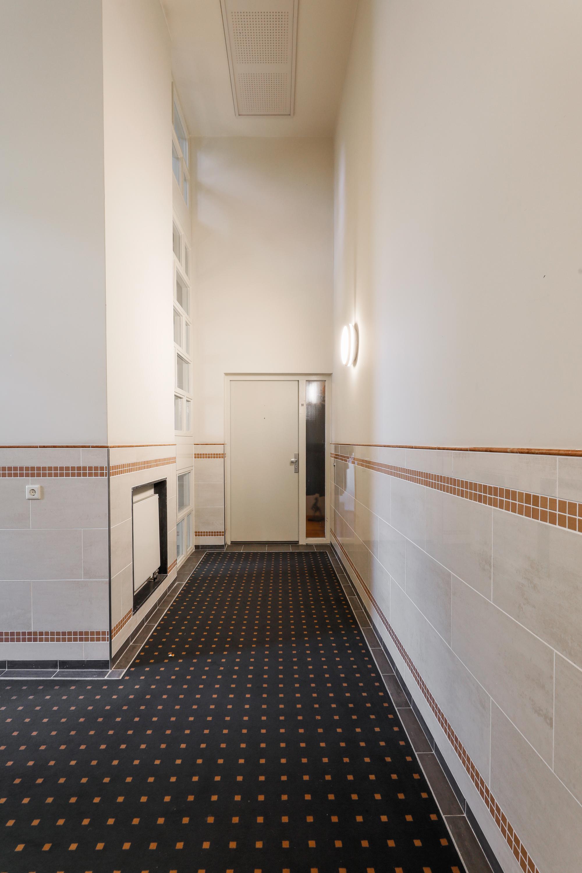 Het is heel bijzonder om, achter de historische gevel, deze moderne woning te vinden. Bij de renovatie / herbouw is dan ook alleen die voorgevel blijven staan. Met de hoge ramen dringt die historie je luxe appartement dan ook nog steeds binnen. Gelukkig maar. Aan de gevel is de plafondhoogte nog steeds ca. 580 cm. Prachtig, en zo valt het licht ook heel diep in je woning. Waar op tekening een loggia was gepland in 2001 is nu een ruimte die het hele jaar door gebruikt kan worden. Dus ook op die zomerse dag als loggia, door de grote hoge ramen open te zetten. Een knusse zit en de keuken treft u aan onder de verdieping.
