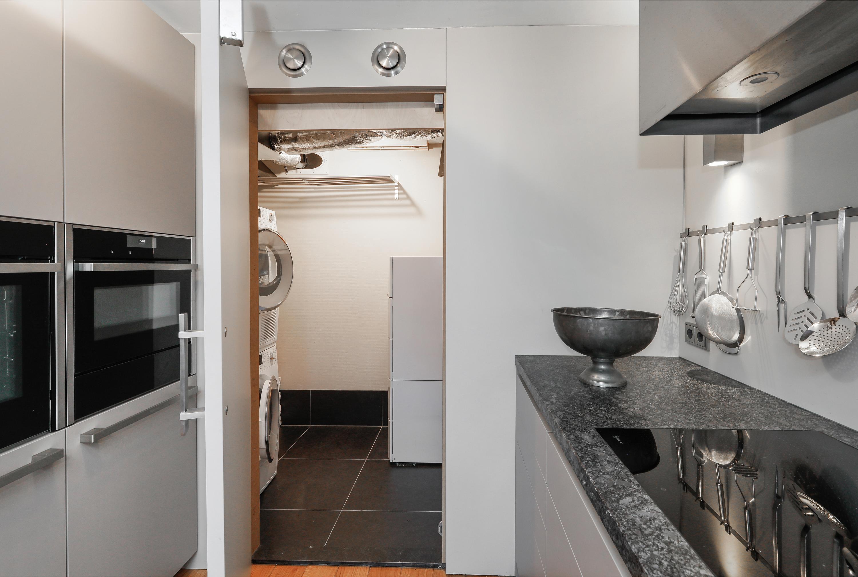Laat u niet misleiden door de ingetogen stijl van deze keuken. Poggenpohl maakte doordachte kwaliteit op maatwerk naar wens van de eigenaar. Deze bijzonder praktische en functionele keuken heeft alles om culinair uit te kunnen pakken. Achter de strakke vormgeving vindt u onder andere een: vaatwasser, koelkast, vriezer, inductiekookplaat, afzuigkap, grill-combioven, bakoven magnetron bordenwarmer en wijnklimaatkast. Er is een ontspiegeld natuurstenen werkblad, goede verlichting en heel veel bergruimte. Nóg meer ruimte is te vinden in de bijkeuken, waarin wasmachineaansluitingen, de cv-ketel/ boiler en waterontharder.
