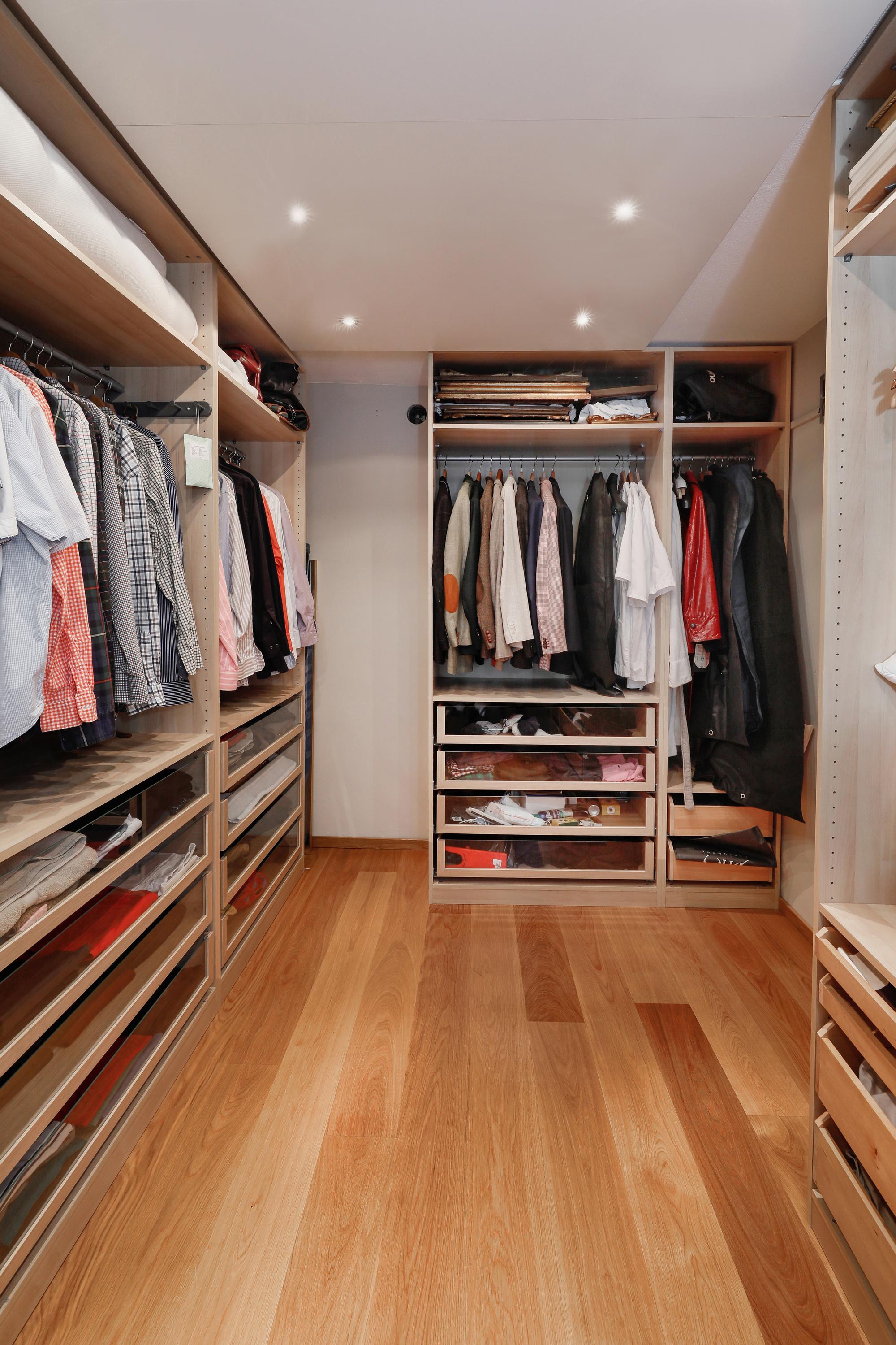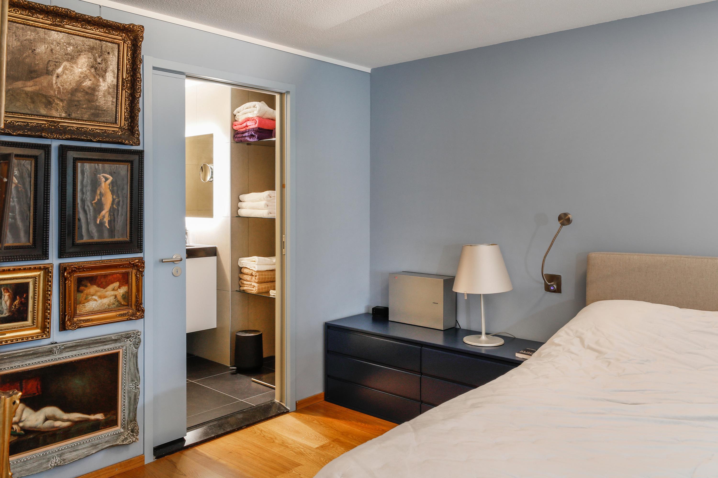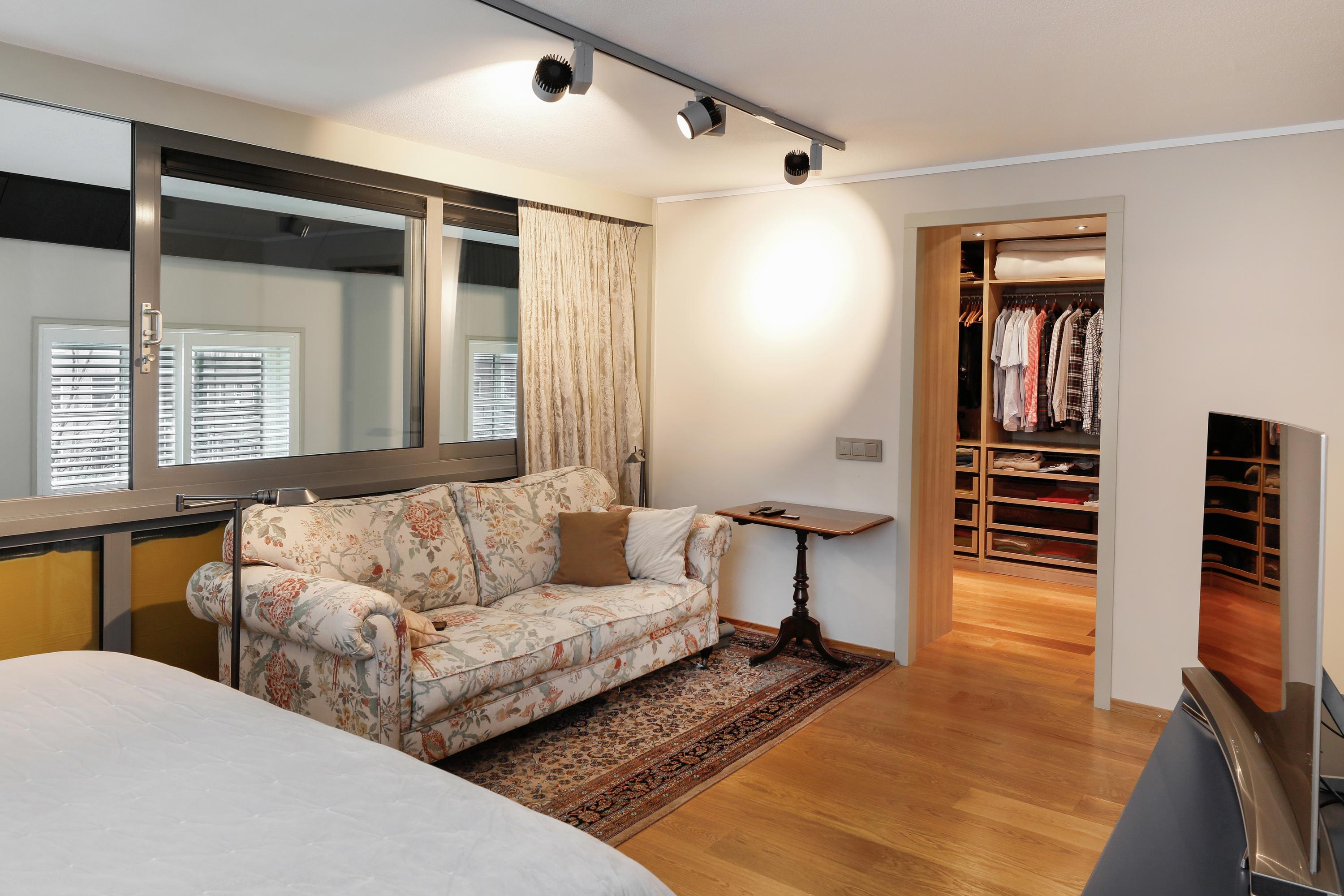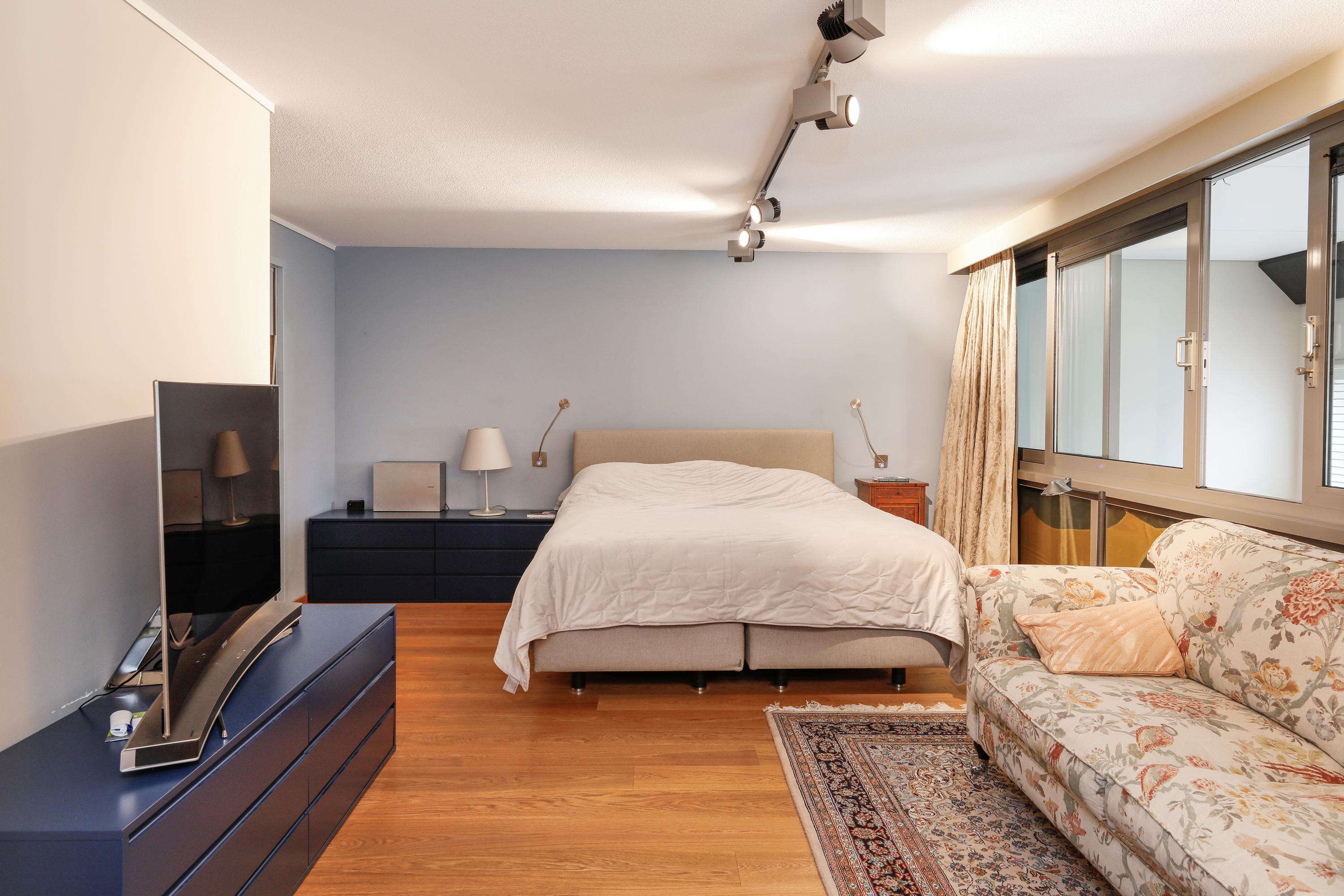 De slaapkamer is zo ingericht dat u hier straks alles direct bij de hand heeft. Natuurlijk is er een fijne grote ruimte voor het bed en de nachtkastjes. Via het schuifraam naar de woonkamer en verder door naar de hoge ramen in de woonkamer kijkt u hier prachtig op de cour. Aan deze slaapkamer ligt en suite de badkamer en de inloop kleedkamer. En dan is er nóg genoeg ruimte voor een bank en TV. De inloop kleedkamer is ontstaan uit een oorspronkelijk geplande vide .Een gewonnen en heel dankbare ruimte. De kleedkamer is volledig ingericht om al uw kleding geordend en praktisch op te kunnen bergen.