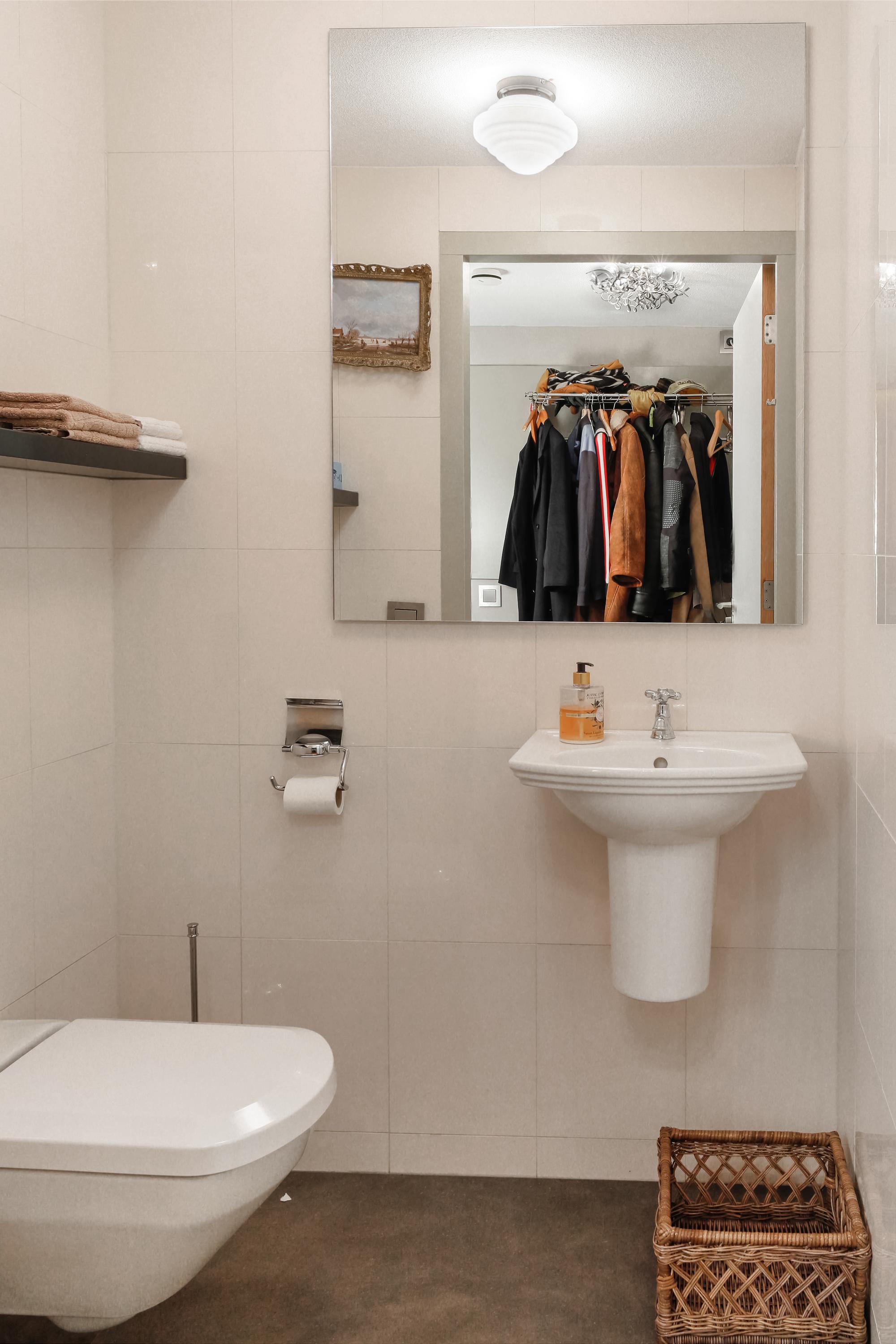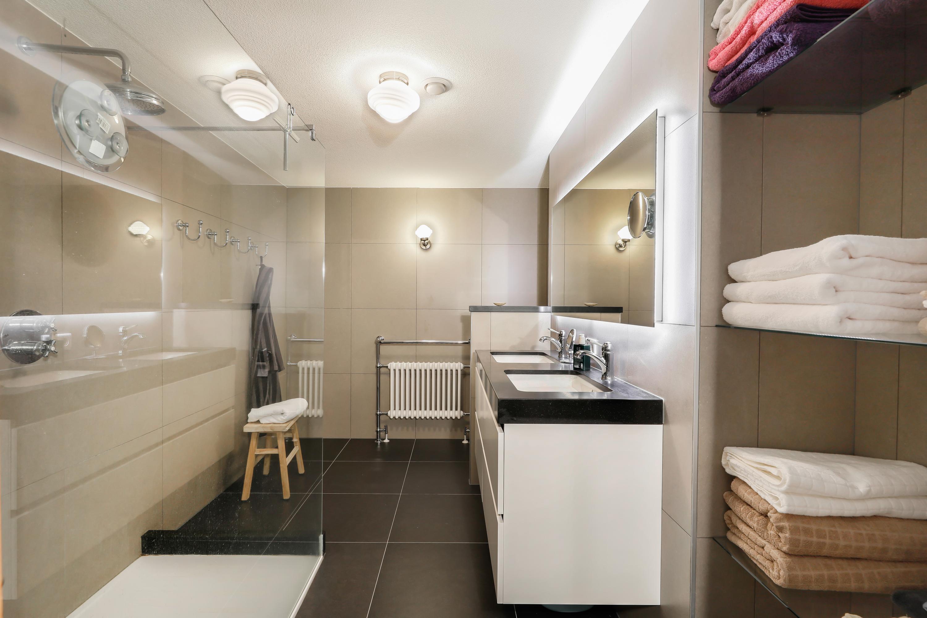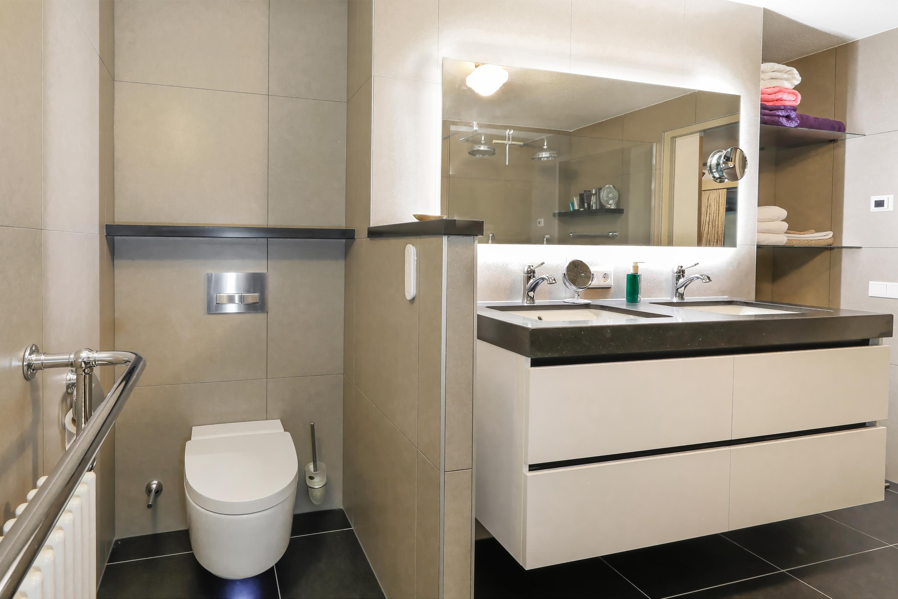 Met zachte tinten, grote tegels en een goede indeling is hier in 2018 een dubbele inloop douche gerealiseerd waar u veel plezier van zult hebben. Op de vloer liggen stroeve tegels met vloerverwarming. Het Geberit Mera aquaclean toilet is, gezien privacy, achter een laag wandje geplaatst. Er is een dubbele douche en een iets verhoogd wastafelmeubel met twee wasbakken en verwarmde spiegel. Handdoeken en ander badkamergerei kunt u praktisch opbergen in kastjes en op open glazen schappen.