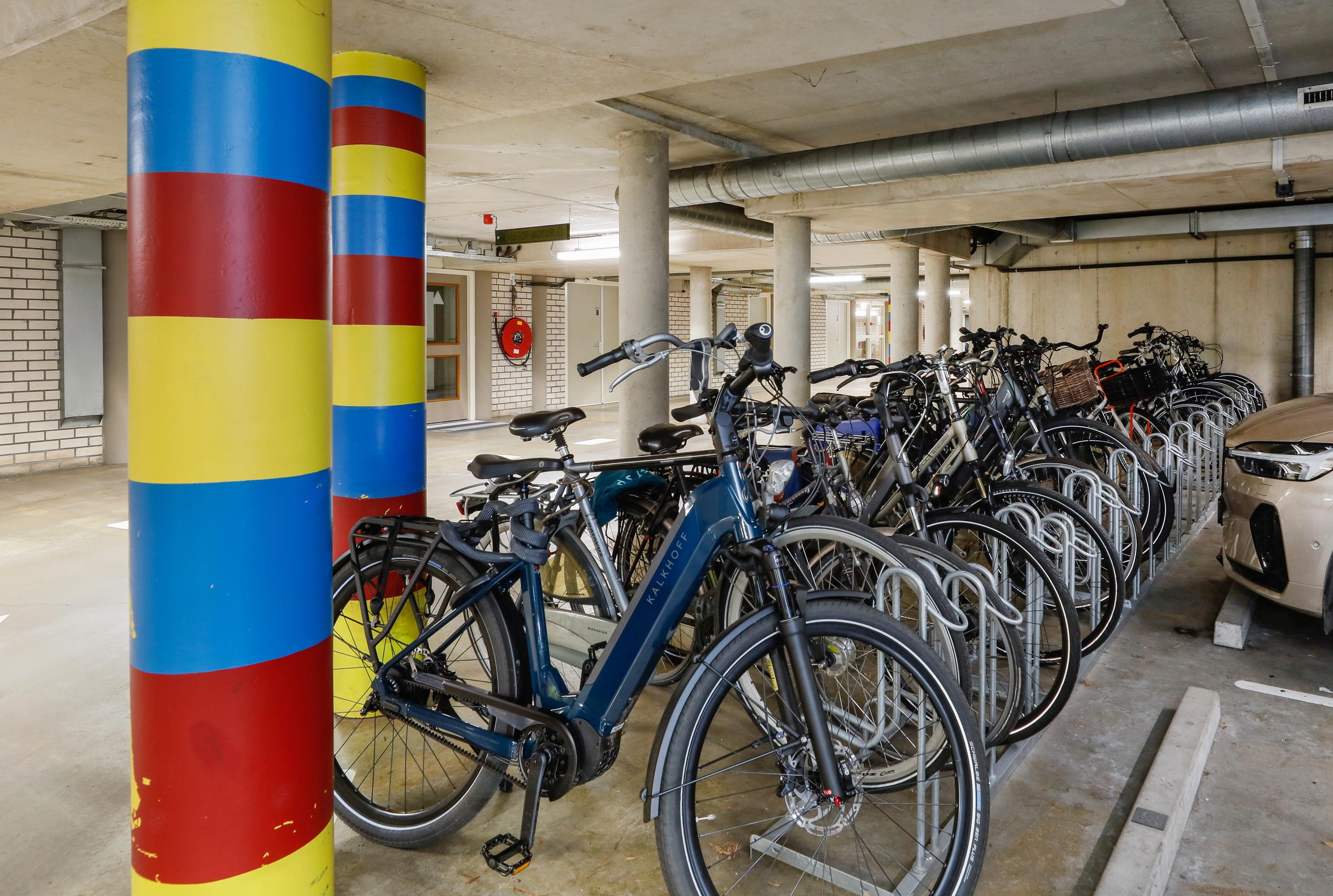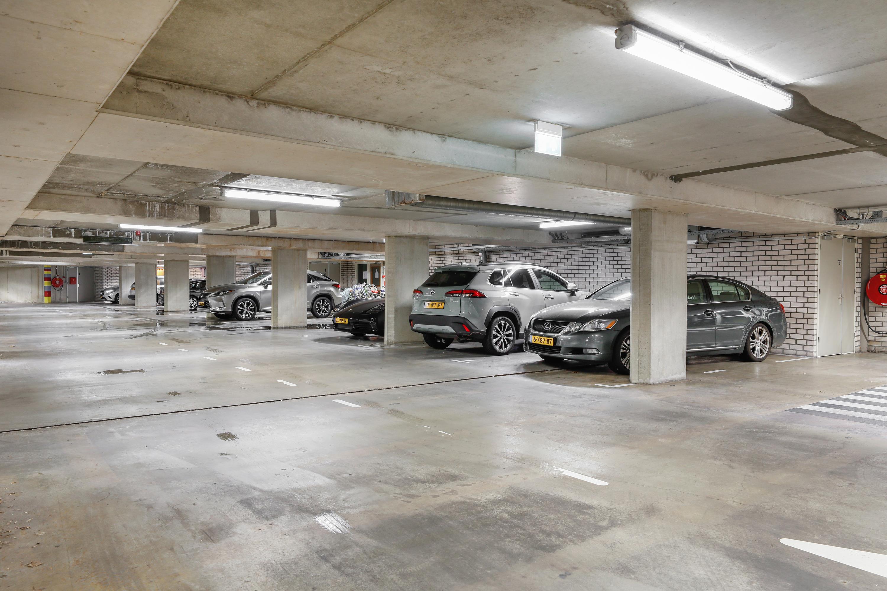 In de parkeergarage treft u de eigen gemarkeerde parkeerplaats aan. Ruiten krabben is verleden tijd. Wellicht is het zelfs nu eindelijk tijd voor die cabrio. De mogelijkheid bestaat naast uw parkeerplaats een oplaadpunt voor een elektrische auto aan te laten leggen. De infrastructuur is reeds aanwezig. In de kelder vindt u naast de lift, de berging en de huisvuil afvoercontainer. Met sensor verlichting zodat u uw handen vrij kunt houden. De huidige eigenaar stalt hier zijn elektrische oplaadbare fietsen. Uw fiets mag ook in de gezamenlijke rekken in de parkeergarage nabij het trappenhuis en lift.
