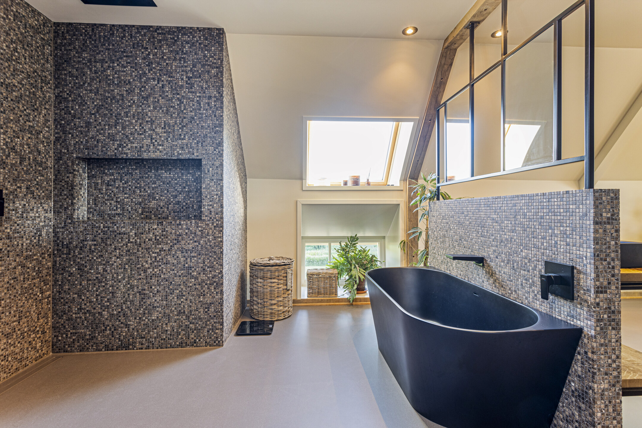 De deel, waar vroeger de koeien lekker stonden te herkauwen, is omgetoverd tot een supergave ruimte; de spanten en het dikke rietpakket (er zit nog isolatiemateriaal tussen) zijn in het zicht gelaten en de ruimte is lekker licht door de dakramen. De betonvloer – gereed voor het aanbrengen van vloerverwarming –, de schitterende leemkachel en de trap (smederij Oldenhave uit Vorden) geven het een rauw, industrieel randje. Beneden zijn er twee separate WC’s aangelegd. Boven wordt de biljartkamer gerealiseerd.