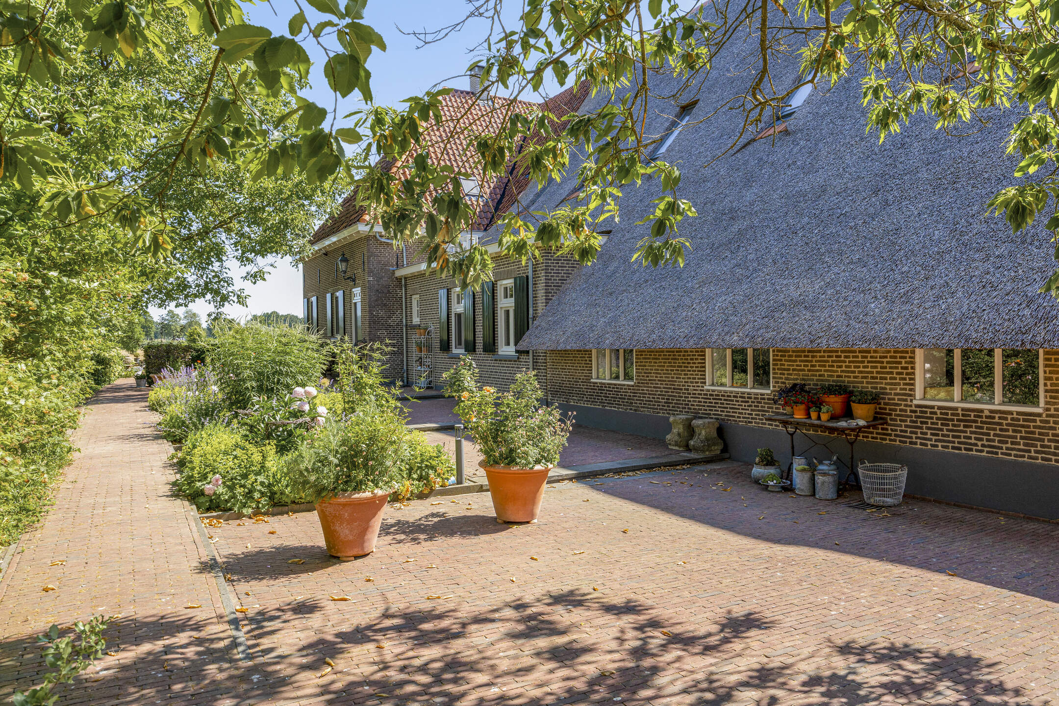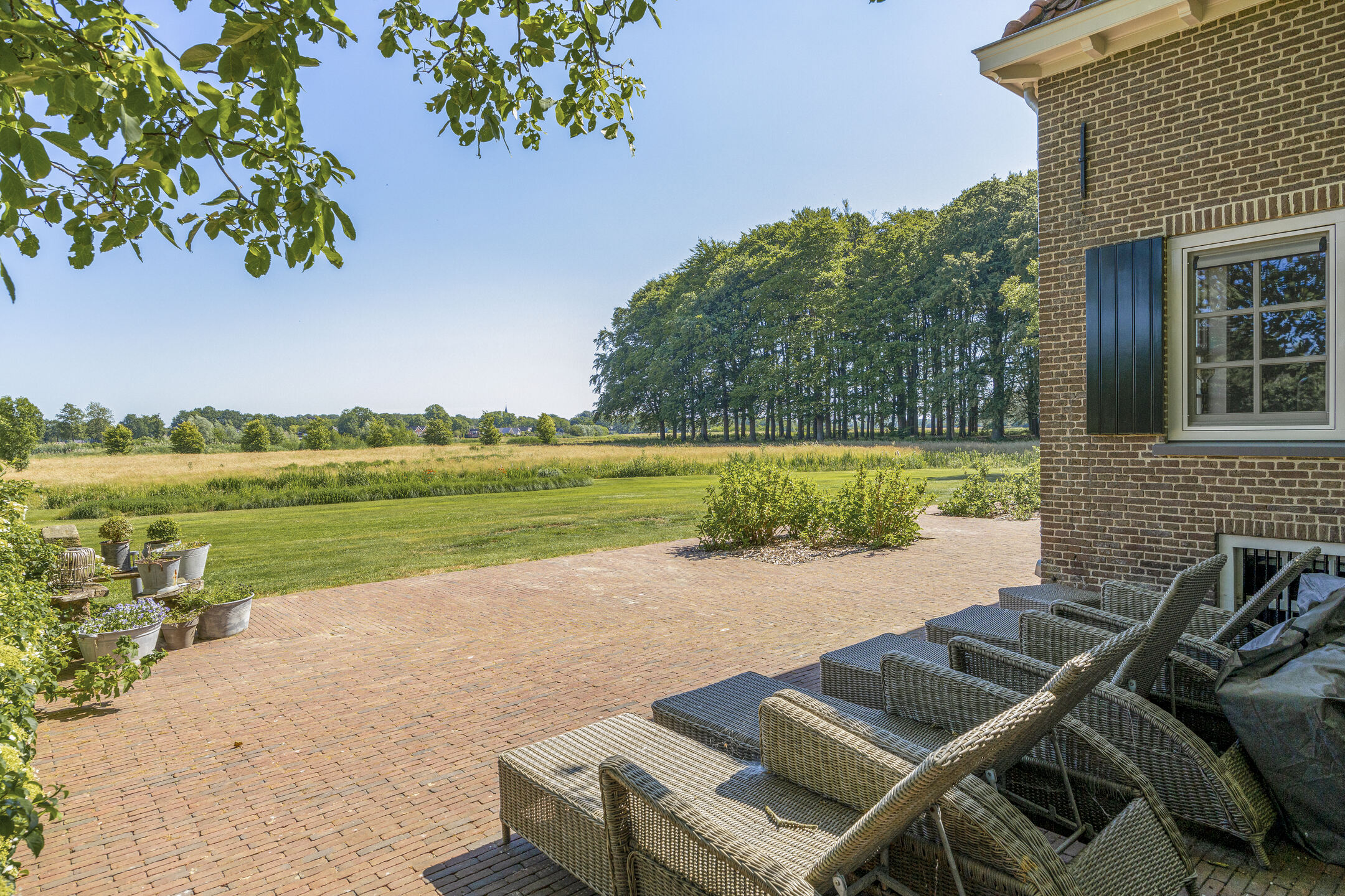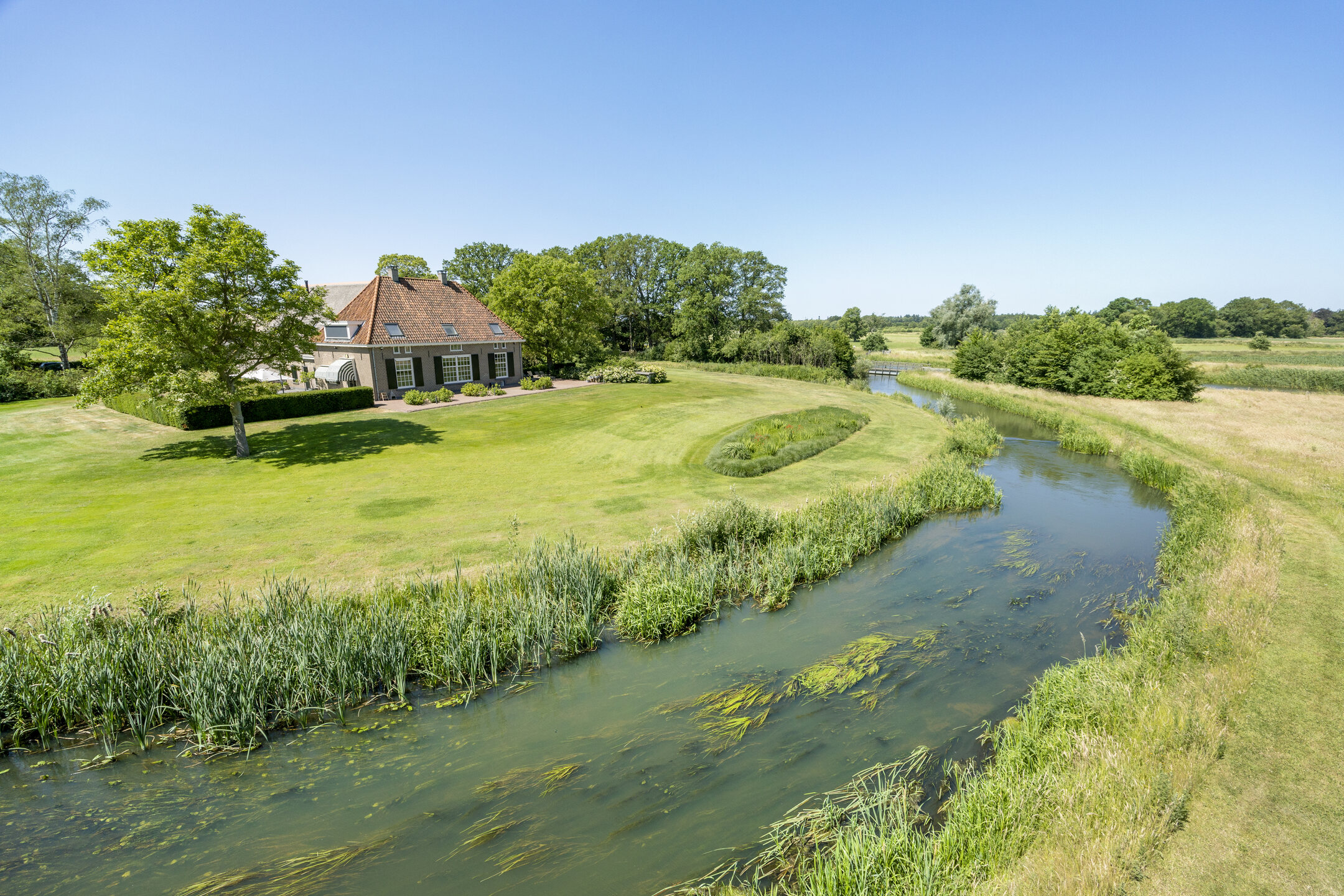 Wanneer een bureau als Eelerwoude zich met de groeninrichting bemoeit, dan weet je gewoon zeker dat het goedkomt. En zo geschiedde. De tuinen rondom het huis worden weer omzoomd door de gracht, waar het glasheldere water van de Berkel vrolijk doorheen klatert. Vanuit het huis is het wonen gericht op de Berkel en het dorpje verderop. Aan de rechterzijde heeft u uitzicht op het beukenbos, waar u via het bruggetje naartoe kunt om een wandeling te maken; tussen de bomen ligt een pad.