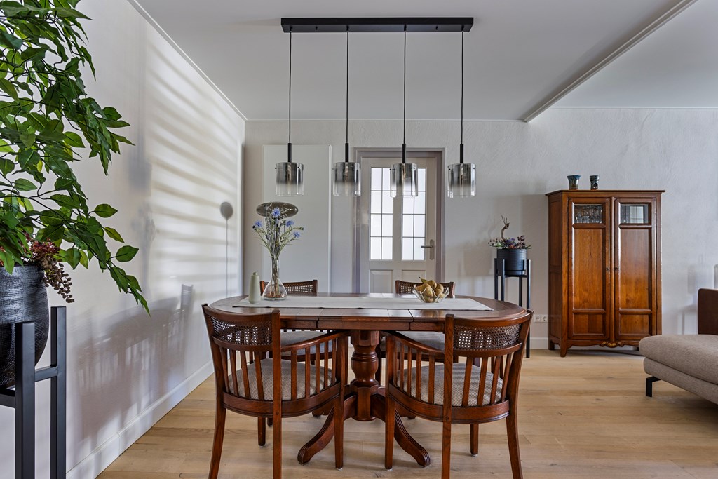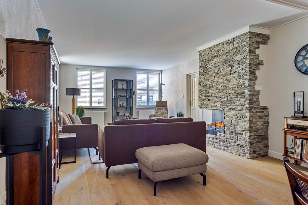 De woonkamer aan de voorzijde van de woning heeft een open indeling, wordt van veel daglicht voorzien en biedt veel mogelijkheden om een ruime zit- en eethoek te creeren. De karakteristieke elektrische haard maakt de kamer sfeervol.