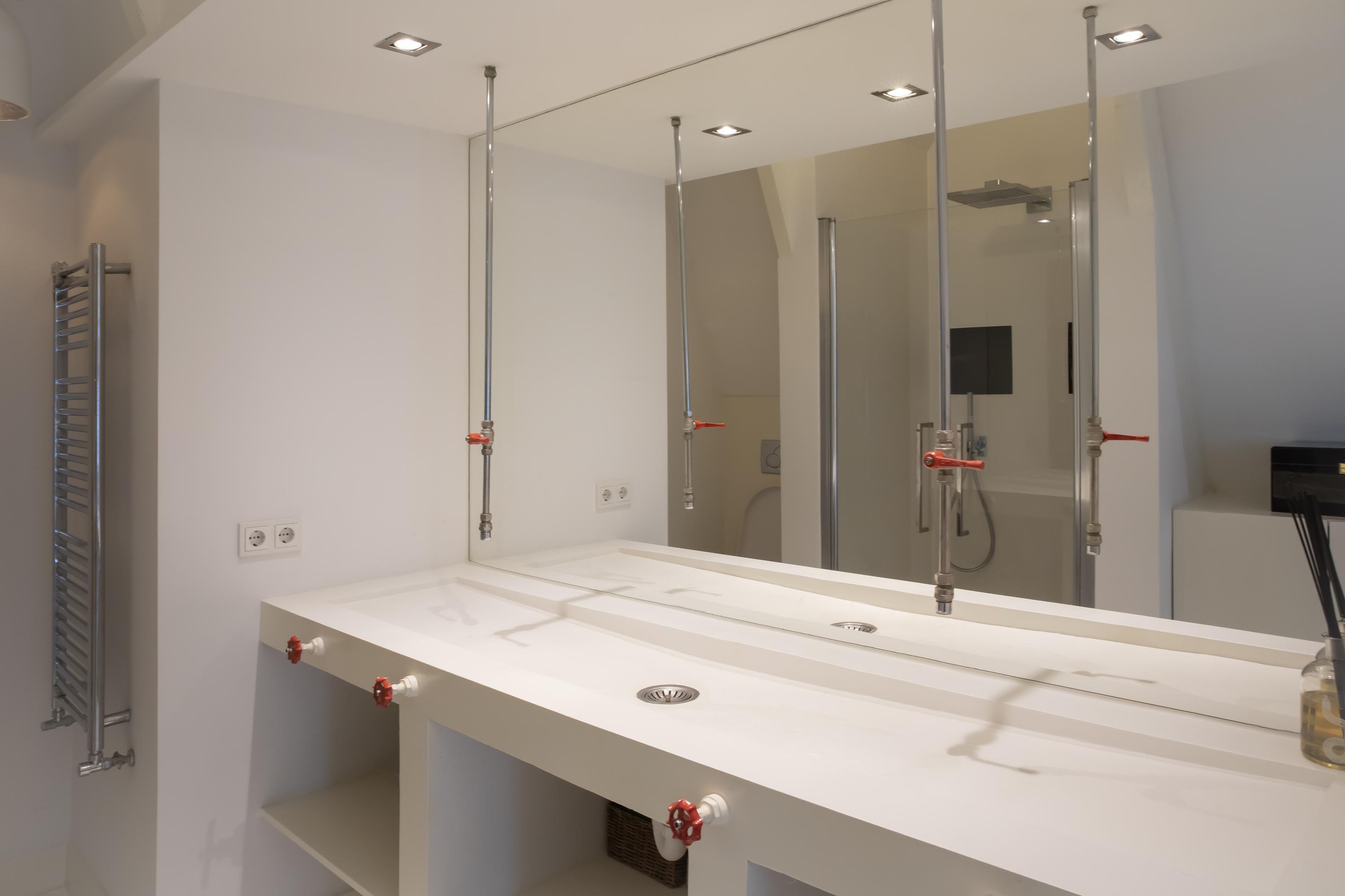 Op de bovenste verdieping vindt u de royale master bedroom, voorzien van een stijlvol bedmeubel met geïntegreerde verlichting, een vrijstaand bad, een airco-installatie en een karakteristieke balkenconstructie. En-suite ligt de moderne badkamer met industriële details, uitgerust met een dubbele wastafel met meubel, inloopdouche en toilet. Via de ruime hal bereikt u de tweede, goed bemeten slaapkamer, eveneens met een eigen badkamer voorzien van een wastafelmeubel en inloopdouche. Tegenover deze slaapkamer bevindt zich een separate wasruimte.