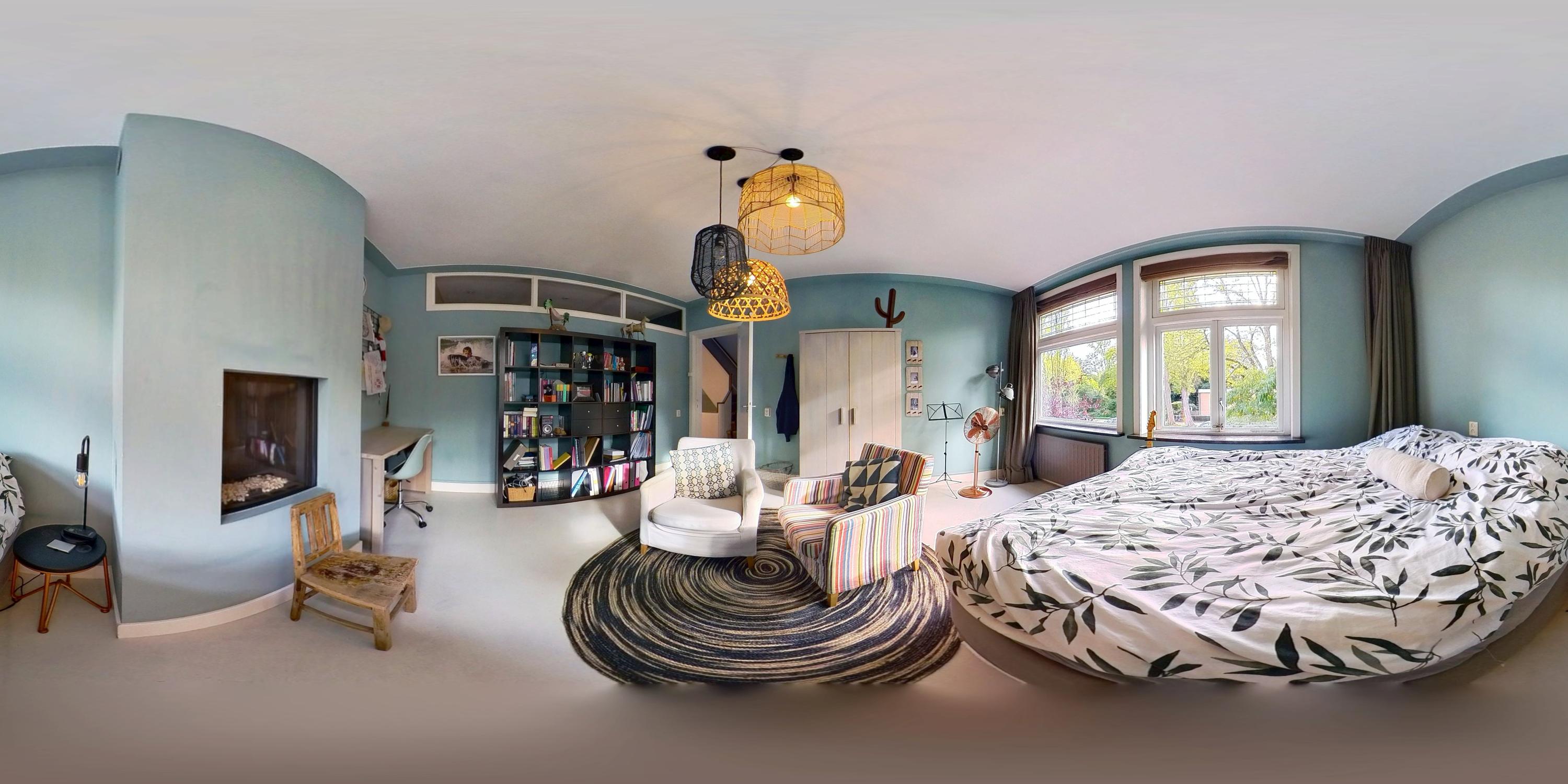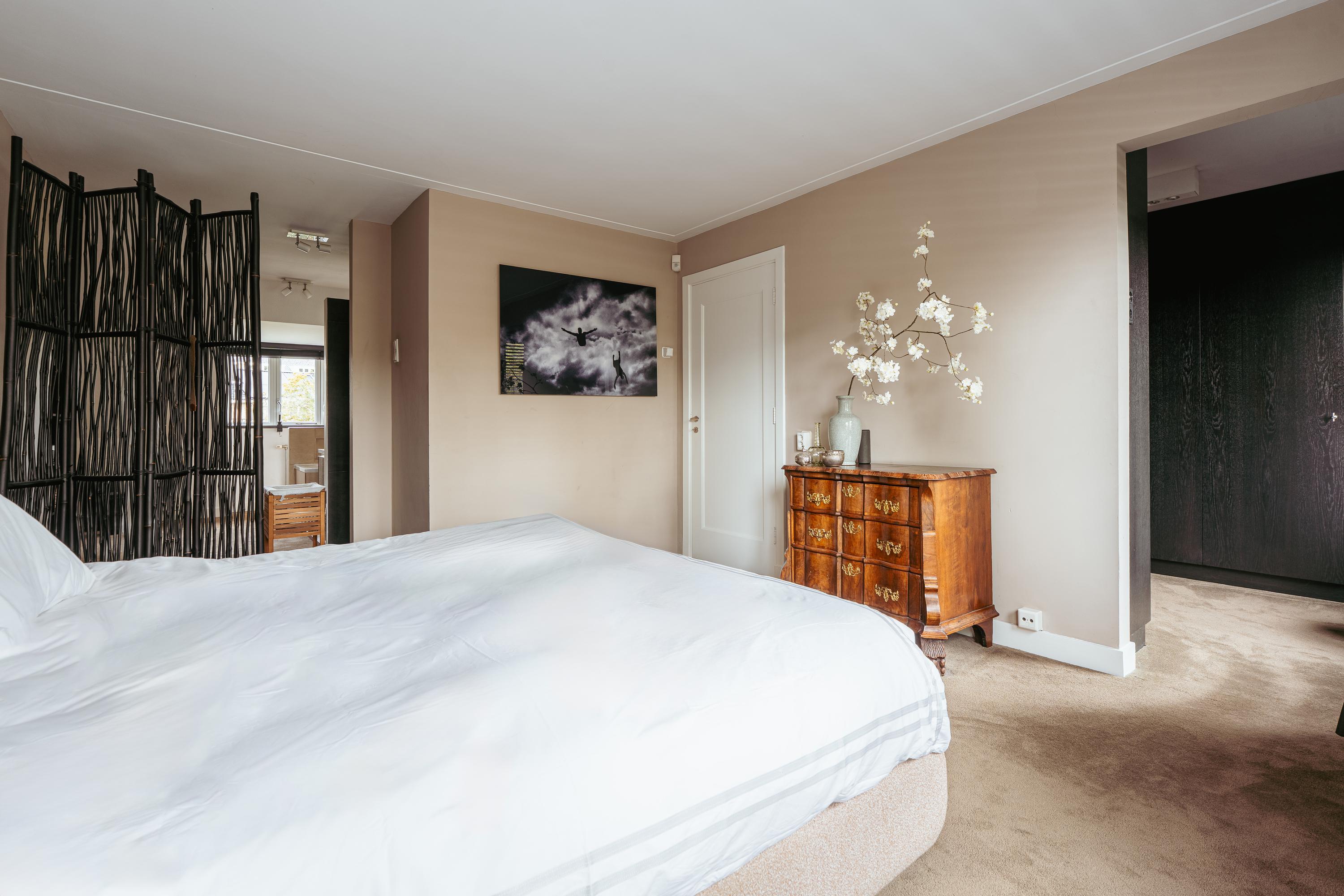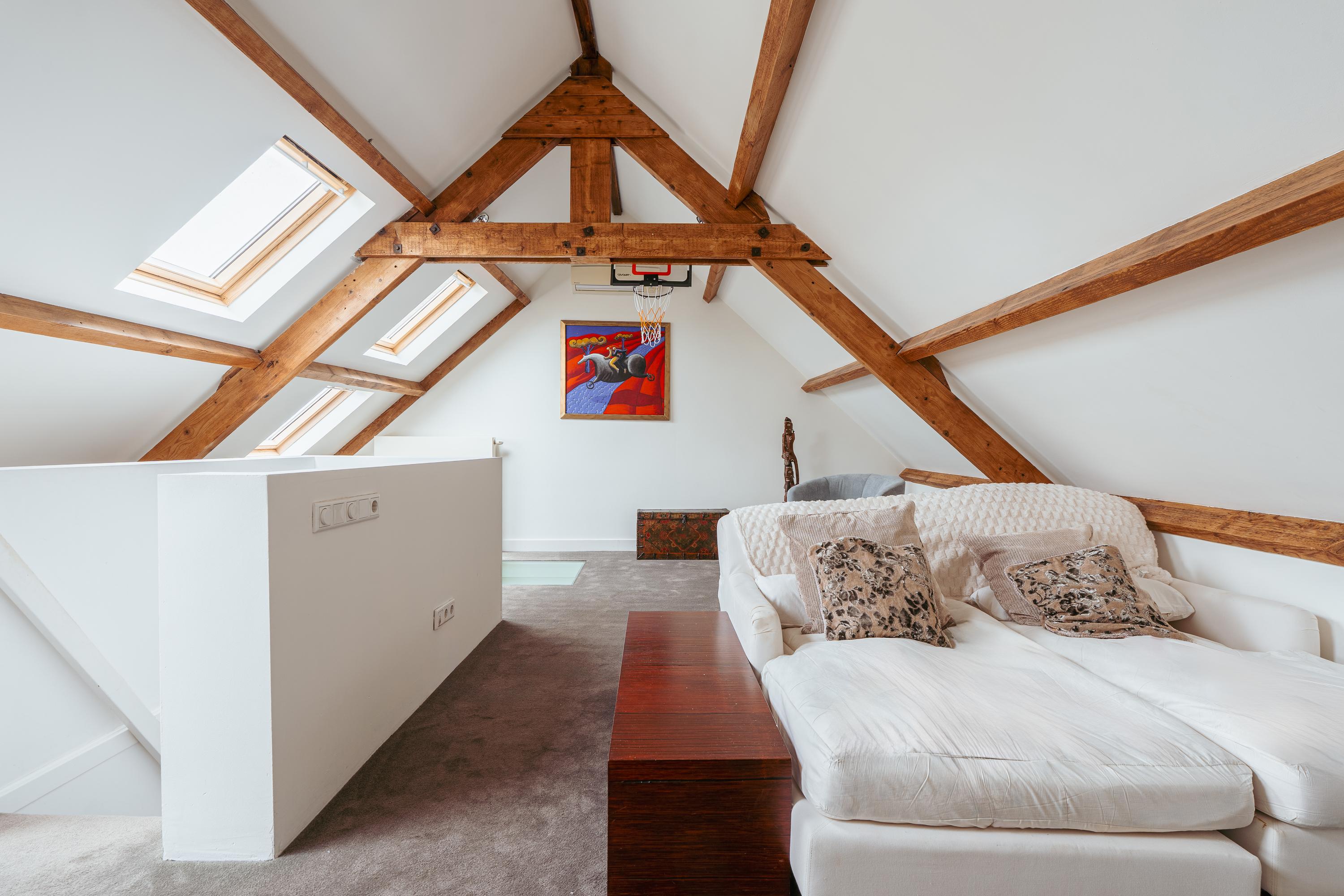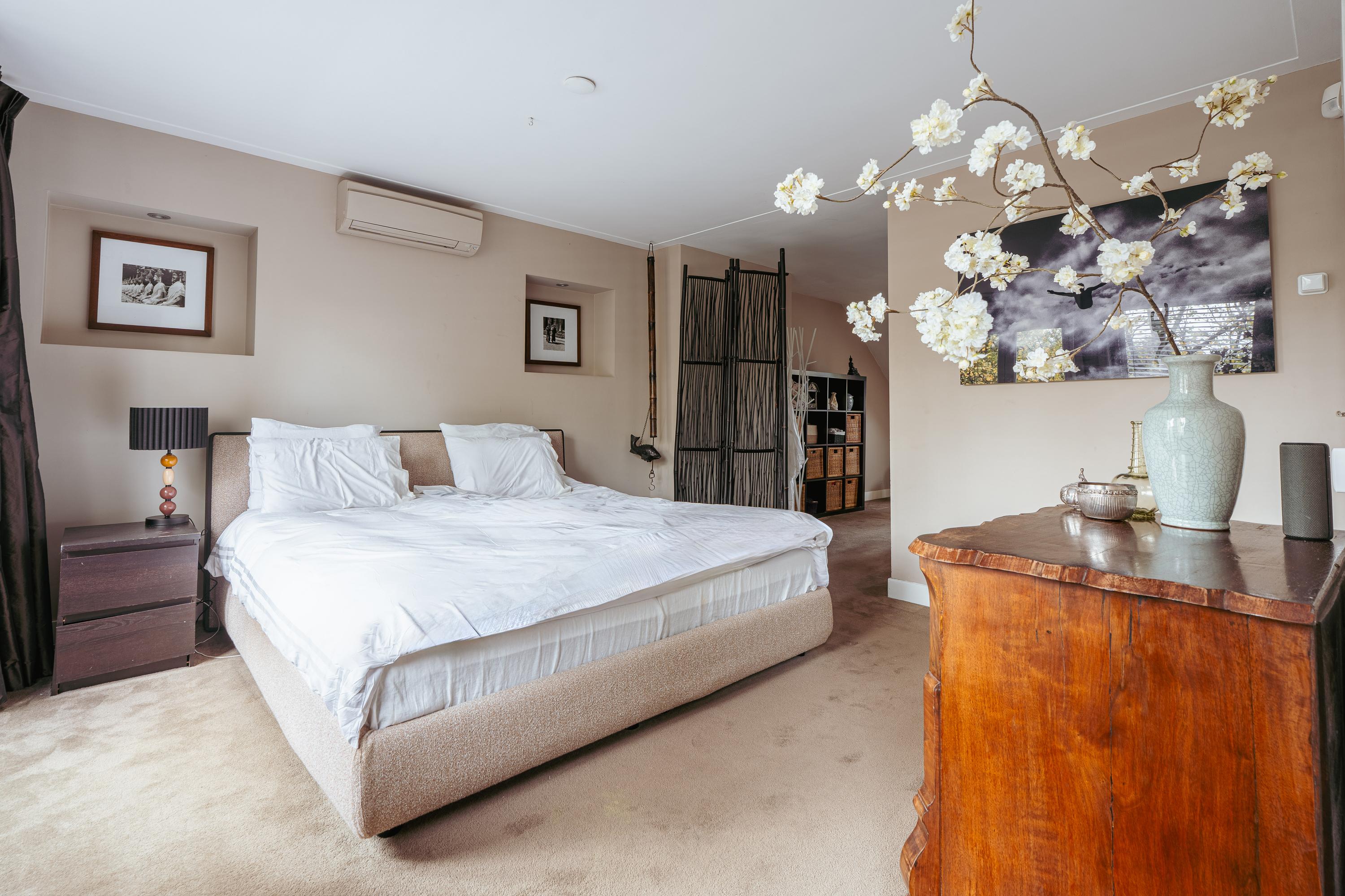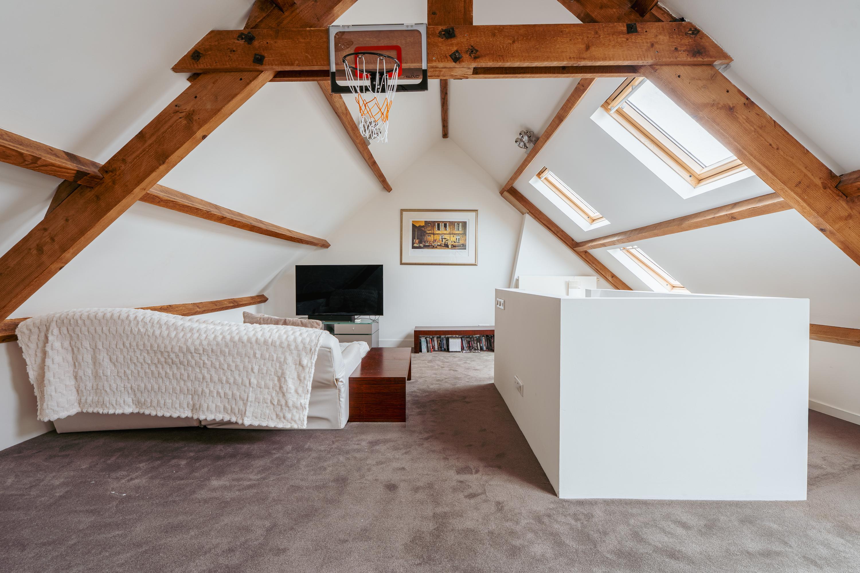 De bovenste verdieping herbergt een royale slaapkamer met een indrukwekkende nokhoogte, waardoor de ruimte bijzonder licht en ruimtelijk aanvoelt. Deze verdieping leent zich ook uitstekend als werkkamer, logeerruimte of studio.