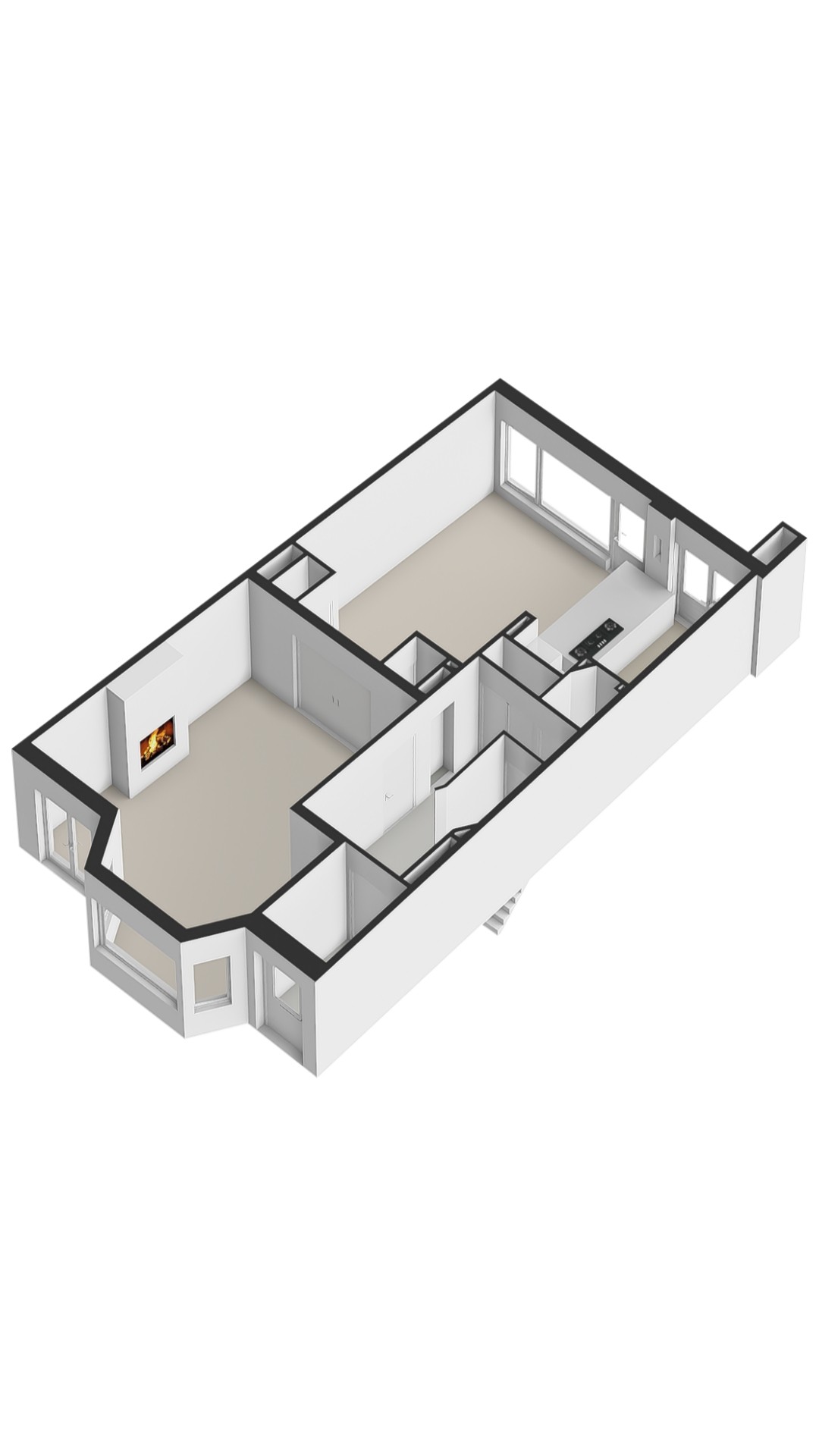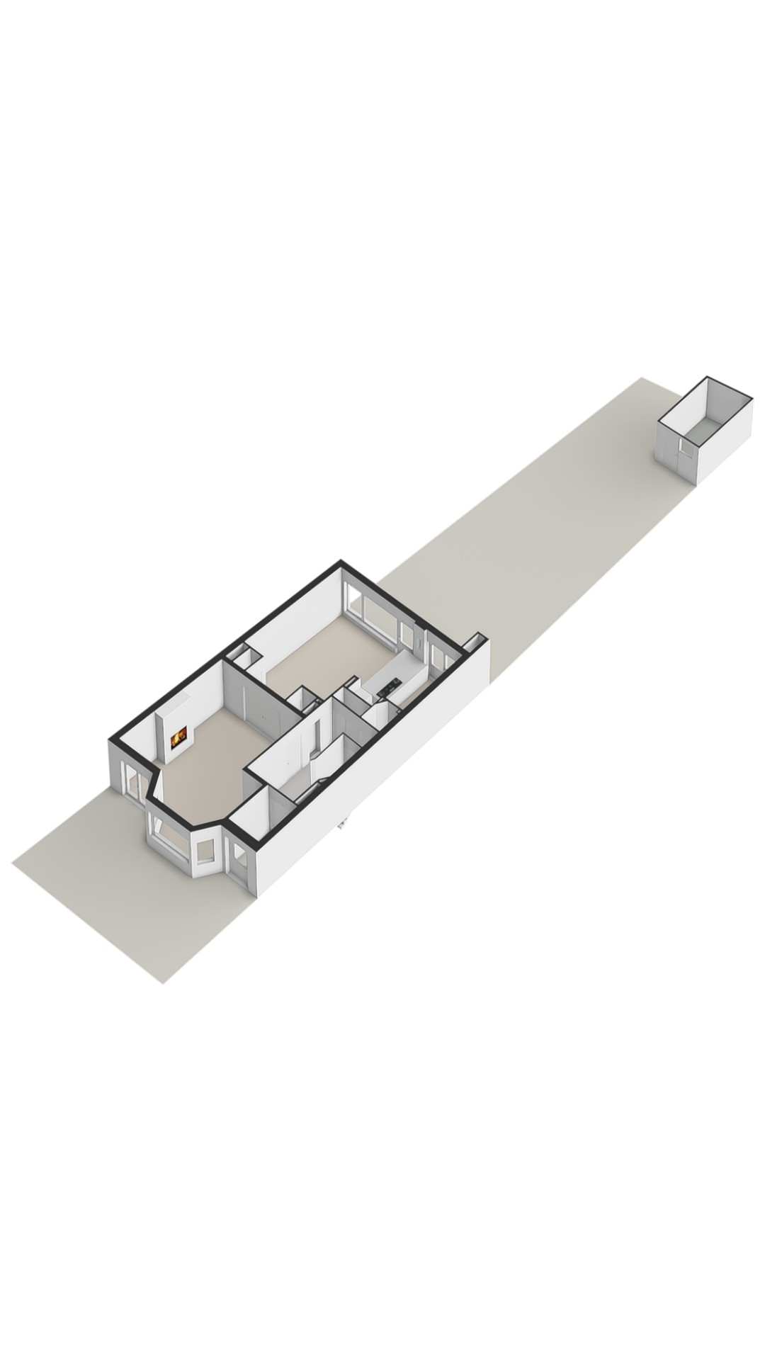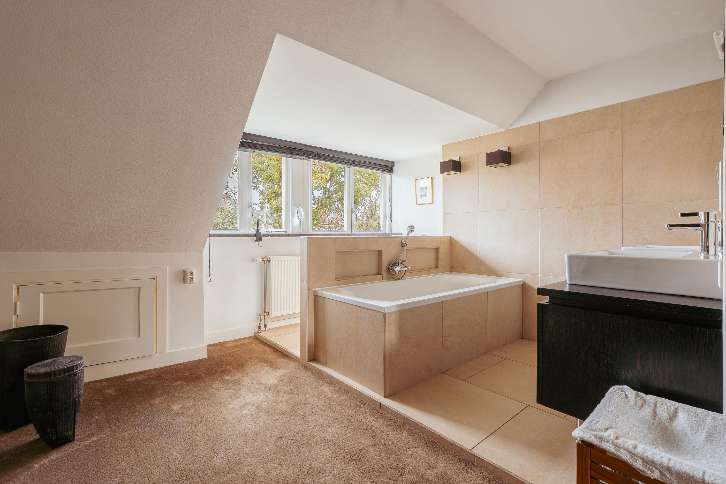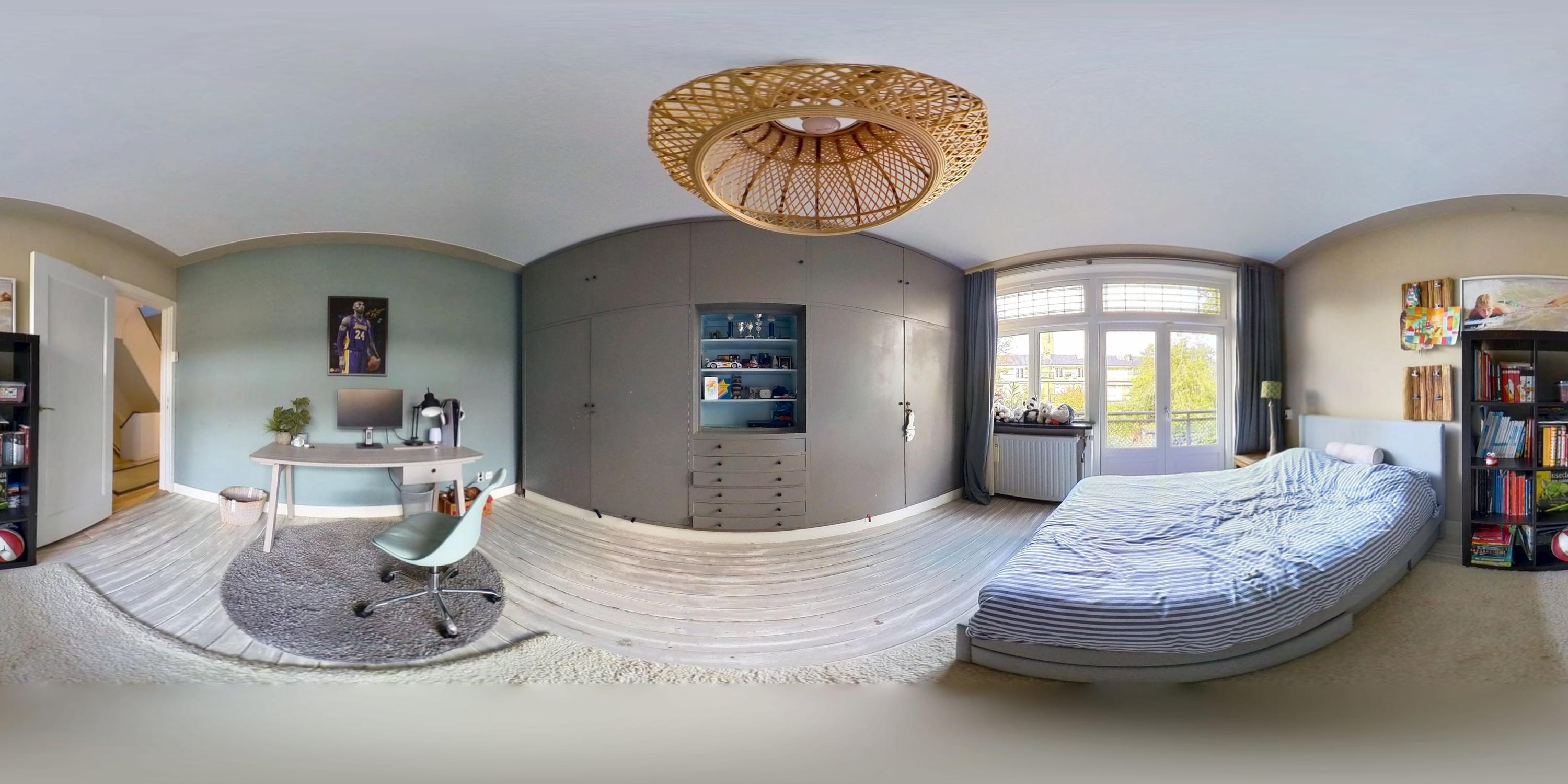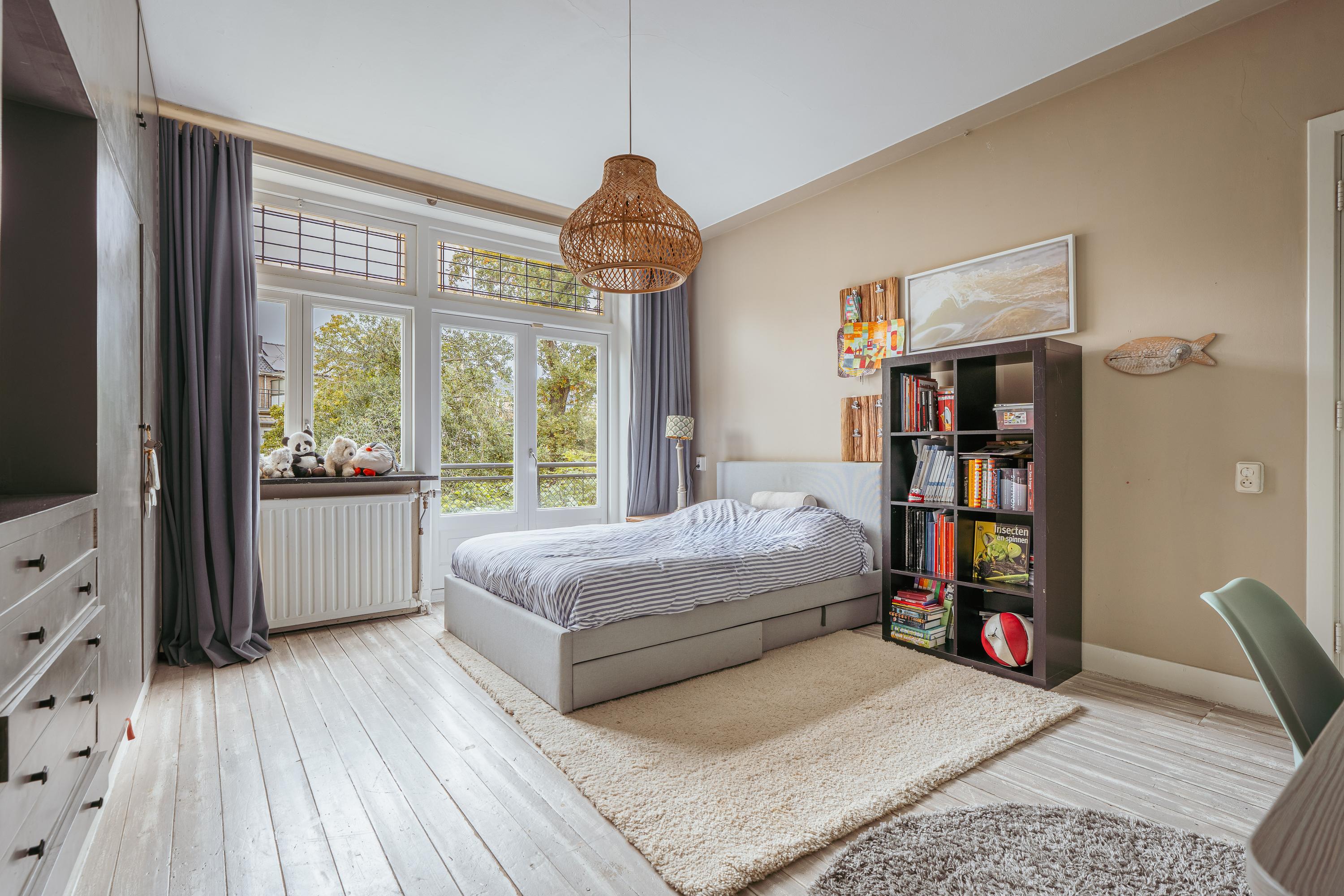 De bovenste verdieping herbergt een royale slaapkamer met een indrukwekkende nokhoogte, waardoor de ruimte bijzonder licht en ruimtelijk aanvoelt. Deze verdieping leent zich ook uitstekend als werkkamer, logeerruimte of studio.