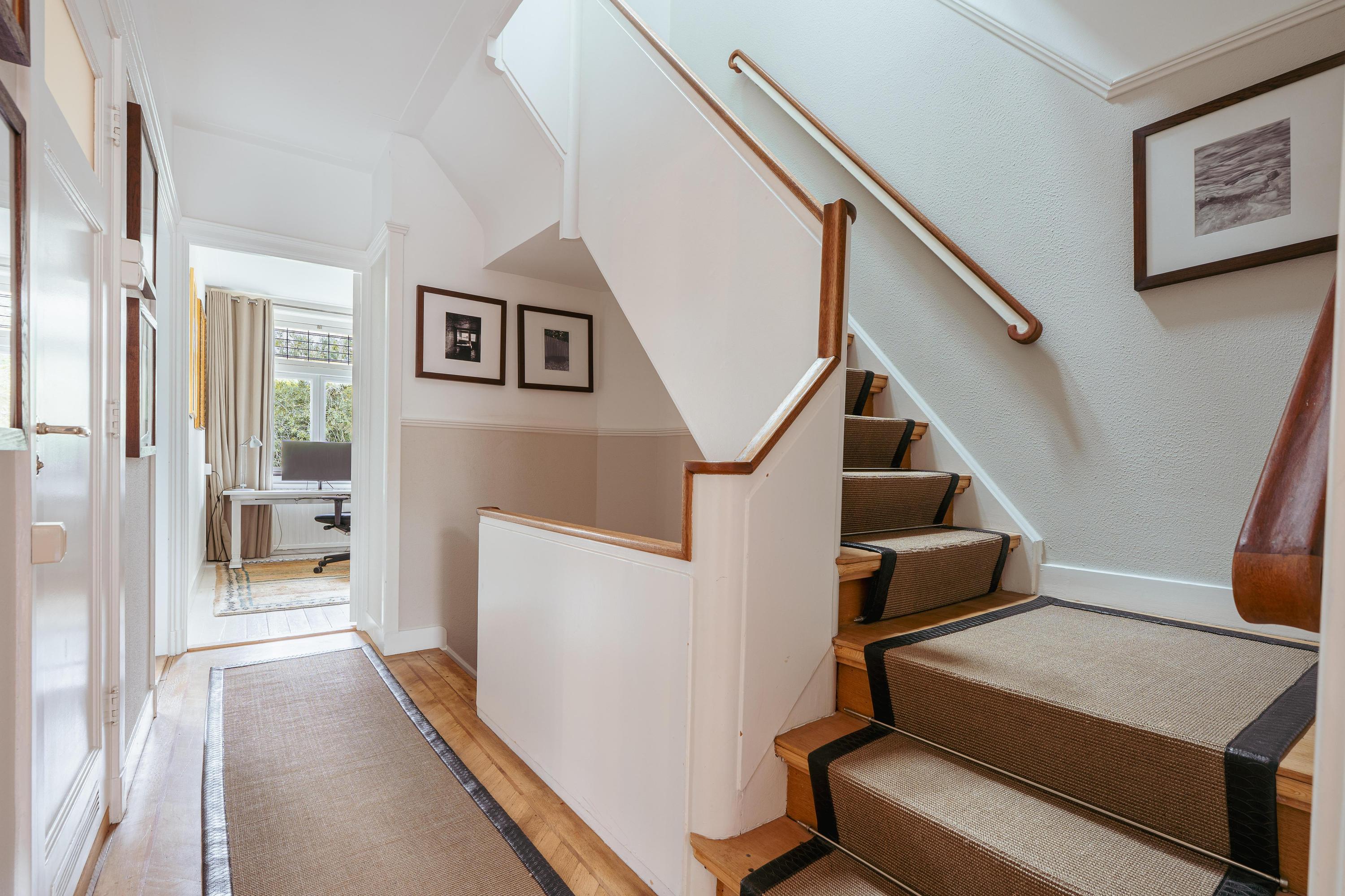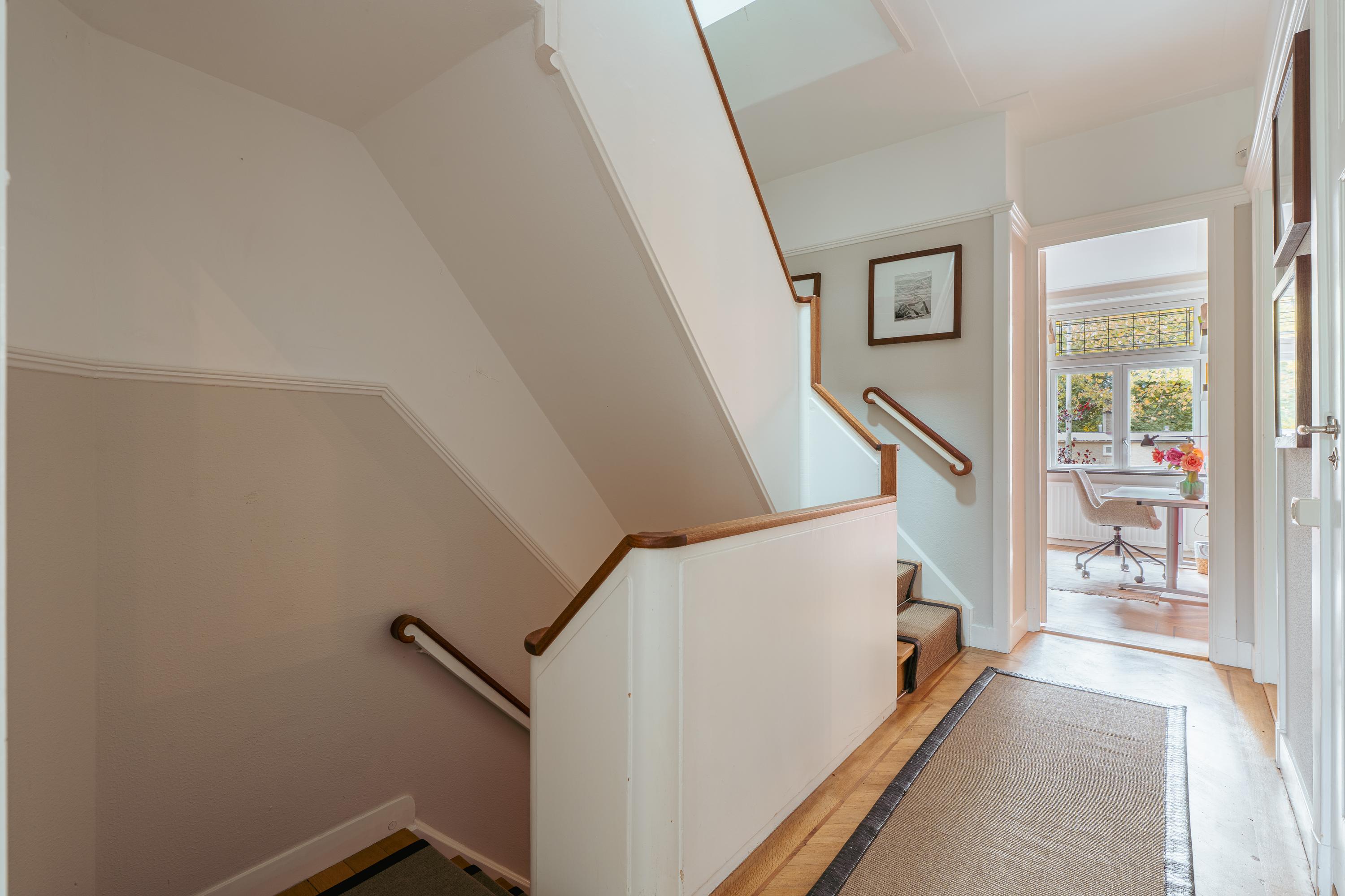 Overloop met toegang tot vier goed bemeten slaapkamers, waarvan de grootste aan de achterzijde is gelegen en beschikt over vaste kasten en toegang tot het balkon. De overige drie kamers zijn perfect als slaap-, kinder- of werkkamer. Centraal op deze verdieping bevindt zich de badkamer, voorzien van ligbad met douche, dubbele wastafel en toilet.