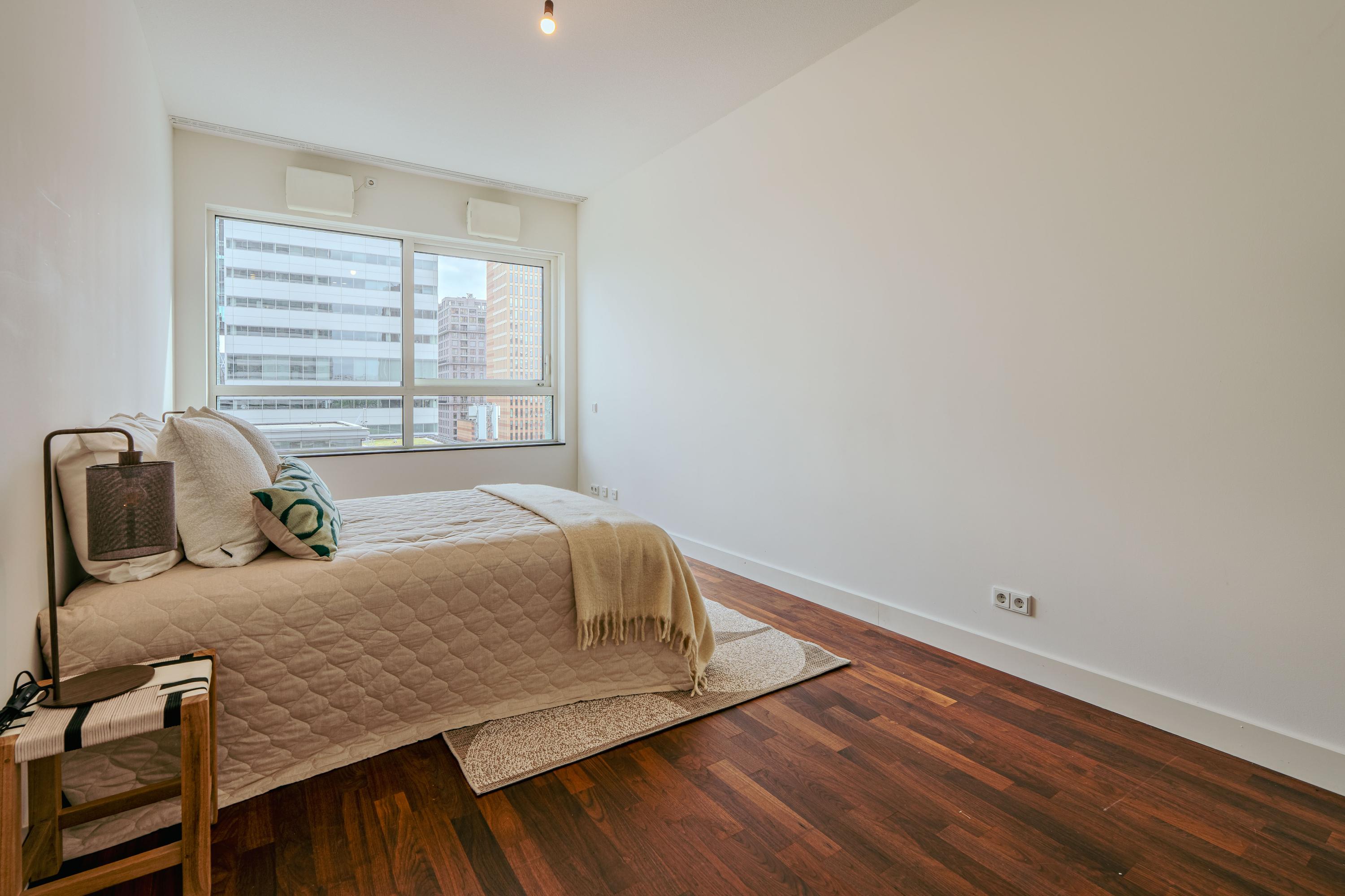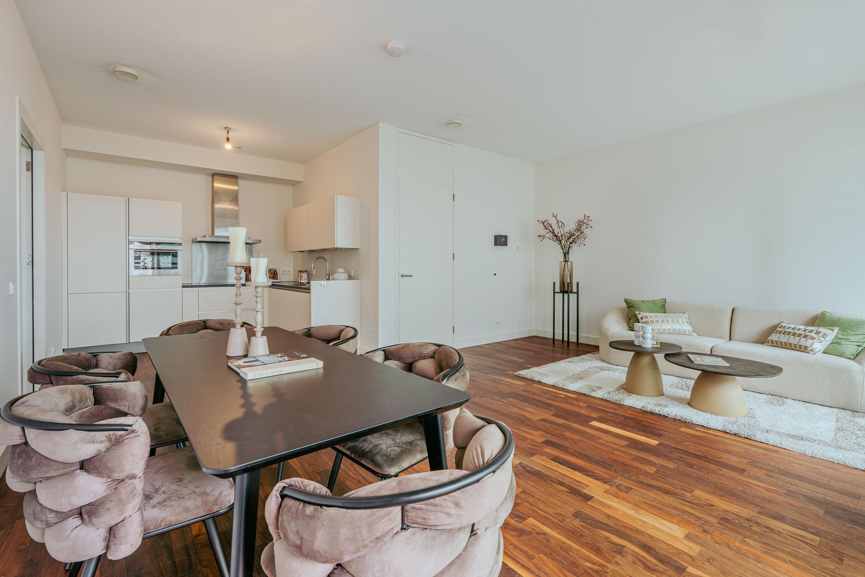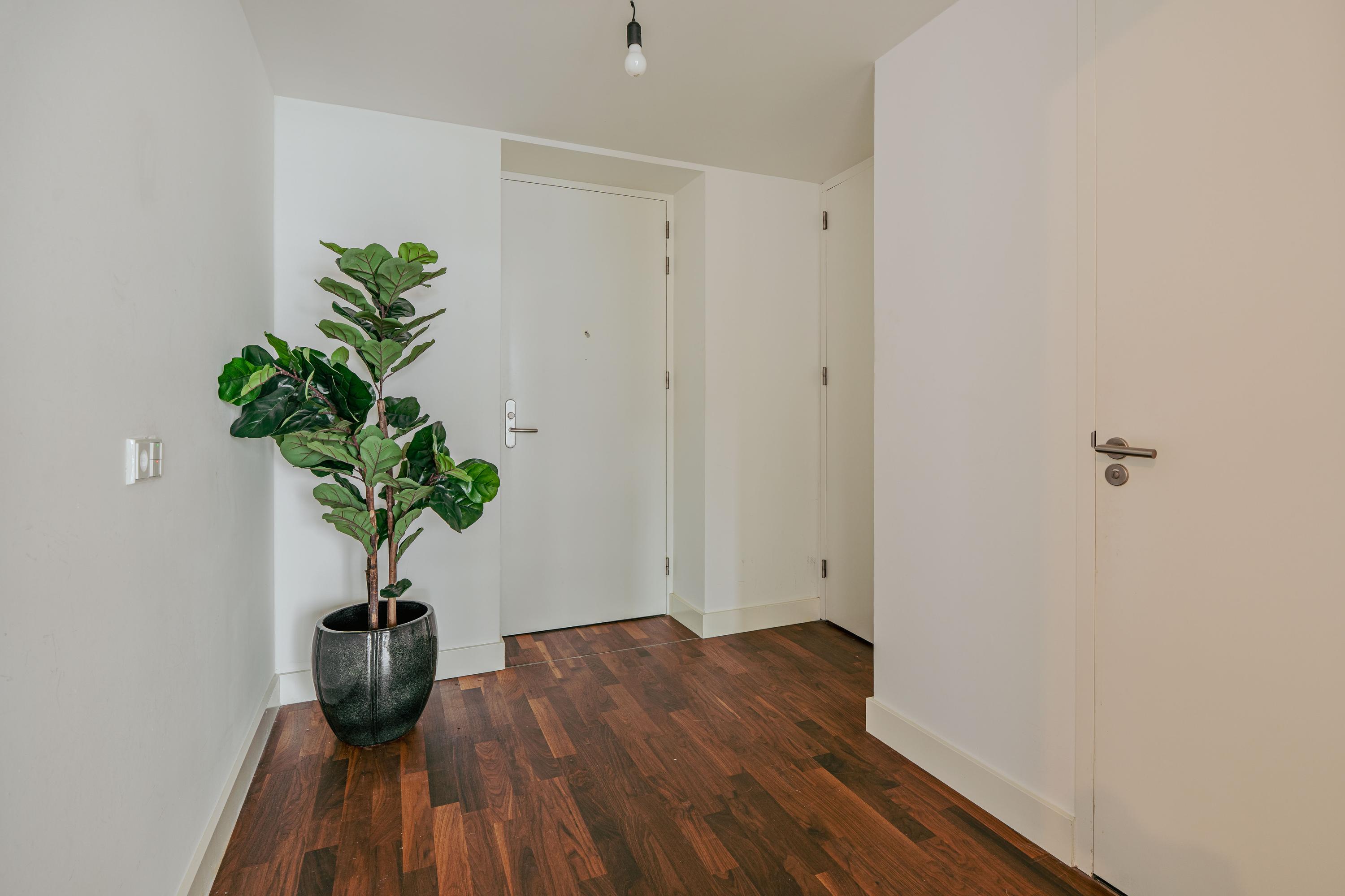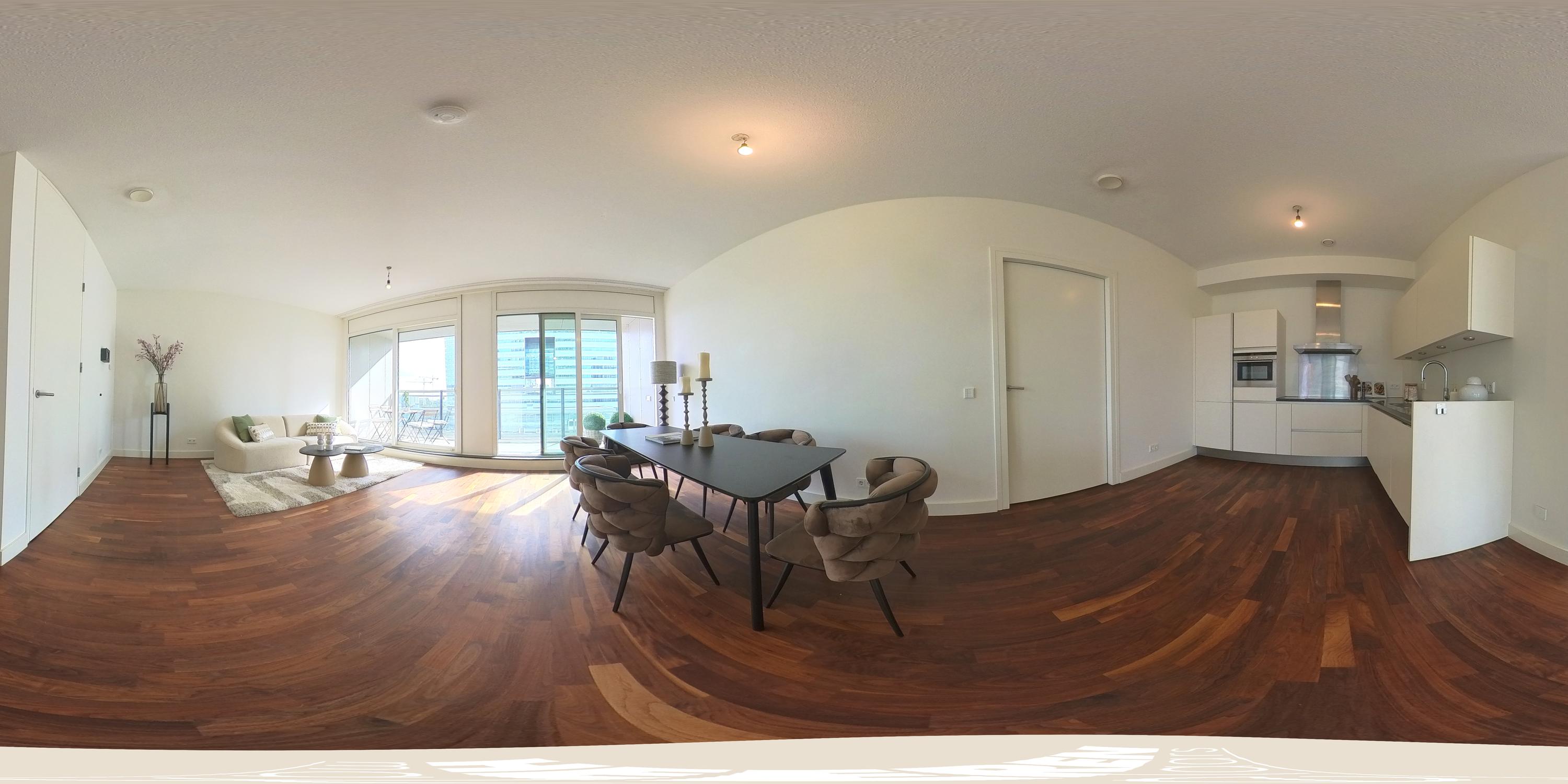 Bij binnenkomst op de 8e verdieping betreedt u een ruime hal met de meterkast, een separaat toilet en ruimte voor een garderobe. Vanuit hier loopt u het ruime woon/leefgedeelte in, waar u niet ontkomt aan het uitzicht wat de ruimte open doet aanvoelen. Middels een schuifpui aan de voorzijde heeft u toegang tot het ruime balkon dat zich over de gehele breedte van het appartement strekt. Een ideale plek om te ontspannen, te genieten van u ontbijt of het uitzicht. De open keuken is gelegen aan de achterzijde en is voorzien van moderne inbouwapparatuur, waaronder een koelkast, vriezer, inductiekookplaat, Quooker en vaatwasser.