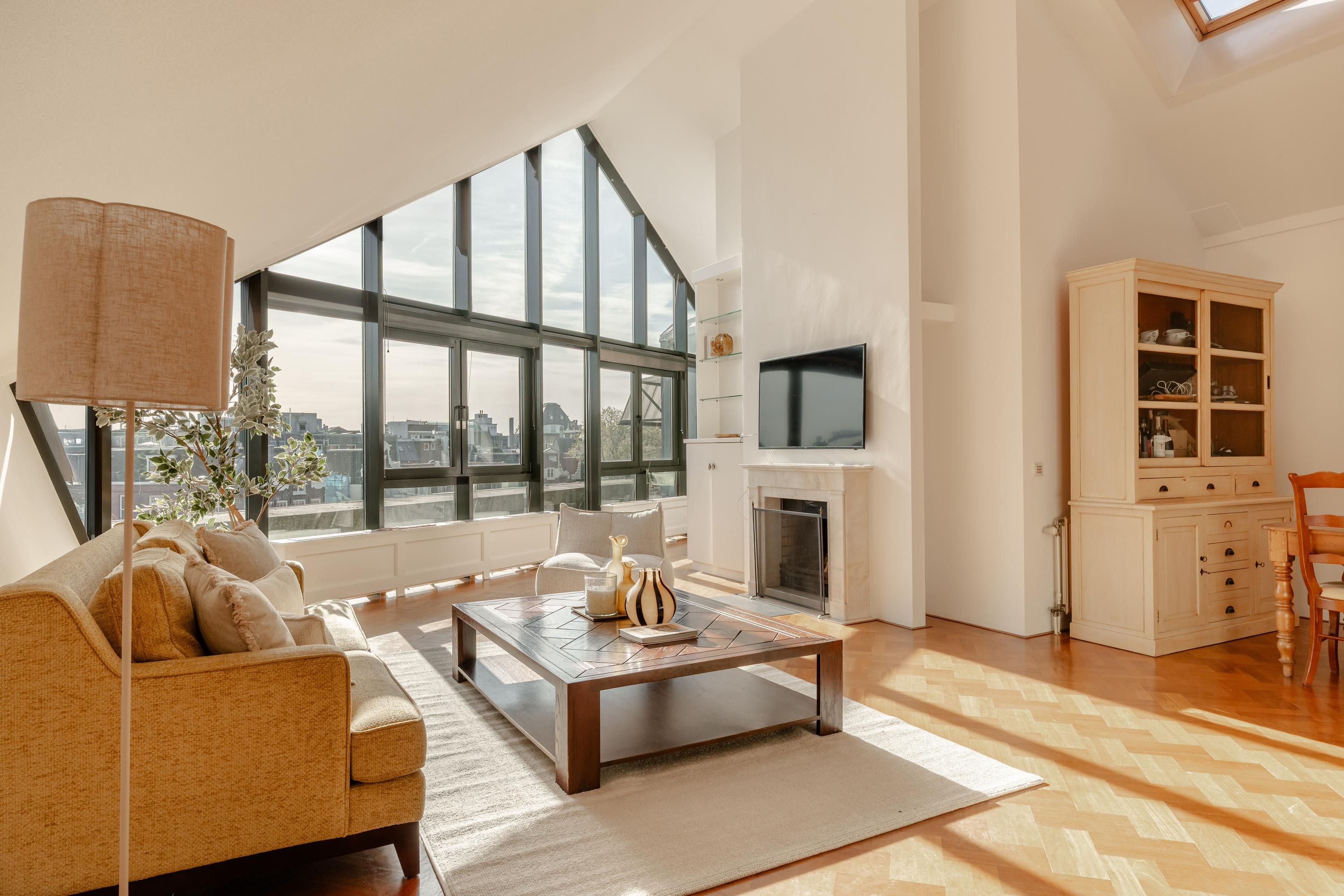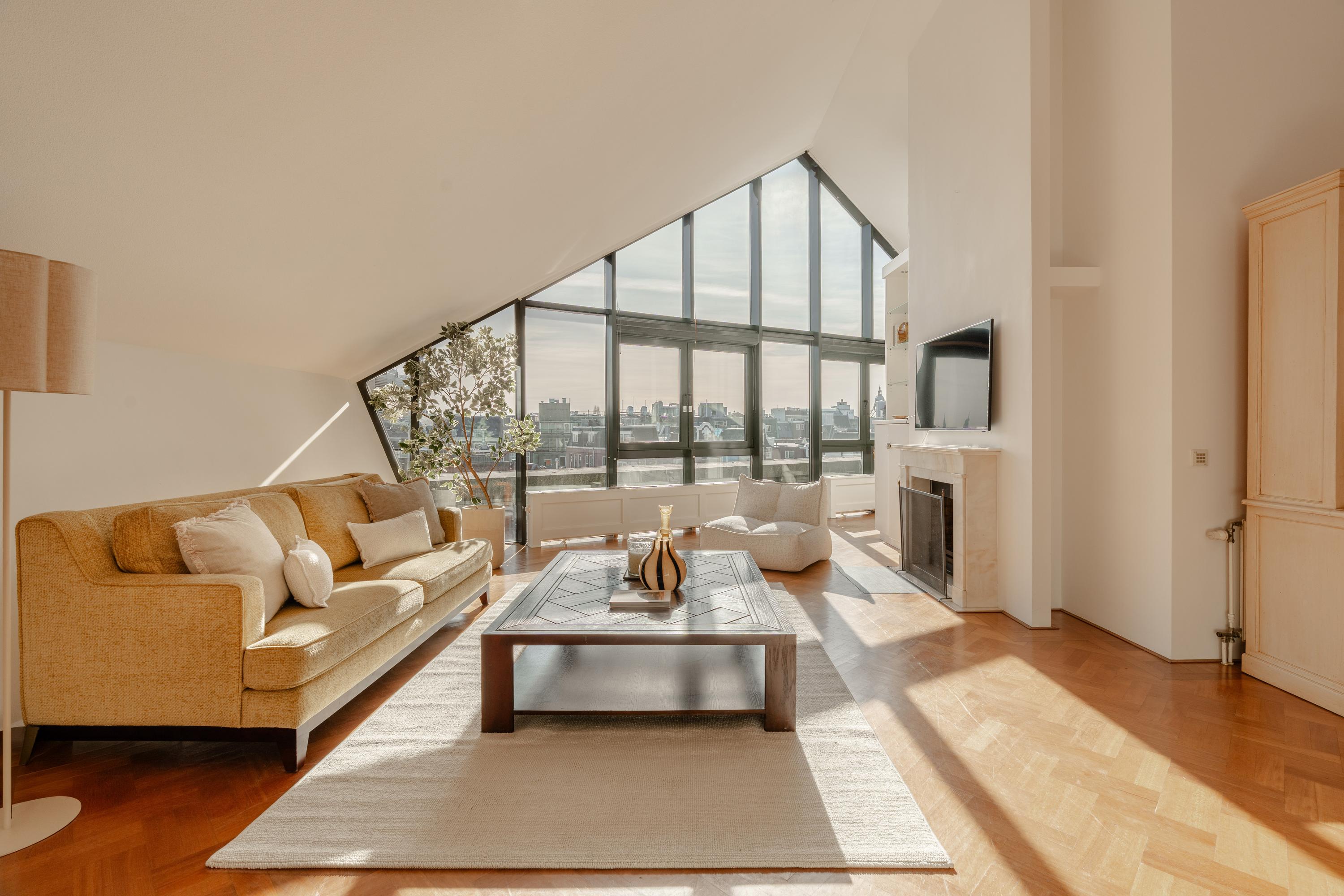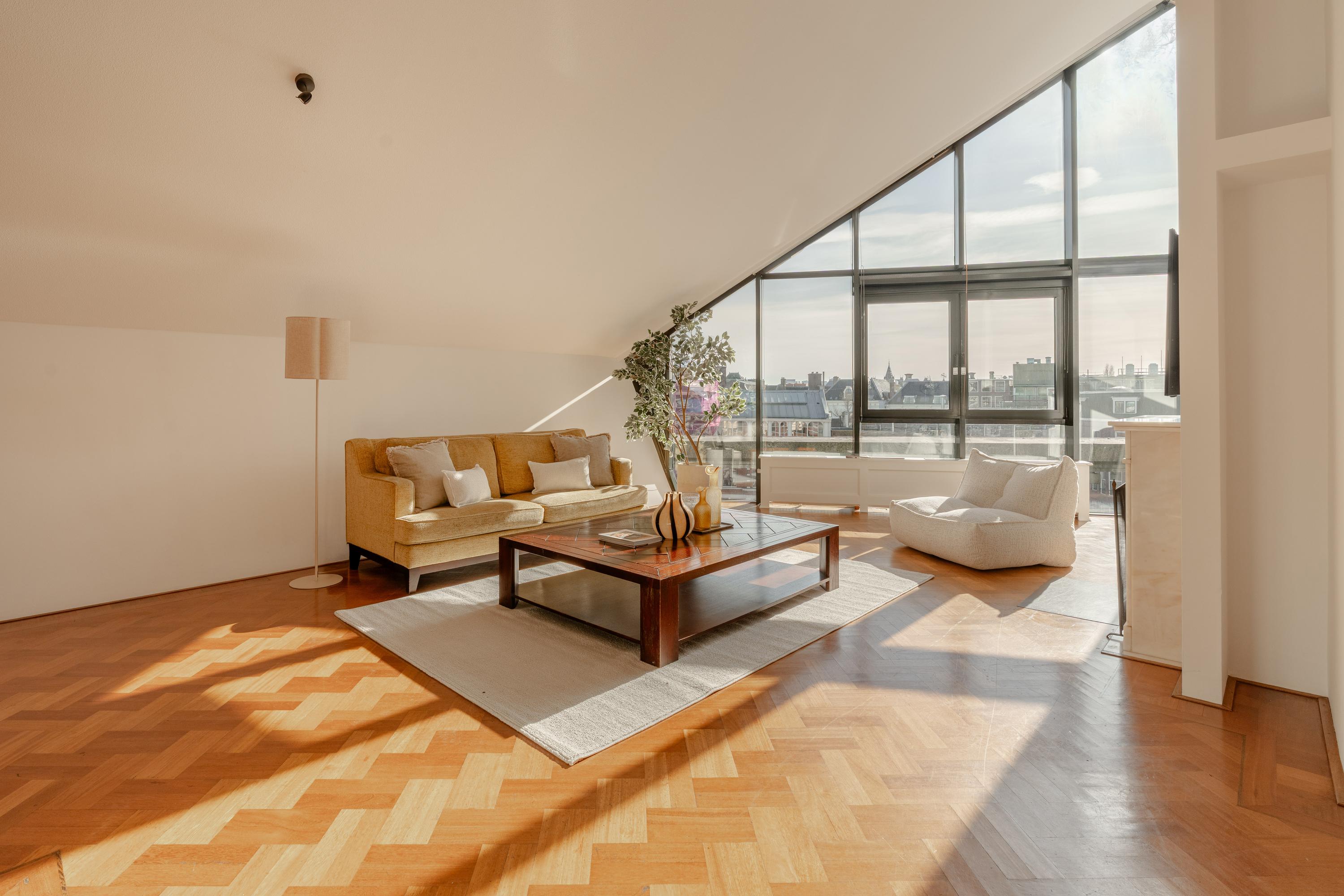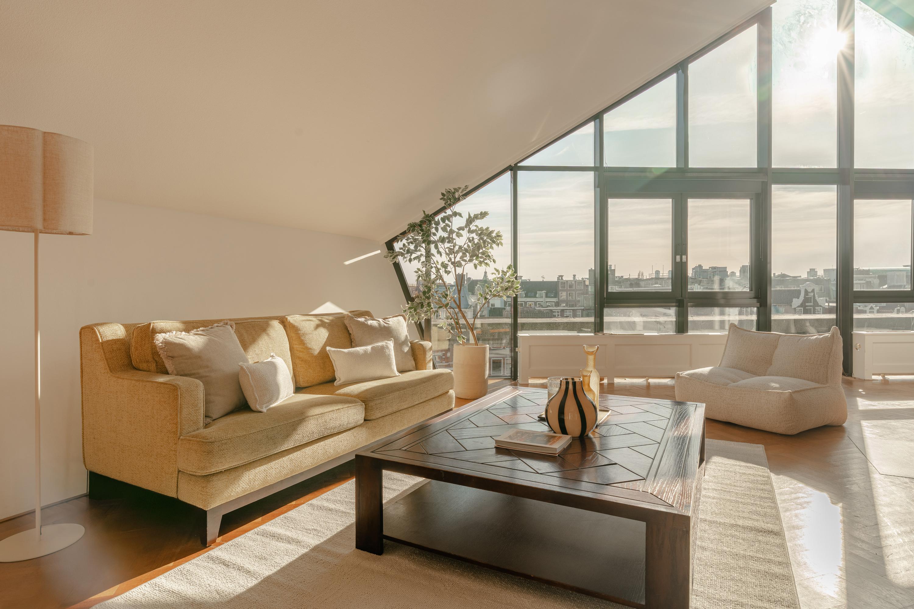 De hoogte van de ruimte en de vele raampartijen zorgen voor een overvloed aan daglicht en een ruimtelijk gevoel. Aan de voorzijde is een comfortabele zithoek gesitueerd met uitzicht over het Singel en de Bloemenmarkt.