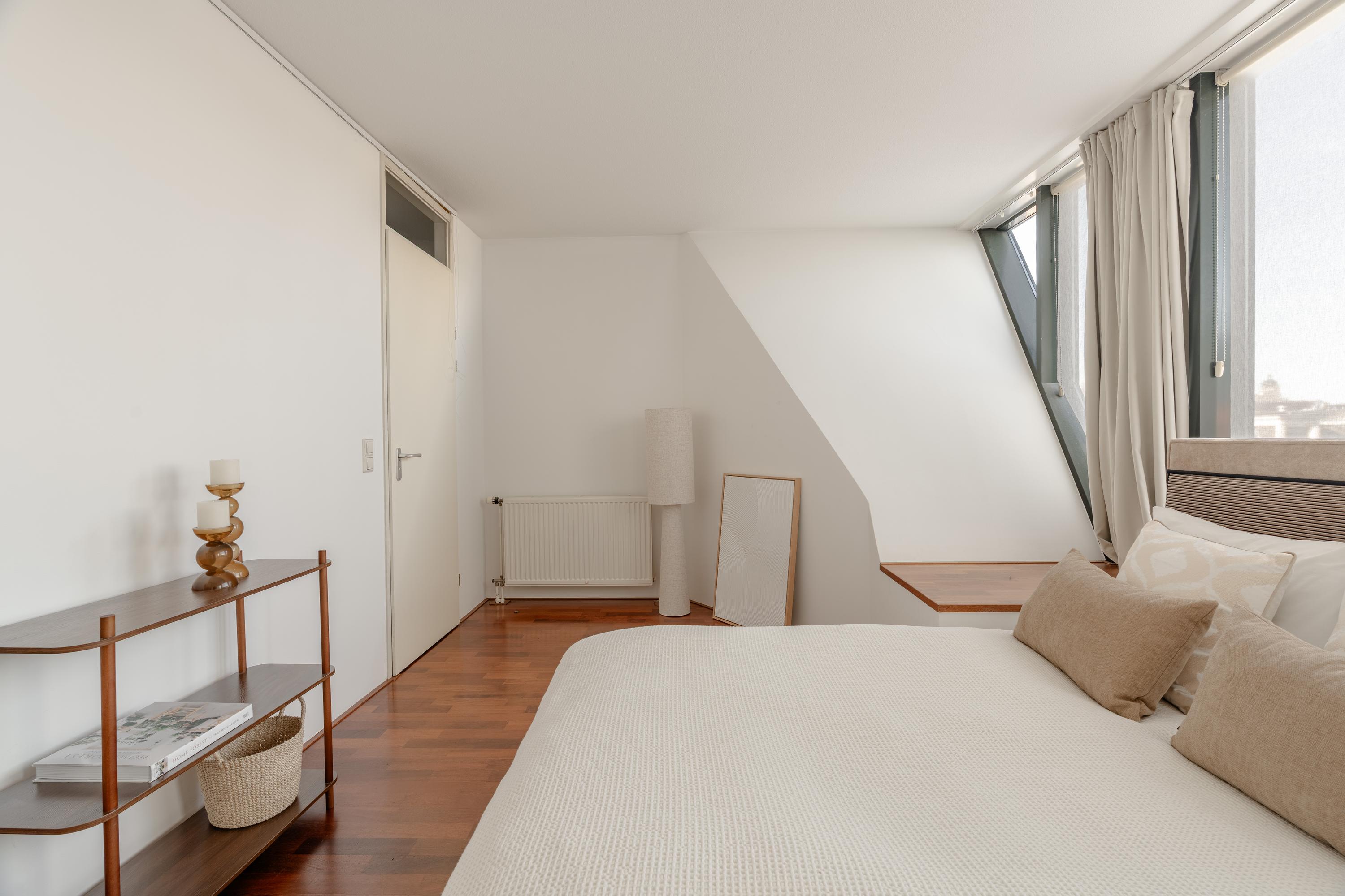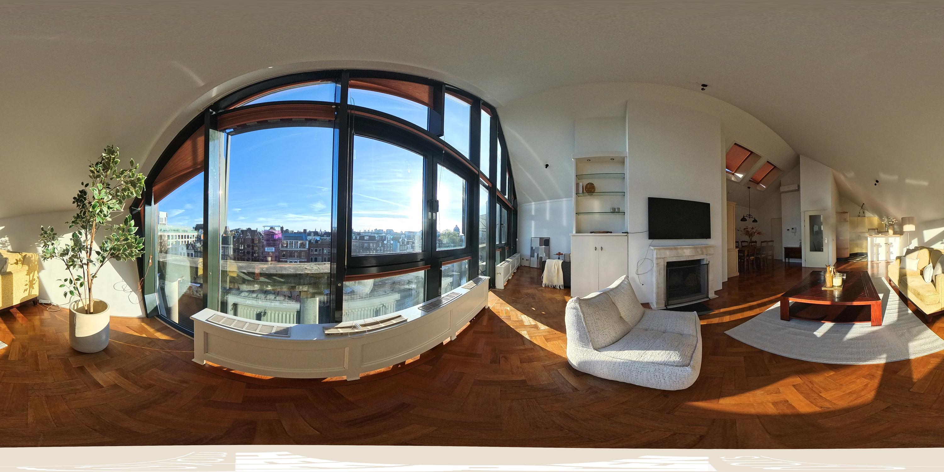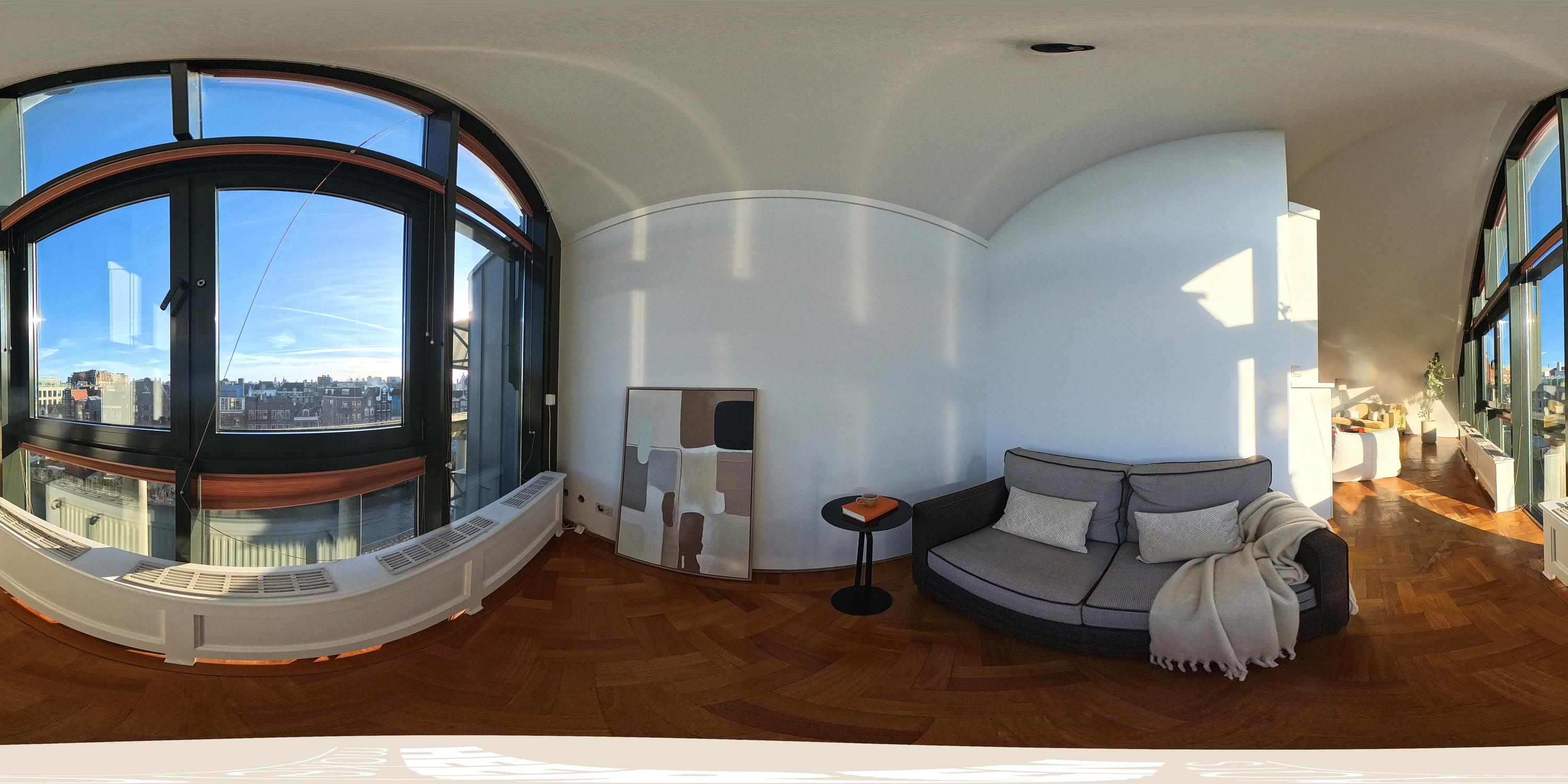 De hoogte van de ruimte en de vele raampartijen zorgen voor een overvloed aan daglicht en een ruimtelijk gevoel. Aan de voorzijde is een comfortabele zithoek gesitueerd met uitzicht over het Singel en de Bloemenmarkt.