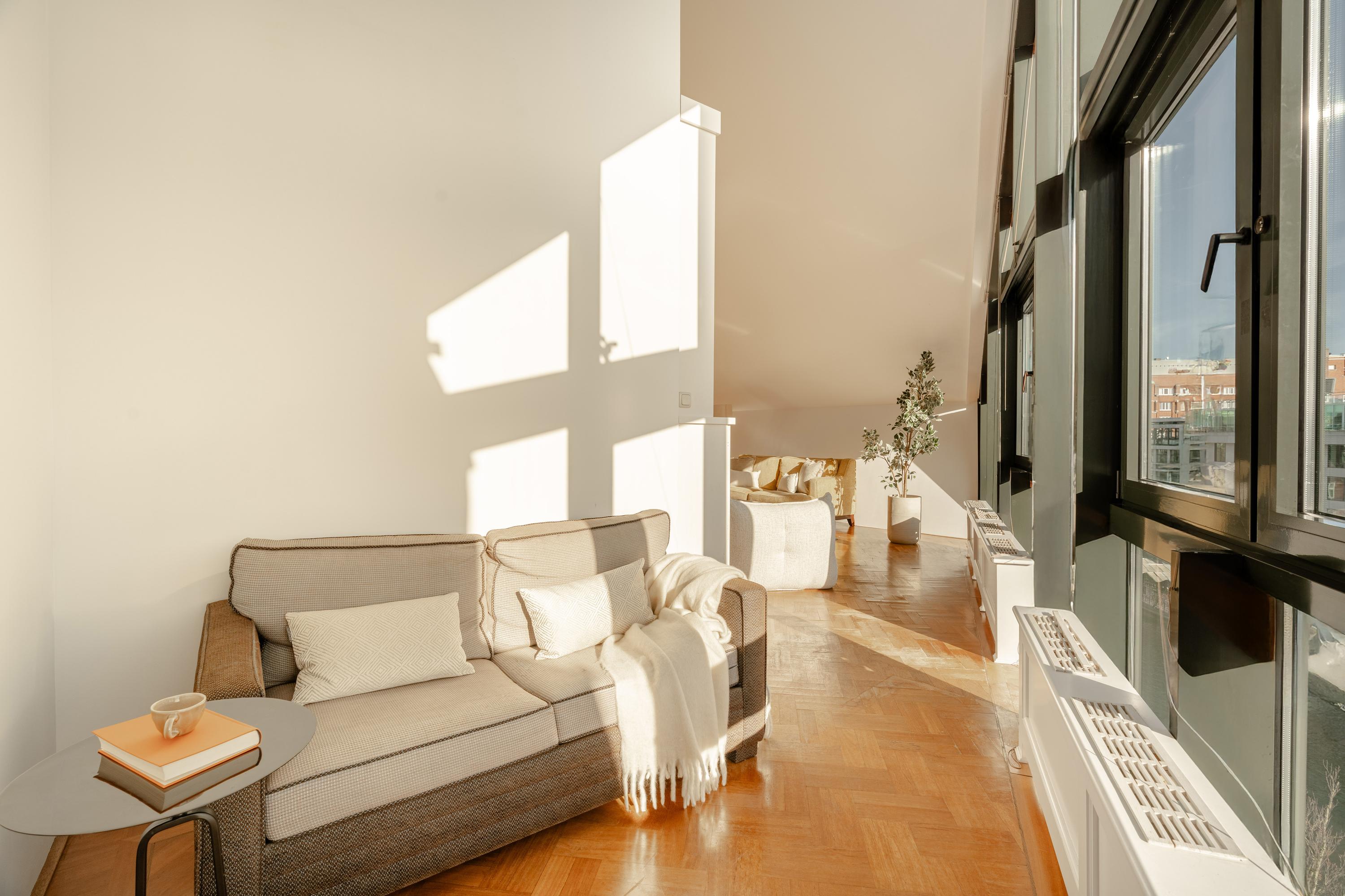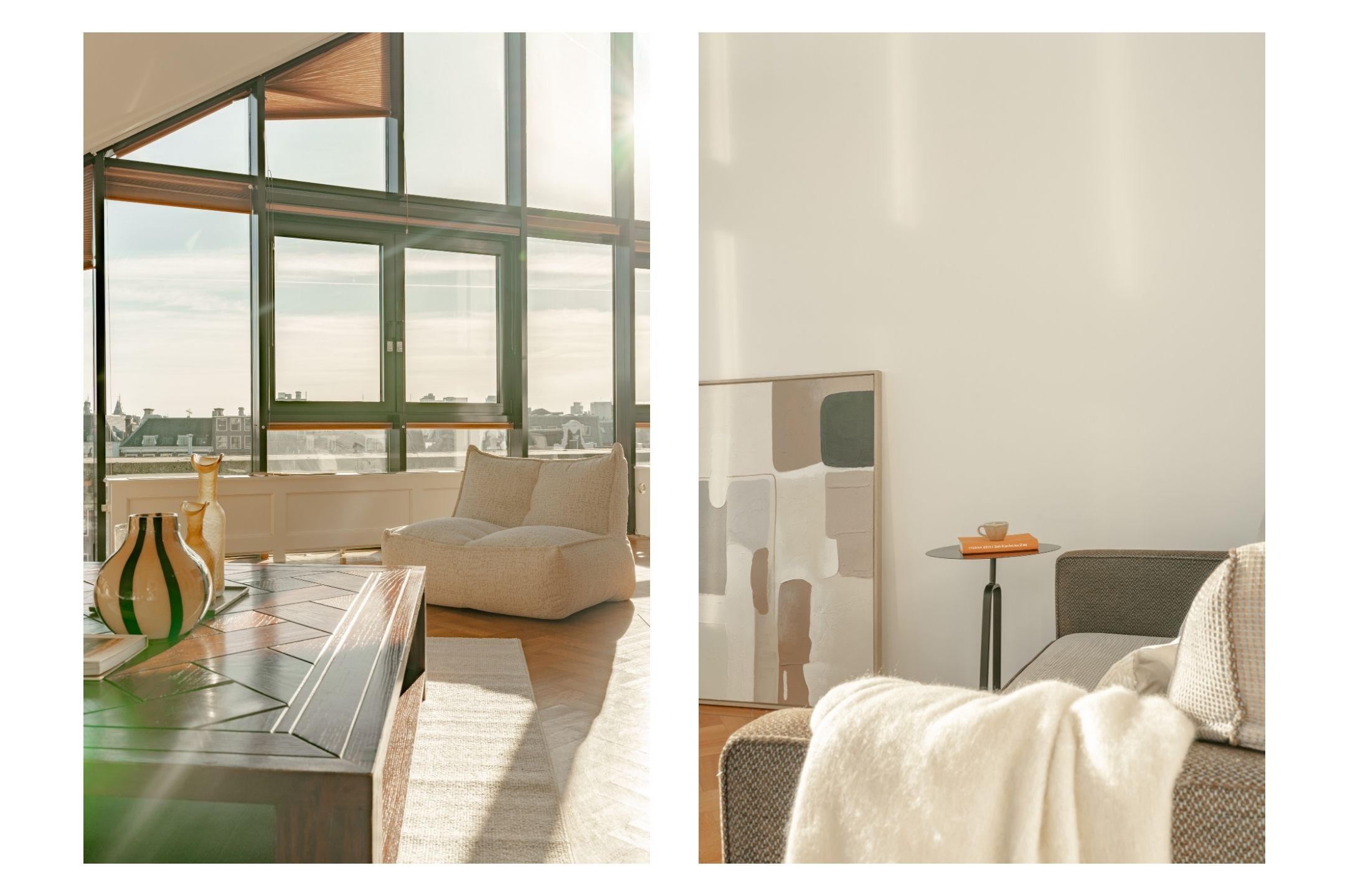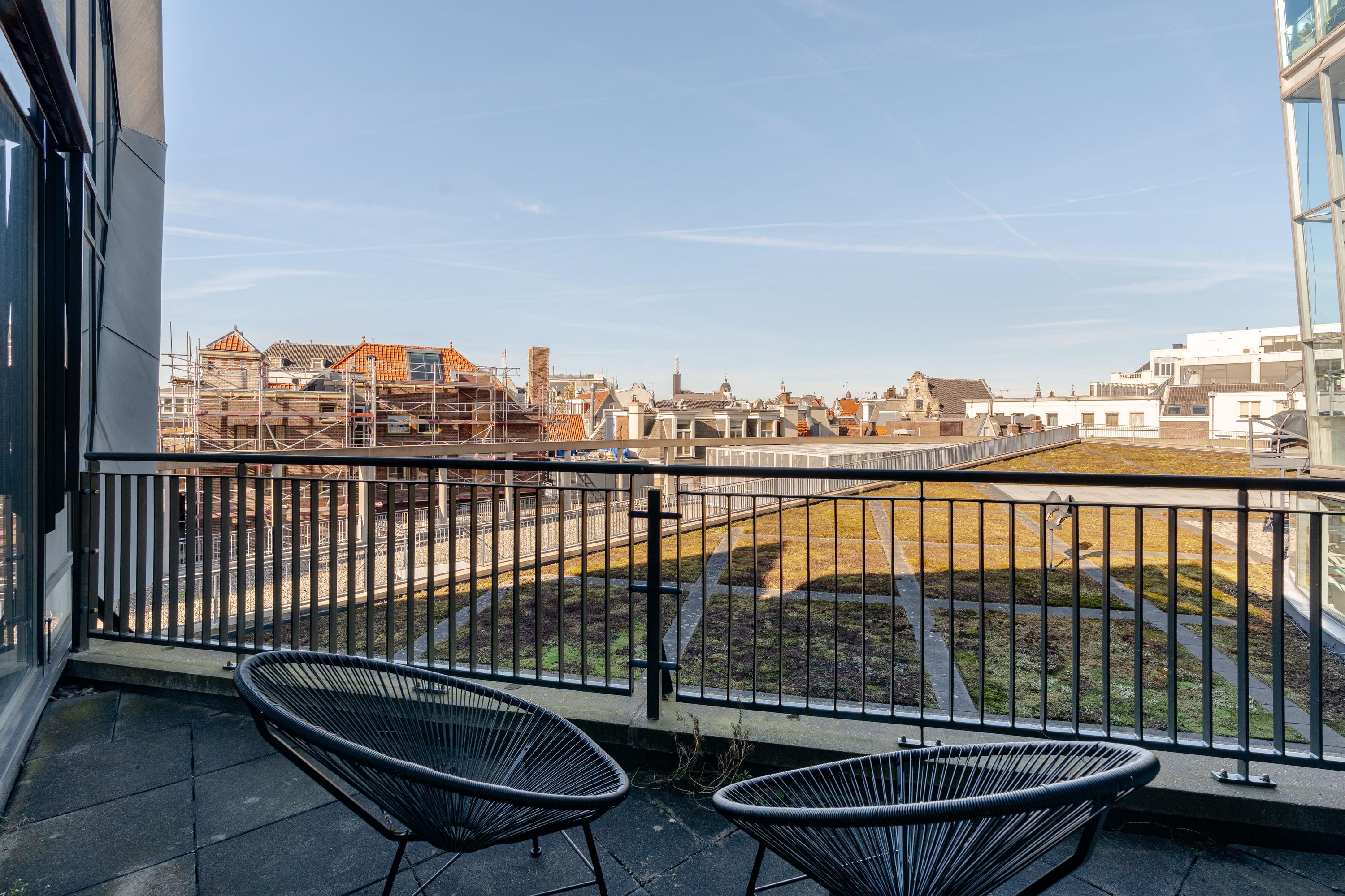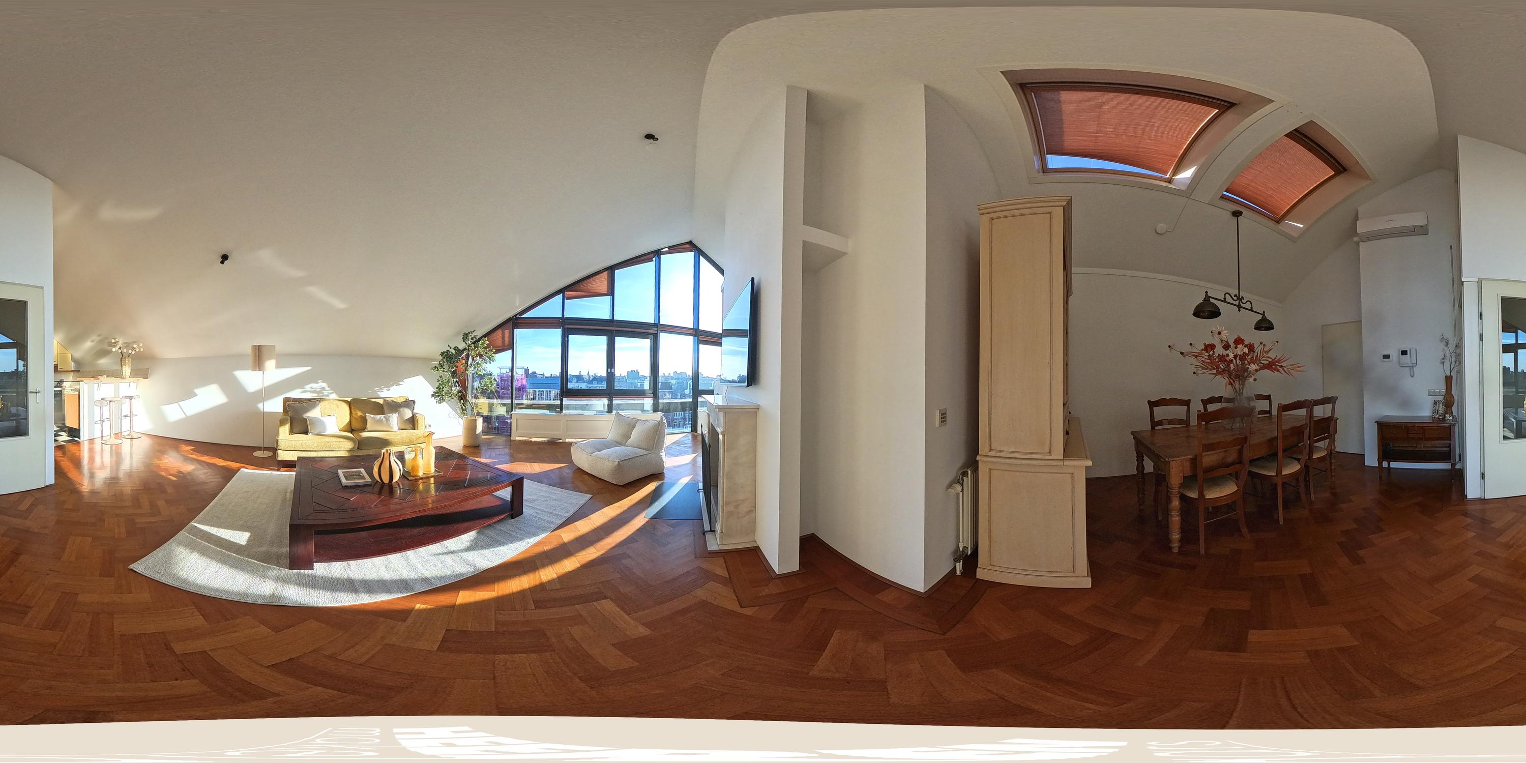 De hoogte van de ruimte en de vele raampartijen zorgen voor een overvloed aan daglicht en een ruimtelijk gevoel. Aan de voorzijde is een comfortabele zithoek gesitueerd met uitzicht over het Singel en de Bloemenmarkt.