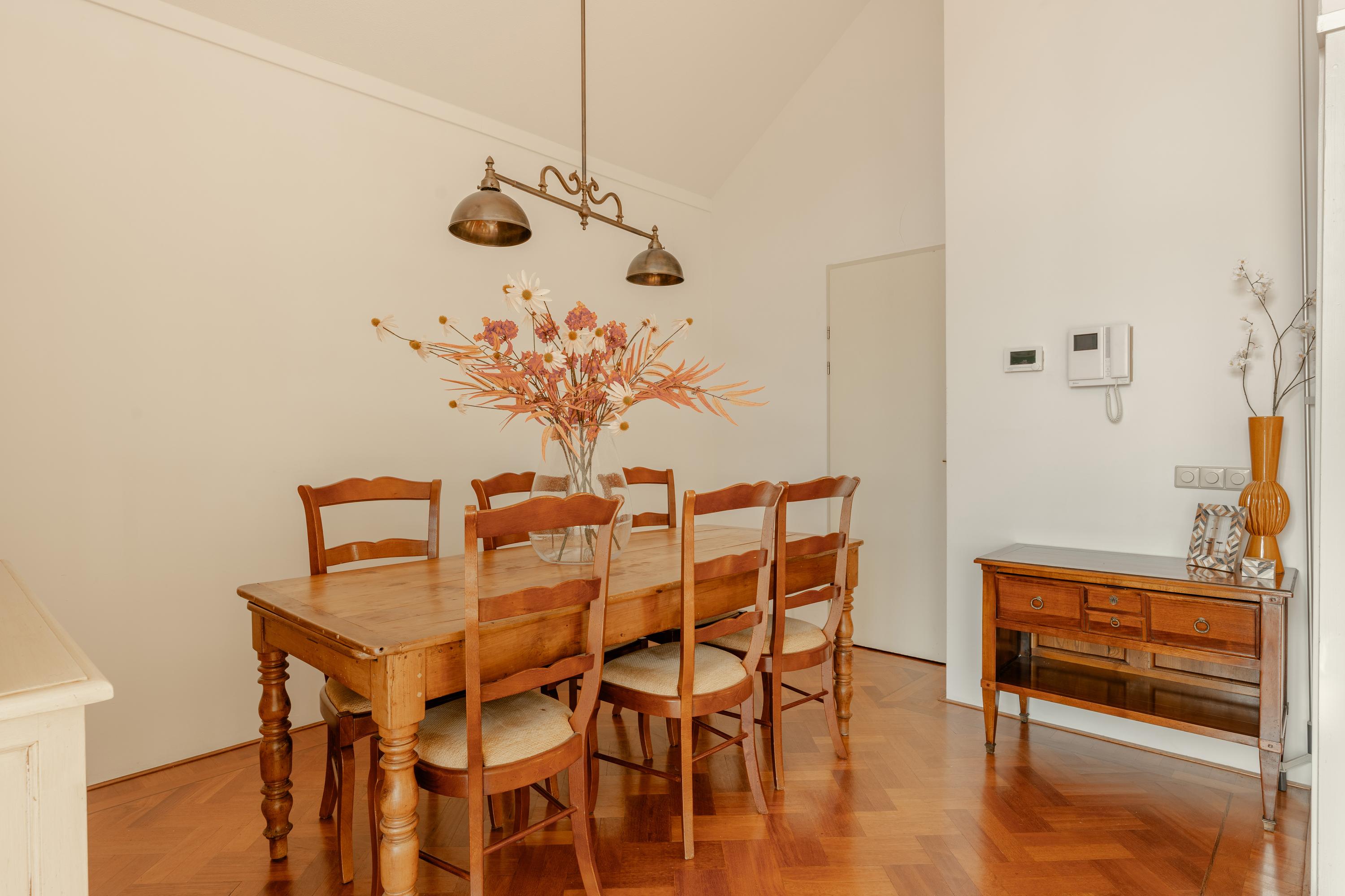 De eetkamer aan de achterzijde biedt ruimte voor een grote eettafel, ideaal voor diners en ontvangst. Aangrenzend bevindt zich de halfopen keuken met bar, voorzien van diverse inbouwapparatuur, waaronder een gasfornuis, oven, koelkast, vriezer en vaatwasser.