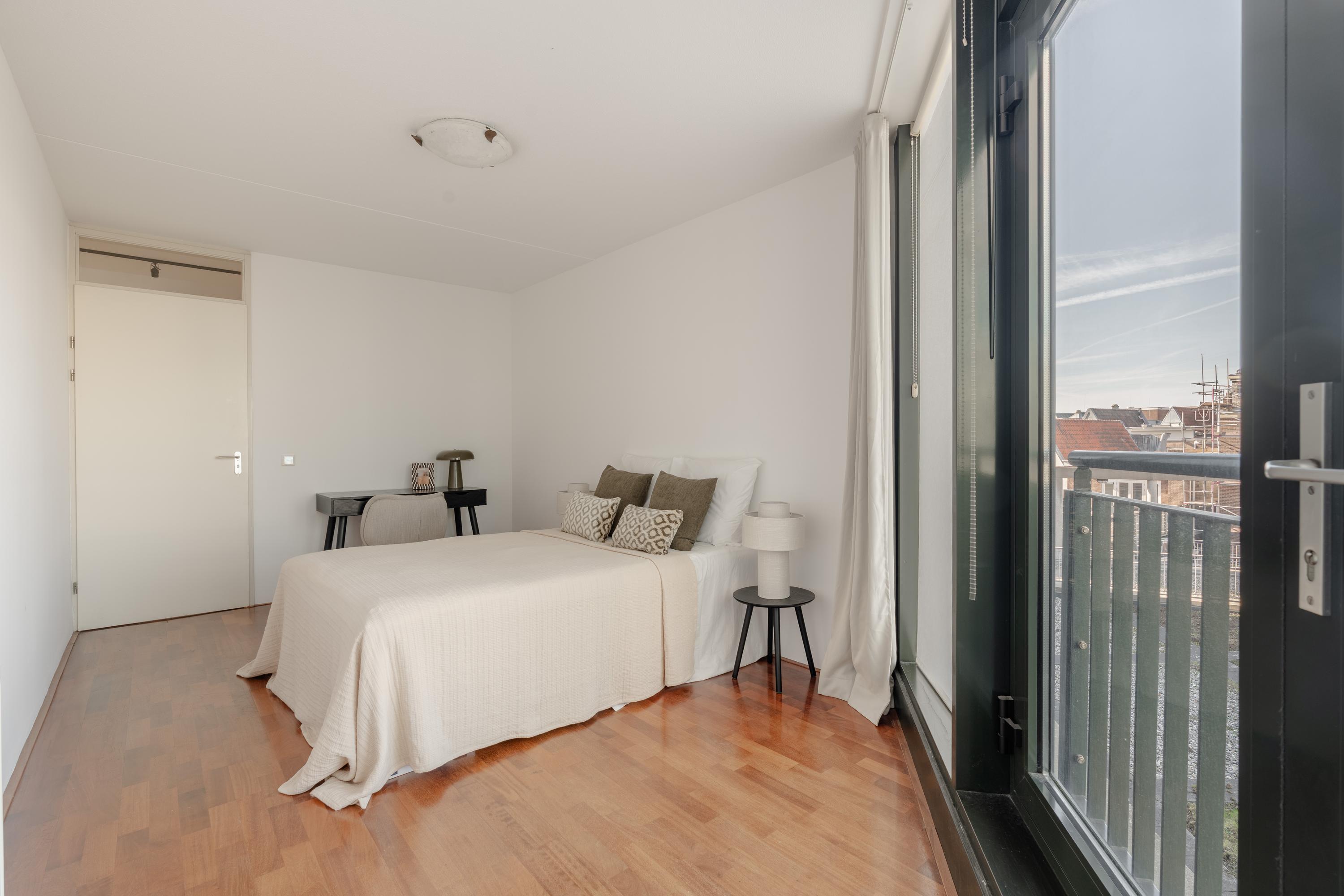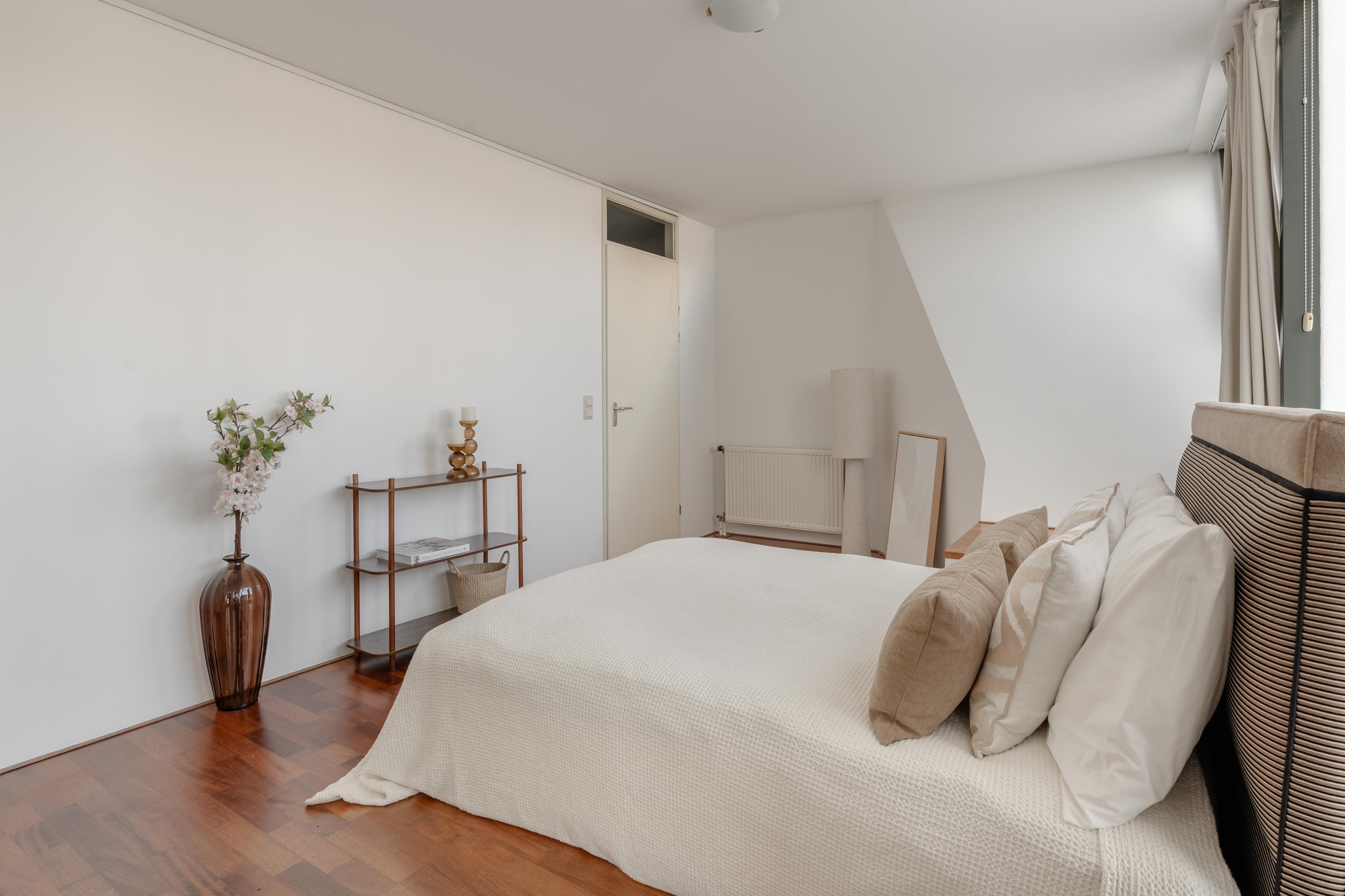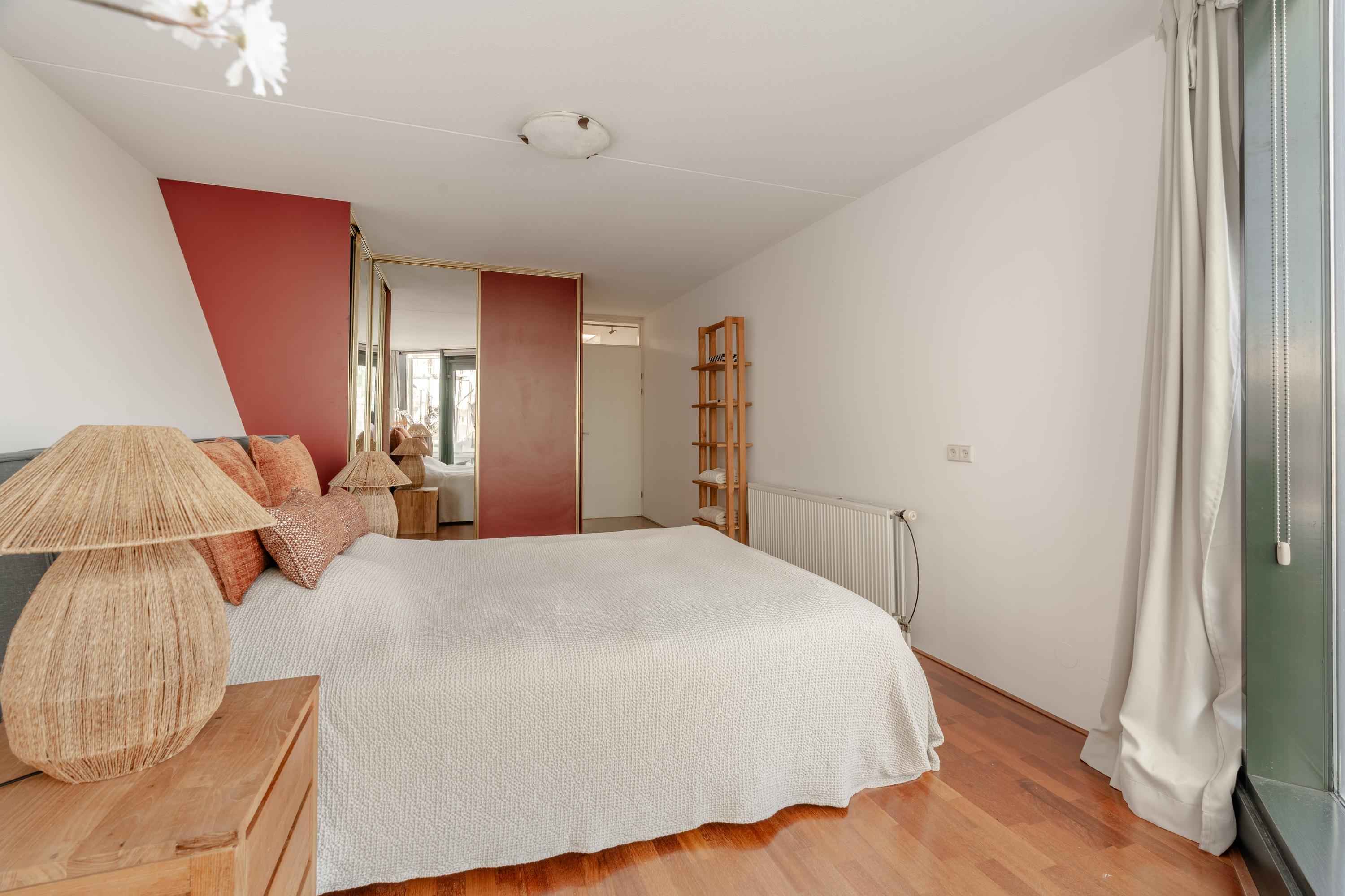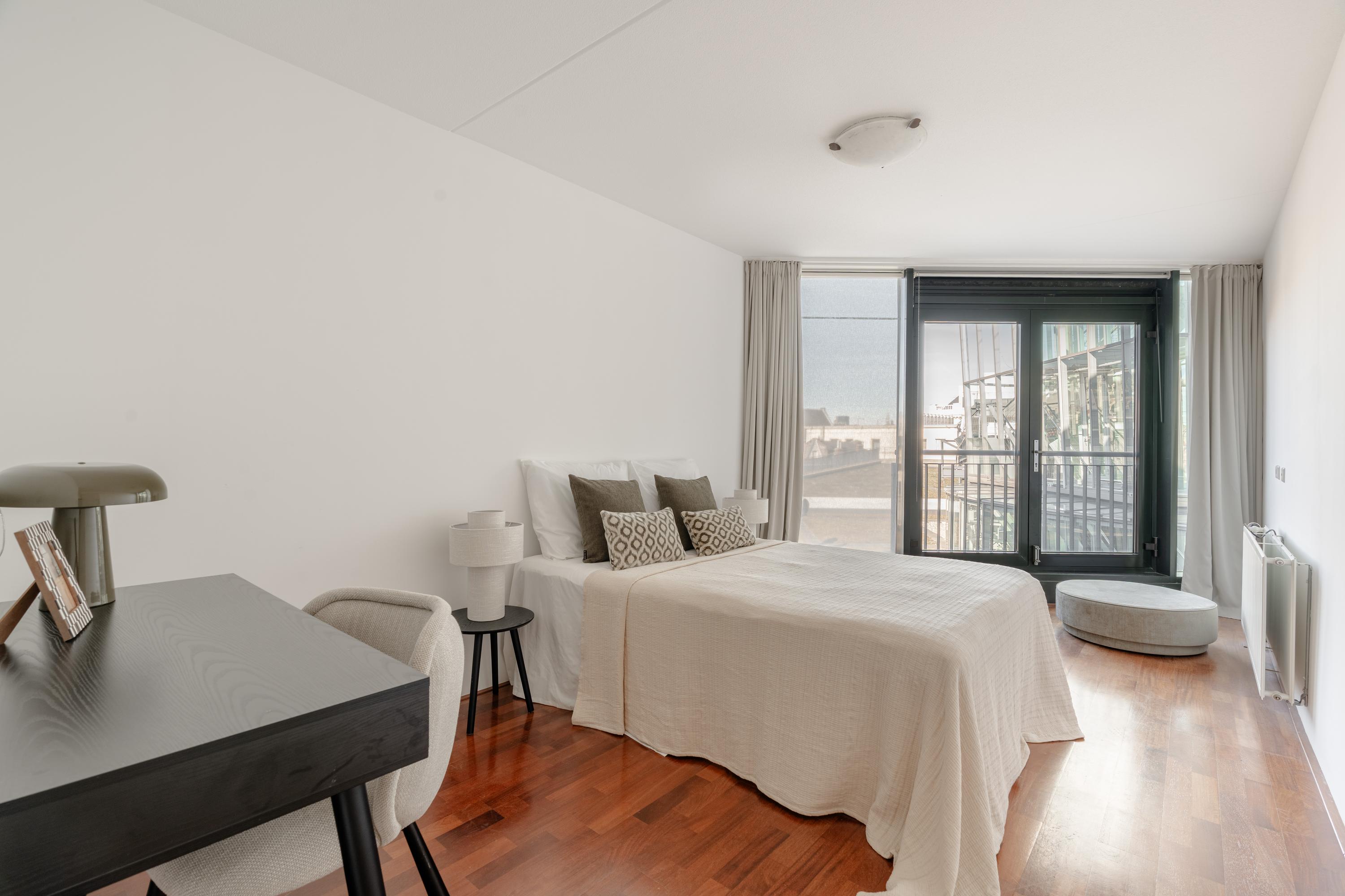 Bij binnenkomst in de hal bevindt zich aan de linkerzijde een lichte en royale slaapkamer, voorzien van vaste kasten, een en-suite badkamer met douche en wastafel en directe toegang tot het balkon.
