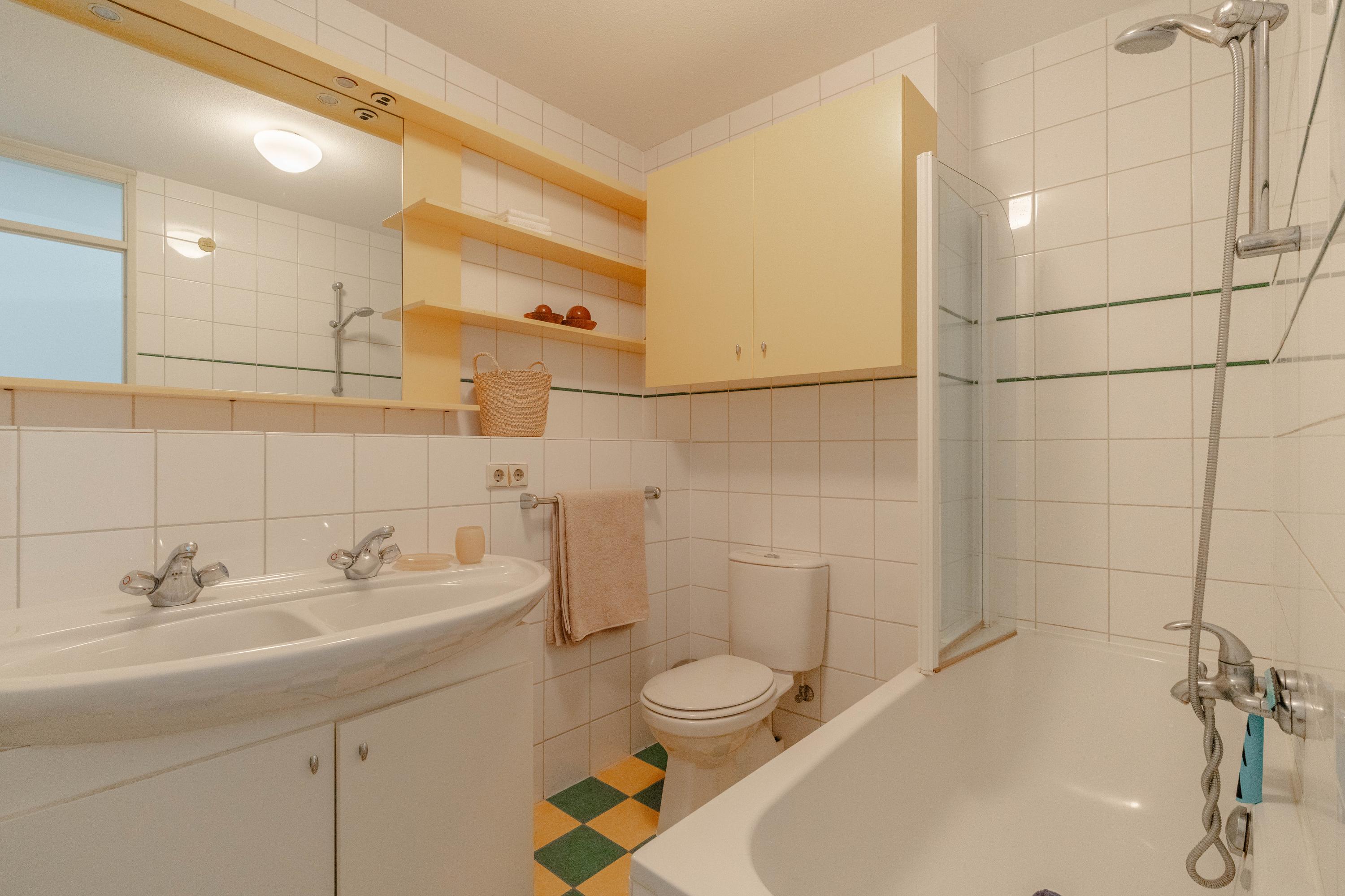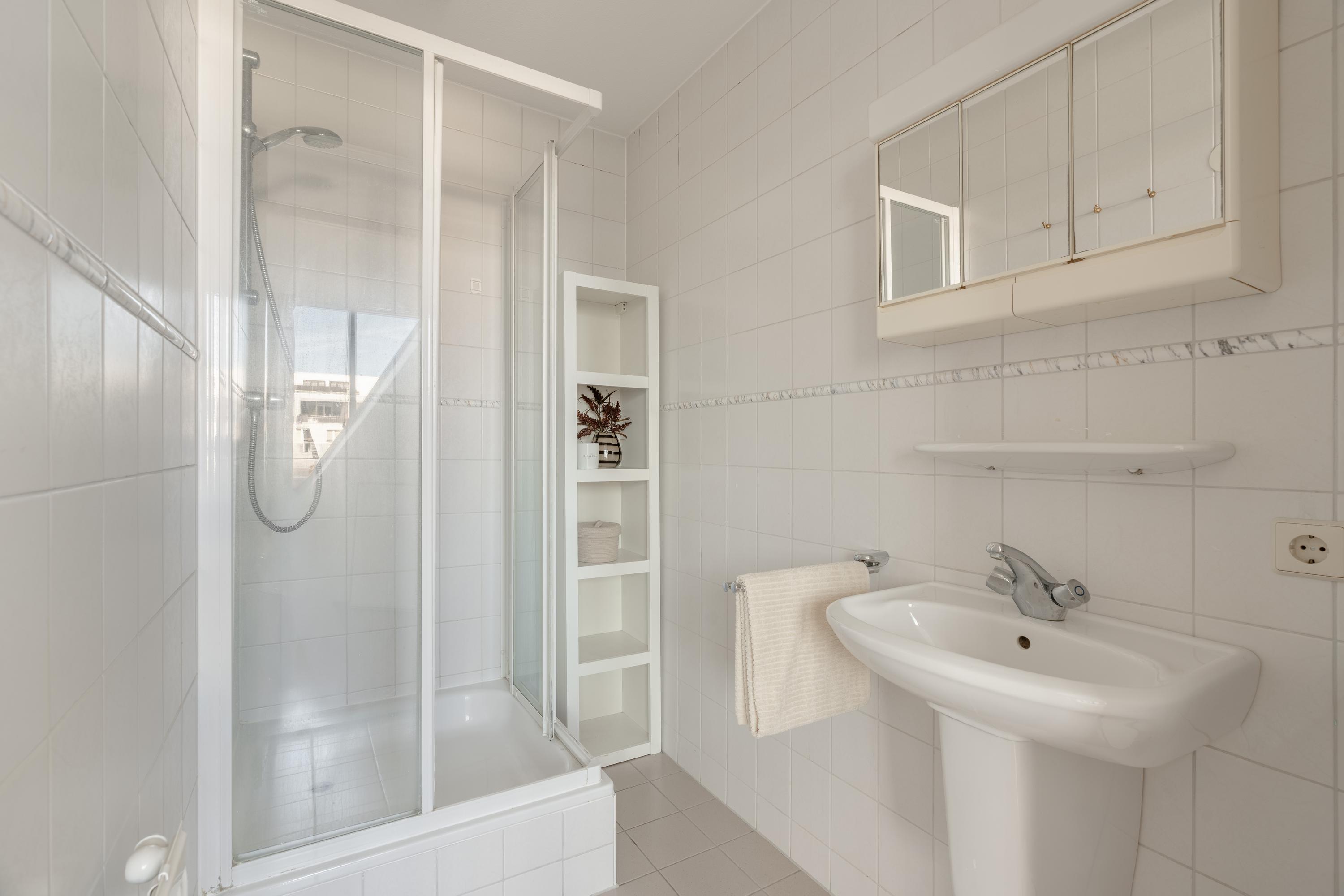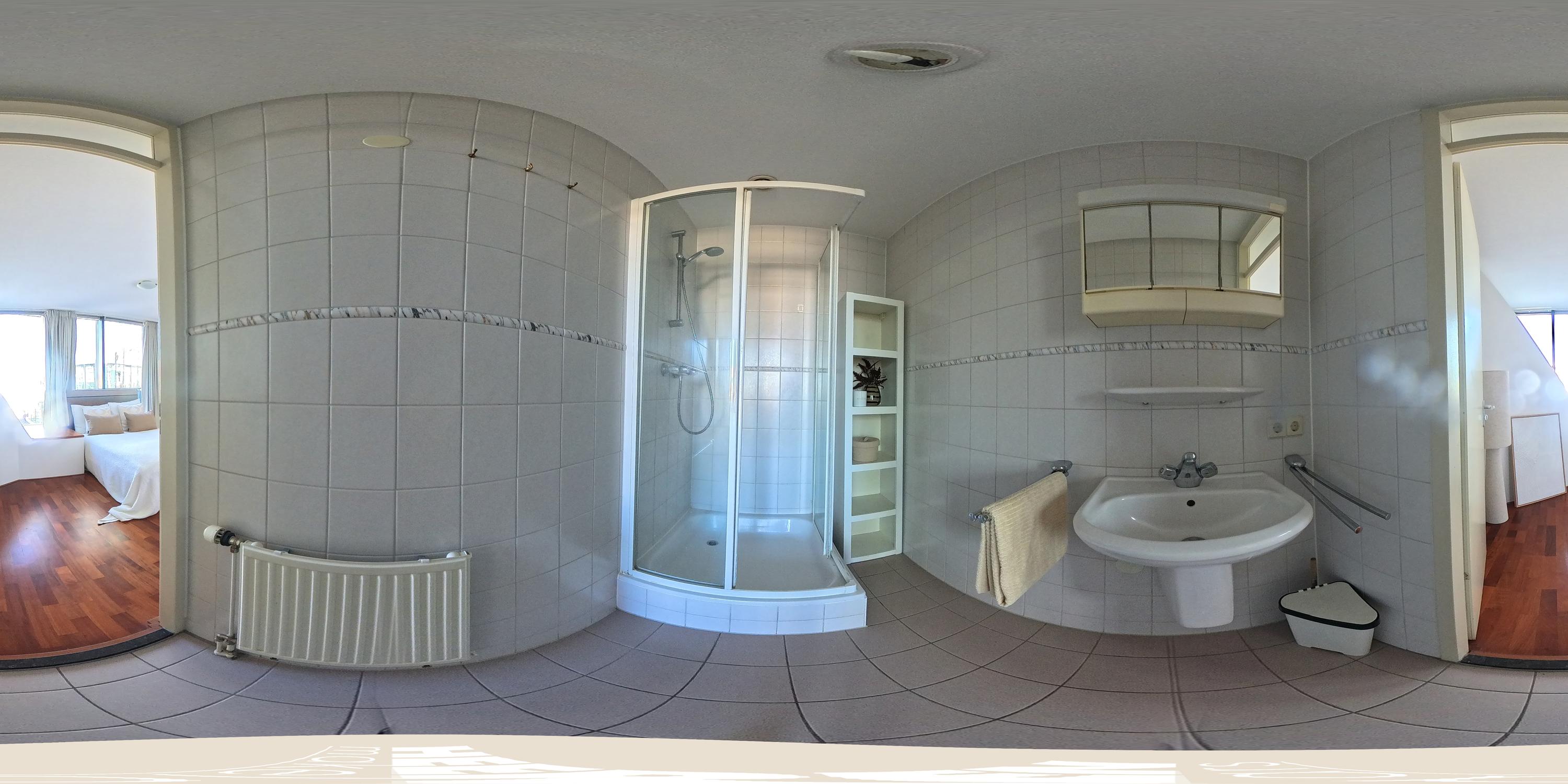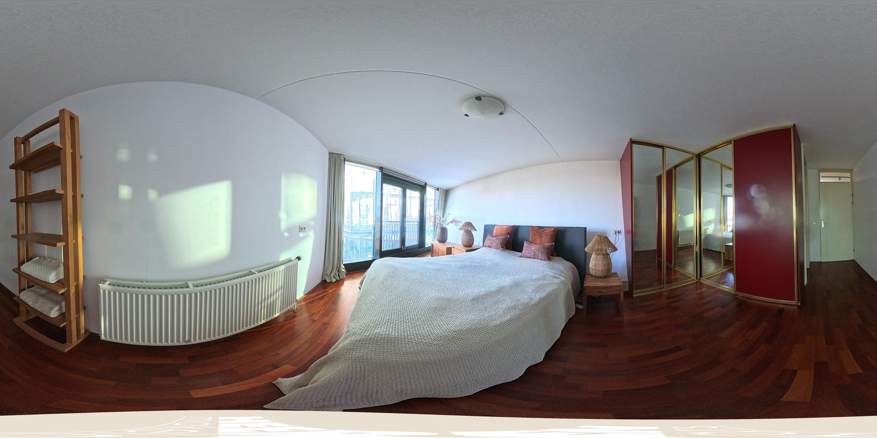 Bij binnenkomst in de hal bevindt zich aan de linkerzijde een lichte en royale slaapkamer, voorzien van vaste kasten, een en-suite badkamer met douche en wastafel en directe toegang tot het balkon.