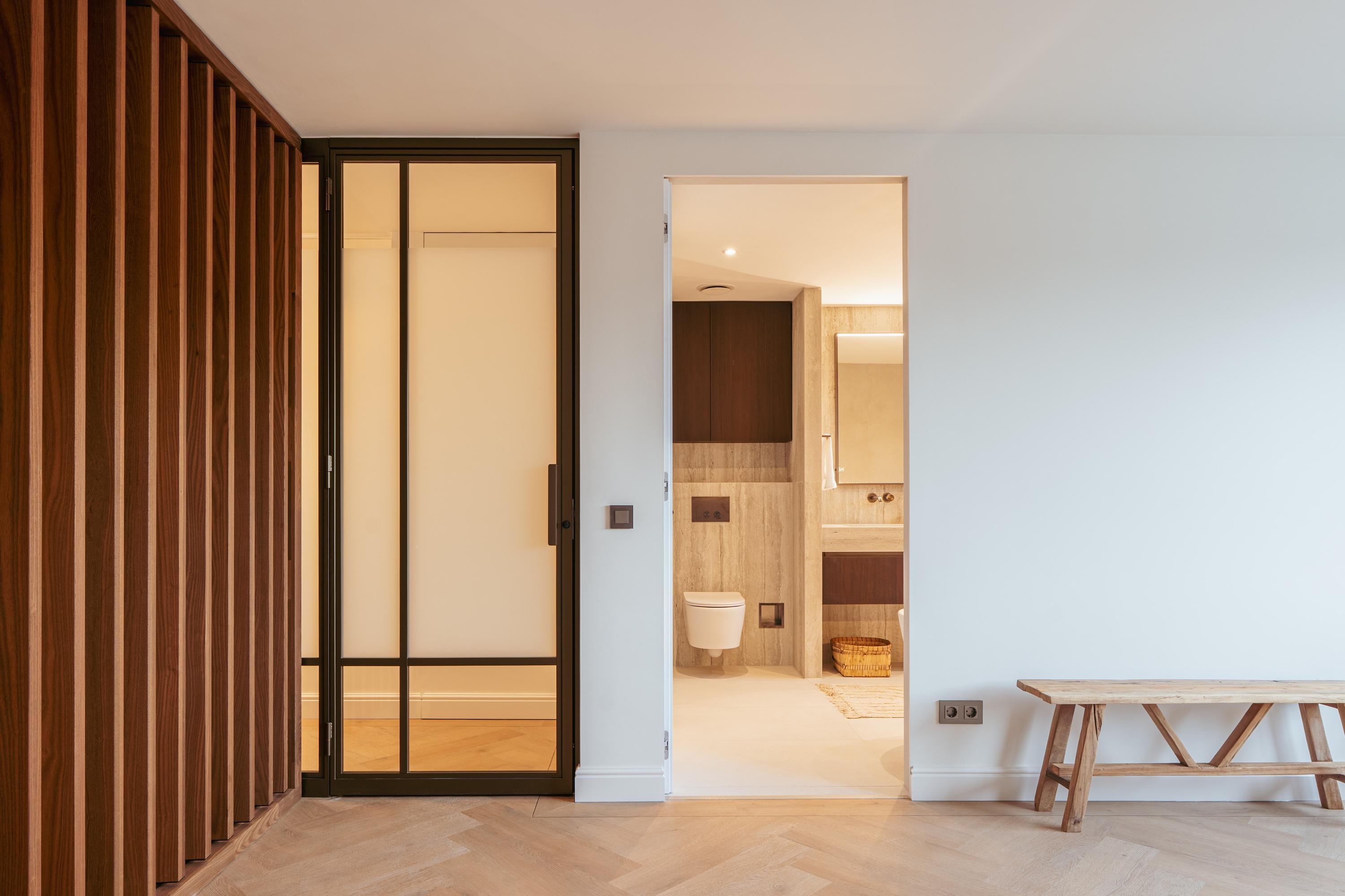 Bij binnenkomst wordt u verwelkomd door een royale entree en aan uw rechterzijde loopt u langs handige inbouwkasten, voorzien van aansluitingen voor wasmachine en droger, direct door naar de open keuken. Deze bestaat uit een statig kookeiland met inductieplaat, een vaatwasser, combi-oven, koel- en vriescombinatie, een klimaatkast en tot slot een Quooker. De ingebouwde verlichting in de keuken geeft de gehele ruimte bijzonder veel sfeer waardoor deze tot één van de vele eyecatchers van dit appartement behoort. Vanuit de open woonkamer heeft u toegang tot het riante zonneterras van ca. 8m², gelegen op het zuid westen. Door de plafond hoge raampartijen en schuifdeuren vangt de woonkamer met eetkamer en-suite enorm veel natuurlijk zonlicht, wat prachtig door de stalen glazen deuren tot aan de slaapkamer aan de achterzijde doorschijnt. Deze master bedroom van bijna 22 m² biedt genoeg ruimte voor een King Size bed en heeft een open uitzicht over het water van de Singelgracht. Bovendien beschikt deze slaapkamer over een moderne badkamer en-suite, die is voorzien van een vrijstaand ligbad, een inloopdouche met geblindeerd glas, een dubbele op maat gemaakte wastafel met meubel en een toilet. Tevens is deze badkamer toegankelijk vanuit de centrale hal, waar zich ook een plafond hoge garderobekast bevindt en waar de trap naar de tweede verdieping te vinden is.