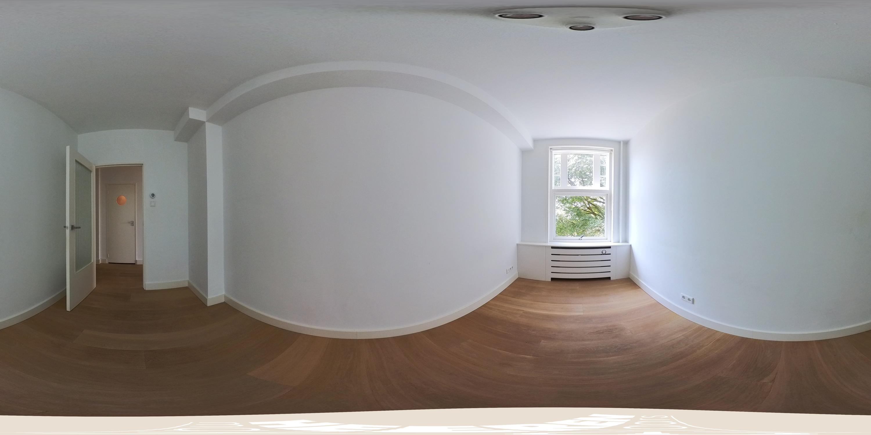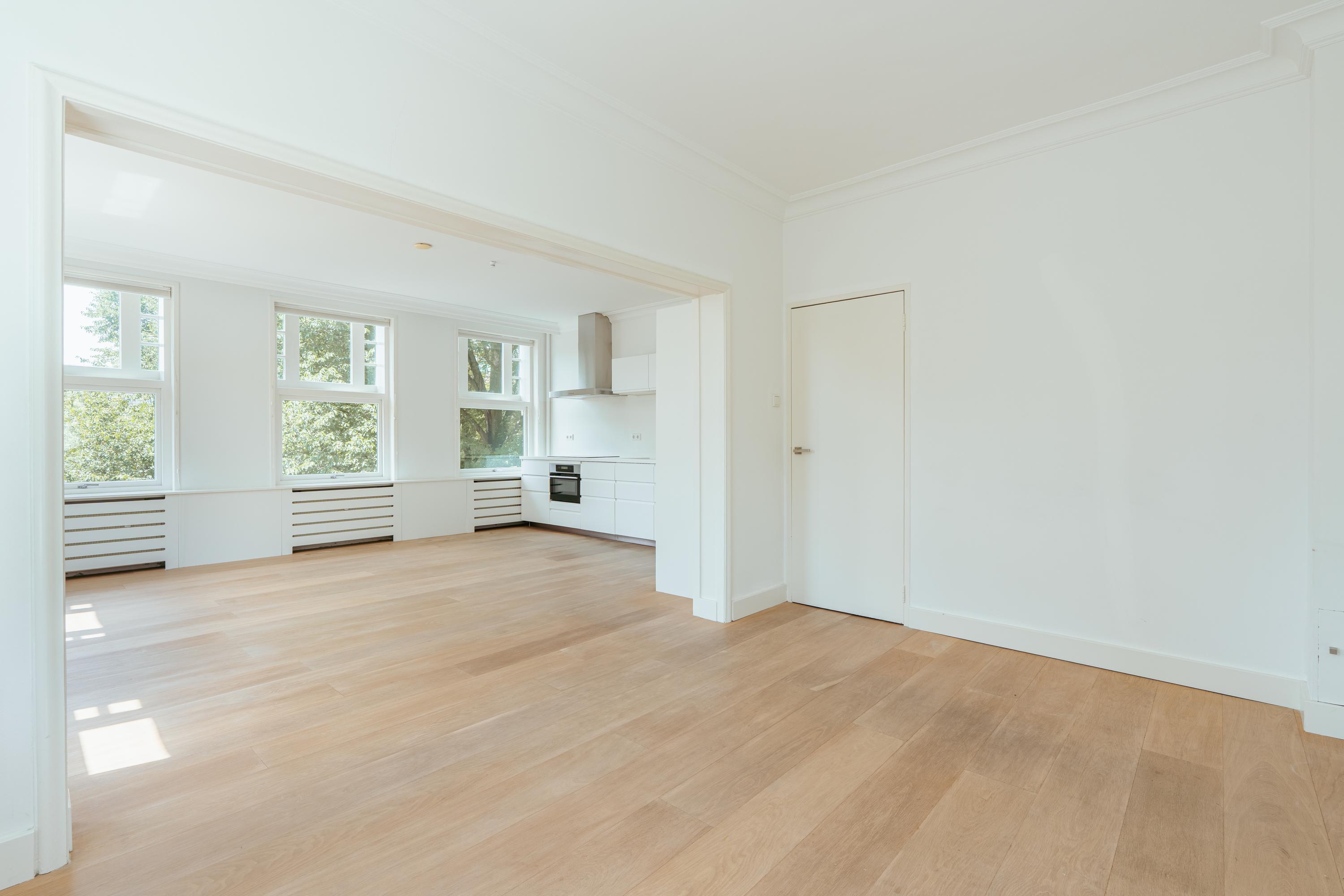 Entree van het appartement met ruime hal die toegang biedt tot alle vertrekken. Aan de voorzijde bevindt zich de woon- en leefruimte met prachtig uitzicht over het groene en statige Minervaplein. De ruime doorzonwoonkamer is aan drie zijden voorzien van ramen, waardoor het appartement baadt in natuurlijk licht en een ruimtelijk gevoel geeft. De open woonkeuken is voorzien van diverse moderne inbouwapparatuur, waaronder een inductiekookplaat, combi-oven, vaatwasser, koelkast en vriezer. Aan de achterzijde bevindt zich de royale master bedroom, met prachtige grote ramen die zorgen voor veel lichtinval. De tweede slaapkamer ligt aangrenzend en is ideaal te gebruiken als logeerkamer, werkruimte of kinderkamer. In de onderbouw van het complex bevindt zich nog een externe berging, ideaal voor extra opslagruimte.