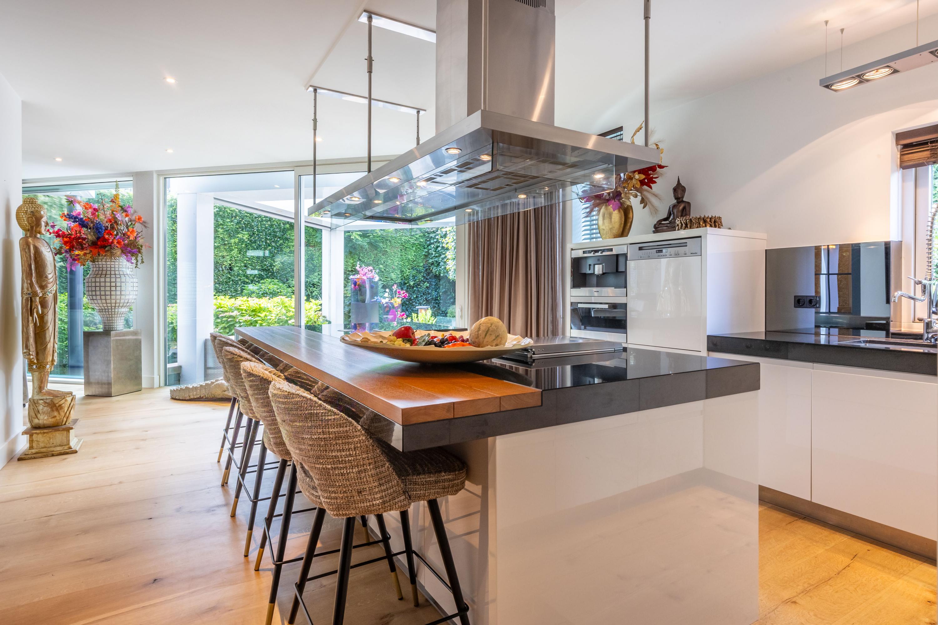Het hart van het huis wordt gevormd door de ruime designkeuken van Arclinea met een granieten aanrechtbladen en een sculpturaal kookeiland met bar. Hierin is alle denkbare inbouwapparatuur: een vijf-pits kookplaat met wokbrander en een separate teppanyaki grill, een op maat gemaakt afzuigsysteem, een Quooker en een traditionele kraan, koffiemachine, 2 warmhoudlades, een bordenwarmer, vaatwasser op hoogte, een magnetron, combi-stoomoven en een hogedrukstoomoven. Alles is ontworpen om koken tot een verfijnde belevenis te maken.
