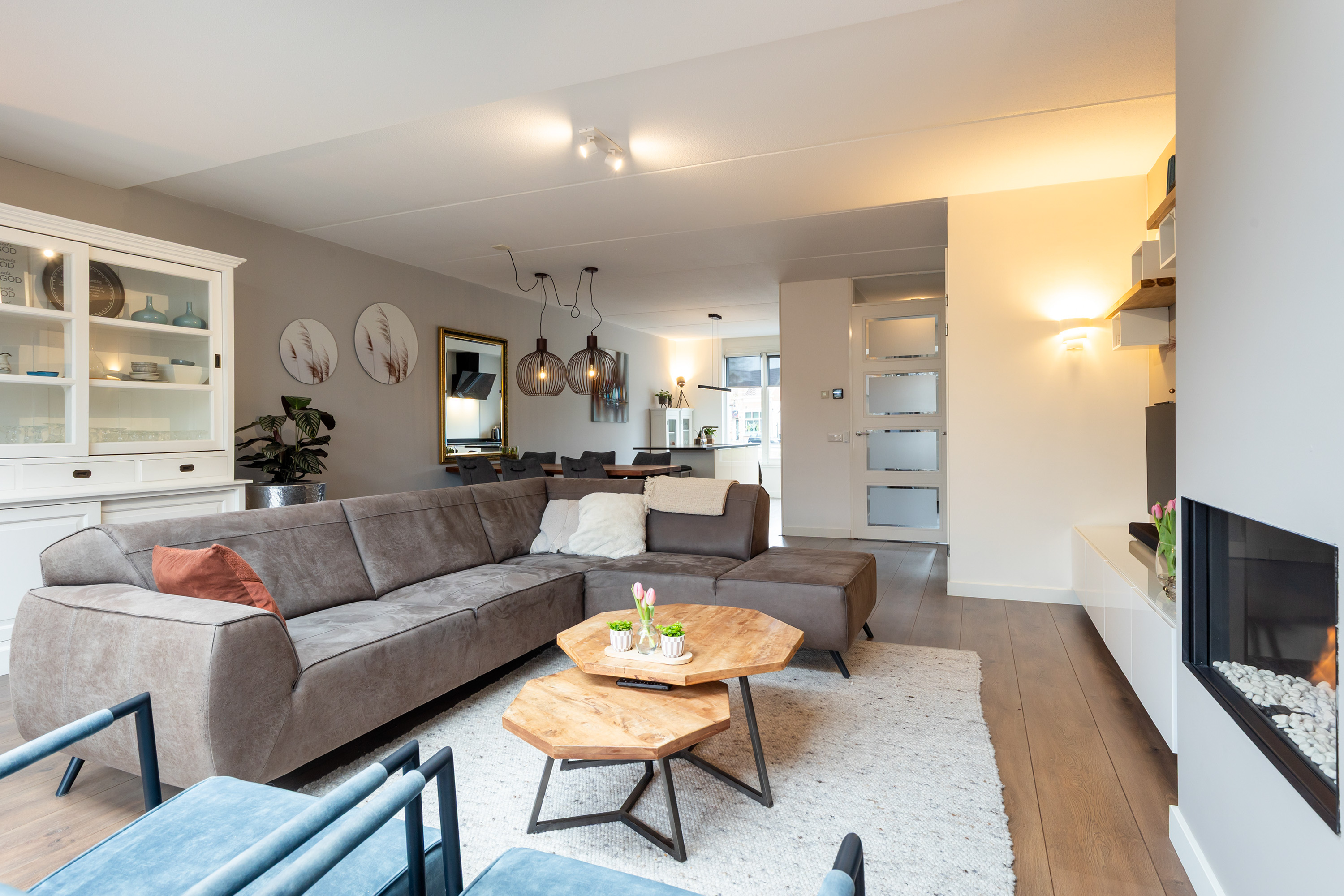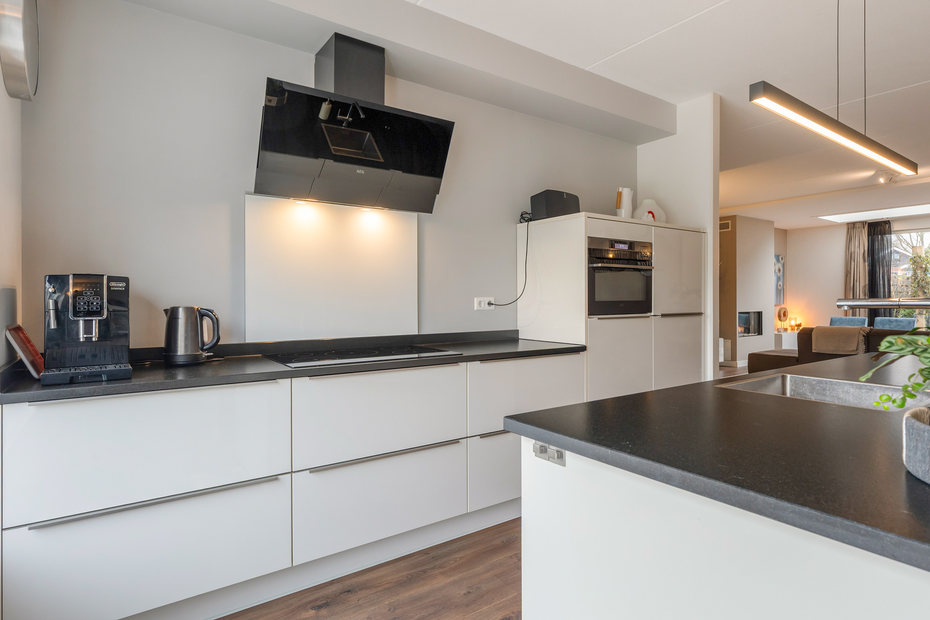 Binnen ervaart u direct de royale opzet en de moderne afwerking. De uitgebouwde living en de woonkeuken vormen samen een lichte, open leefruimte waarin het uitzicht en het daglicht een hoofdrol spelen. Grote raampartijen, deur naar de tuin en een luxe lichtstraat zorgen voor een constante verbinding tussen binnen en buiten. De gashaard in de woonkamer voegt warmte en sfeer toe en onderstreept het moderne, maar tegelijkertijd uitnodigende karakter van de woning.