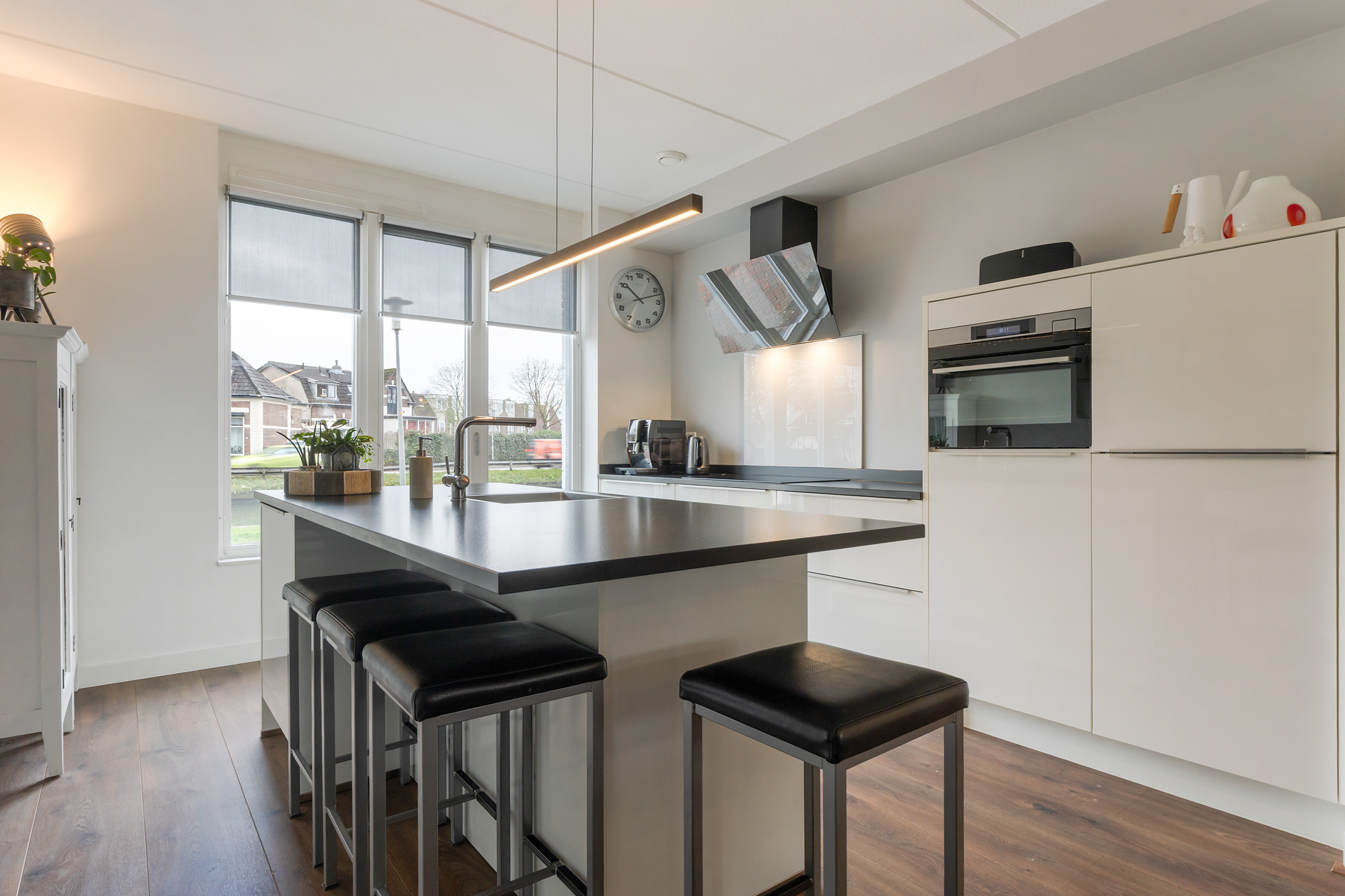 Aan de voorzijde ligt de woonkeuken, waar u vanuit de ramen vrij uitzicht heeft over het Apeldoorns Kanaal. De hoogglans witte keukenopstelling met eiland is uitgevoerd met een zwart composiet werkblad en voorzien van complete en hoogwaardige inbouwapparatuur. Het eiland vormt een vanzelfsprekend middelpunt voor gezellig samen zijn, terwijl het water en de kade het decor vormen.