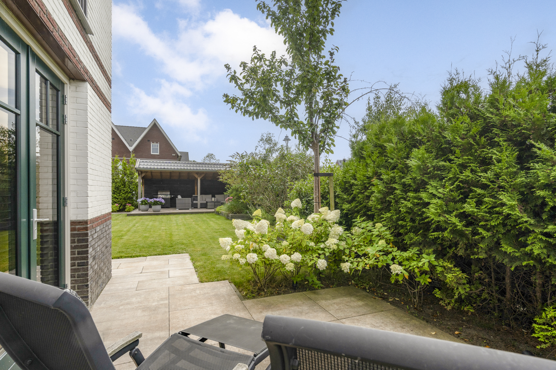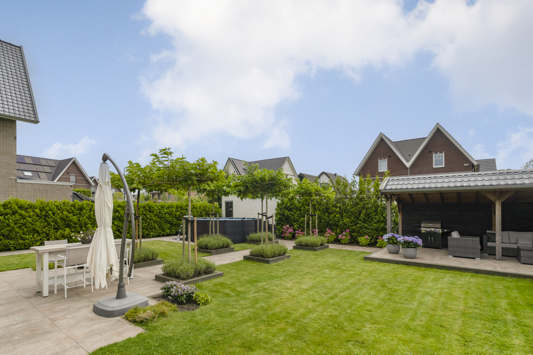 Via meerdere openslaande deuren vanuit de woonkamer heeft u toegang tot de tuin. De fraai aangelegde achtertuin is ingericht met meerder loungeplekjes, een overkapping met heater en toegang tot de garage.
