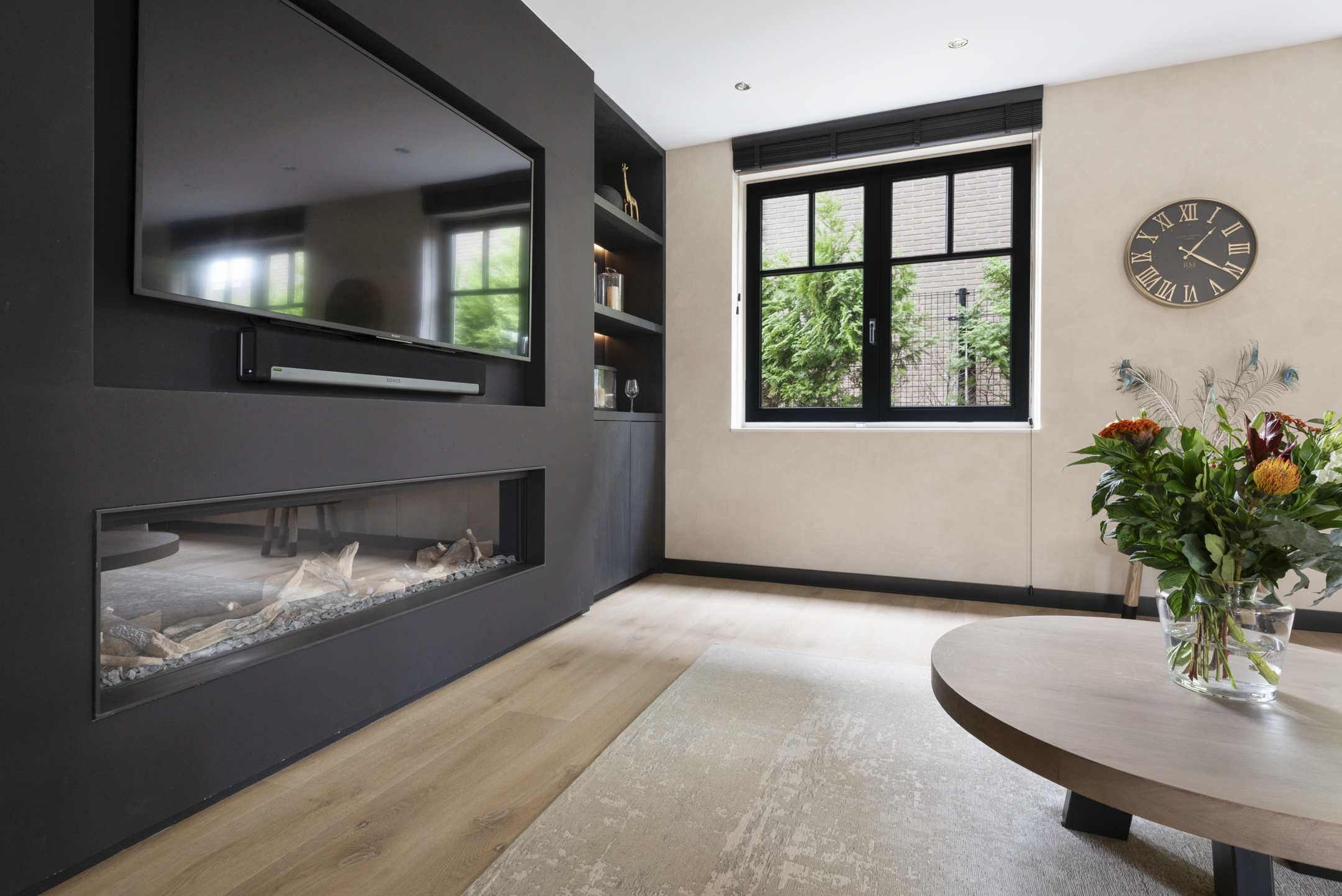 De ruime woon- en eetkamer biedt plek voor het hele gezin, met een op maat gemaakte cinewall en sfeervolle HR-gashaard voor extra warmte en gezelligheid.