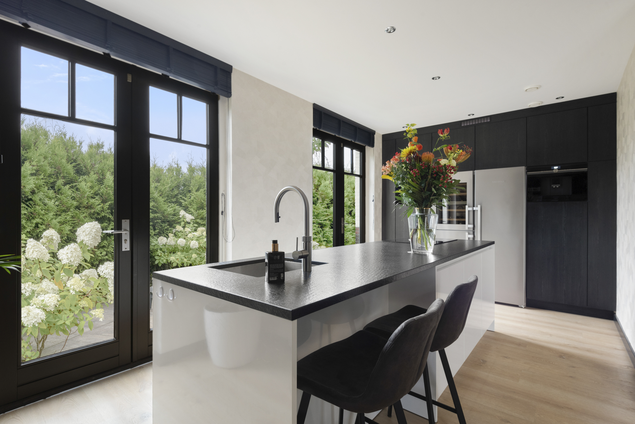 De luxe keuken met kookeiland is uitgerust met hoogwaardige inbouwapparatuur, waaronder een Miele stoomoven, wijnklimaatkoeling, Siemens combi oven, inbouwkoffiemachine, Bora inductiekookplaat met geïntegreerde afzuiging, Siemens vaatwasmachine en een koel- vriescombinatie.