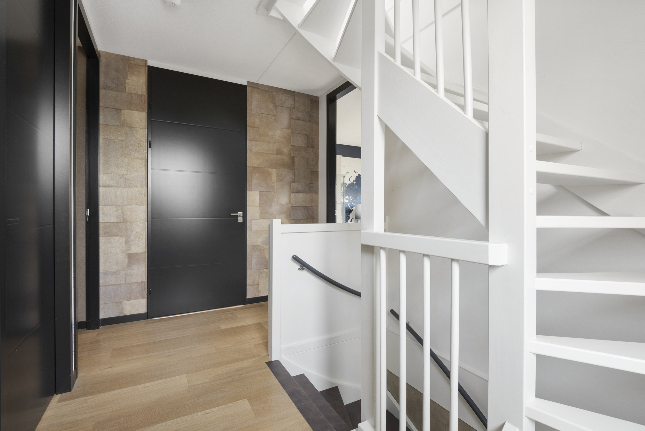 Begane grond; Bij binnenkomst wordt u verwelkomd in een royale hal met garderoberuimte, een stijlvol trappenhuis met leren trapbekleding en een modern toilet. De begane grond is voorzien van een stijlvolle PVC-vloer met vloerverwarming én vloerkoeling. Vanuit de hal kijkt u direct uit op de ruime achtertuin, wat meteen een gevoel van openheid geeft.