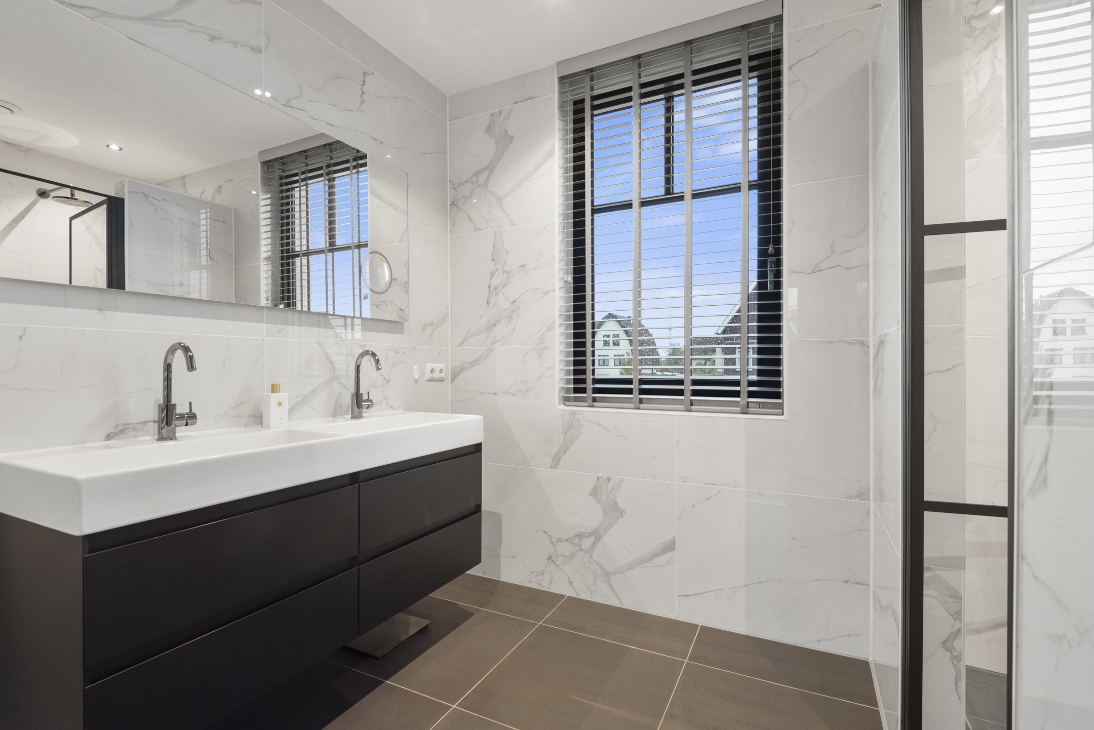 Eerste verdieping; Op de eerste verdieping bevinden zich drie royale slaapkamers, allemaal voorzien van grote ramen en/of Franse balkons, wat zorgt voor een mooie lichtinval. De luxe badkamer heeft een dubbele wastafel met meubel en een ruime dubbele douche. Op de overloop bevindt zich een separaat toilet.