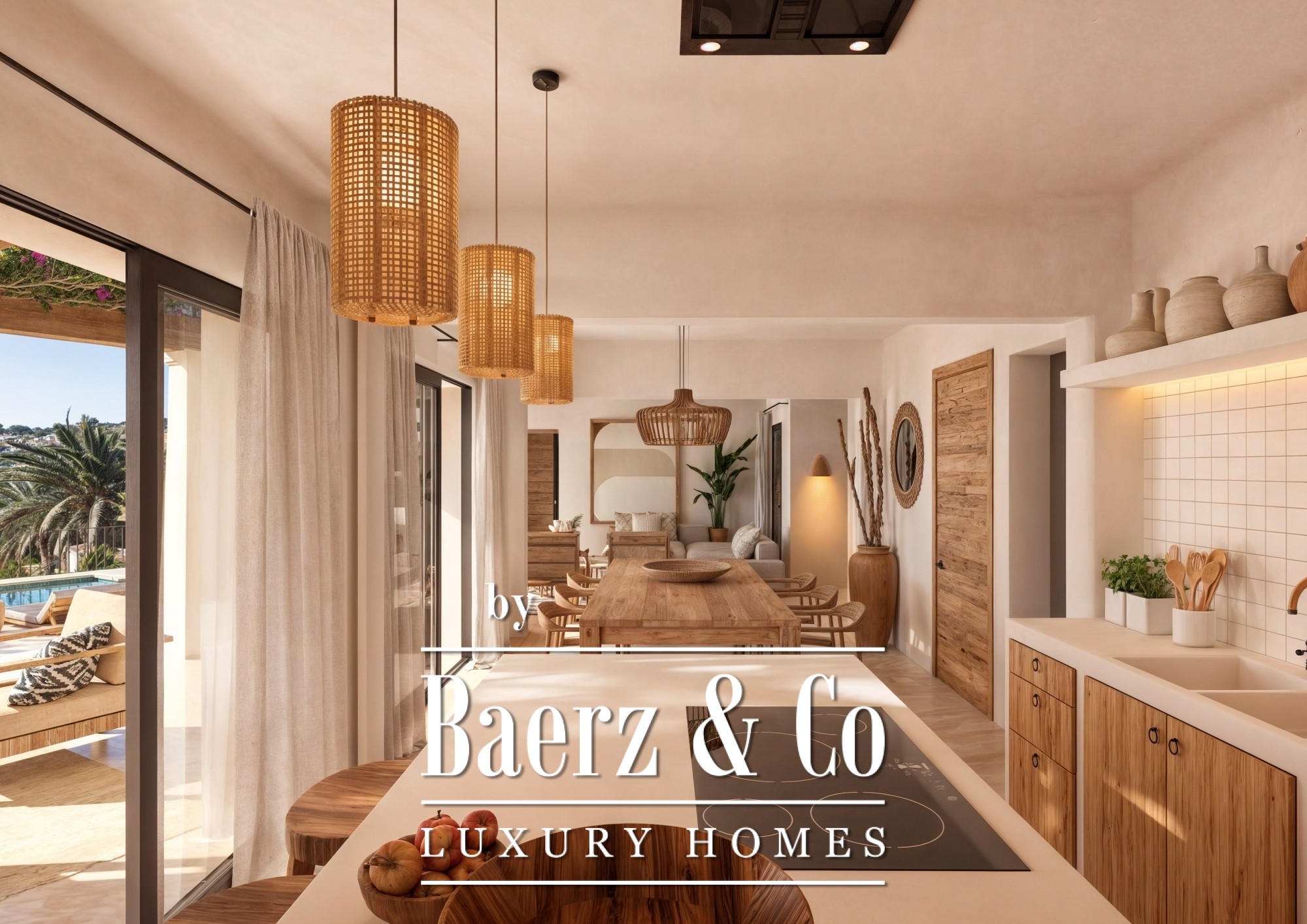 De architectuur is strak en hedendaags, maar dankzij natuurlijke materialen, zachte kleuren en warme texturen straalt de woning een uitnodigende, huiselijke sfeer uit. Grote raampartijen zorgen voor een vloeiende overgang tussen binnen en buiten, zodat je op elk moment van de dag kunt genieten van het uitzicht op je eigen tuin, het zwembad en de zee. De ruime en lichte leefruimte vormt samen met de moderne open keuken – voorzien van hoogwaardige apparatuur – het kloppende hart van de villa. Vanuit de woonkamer wandel je moeiteloos naar het zonnige terras en de sfeervolle naya, waar je een privézwembad, verschillende loungeplekken en een stijlvolle buitenkeuken uitnodigen tot ontspanning en gezelligheid.