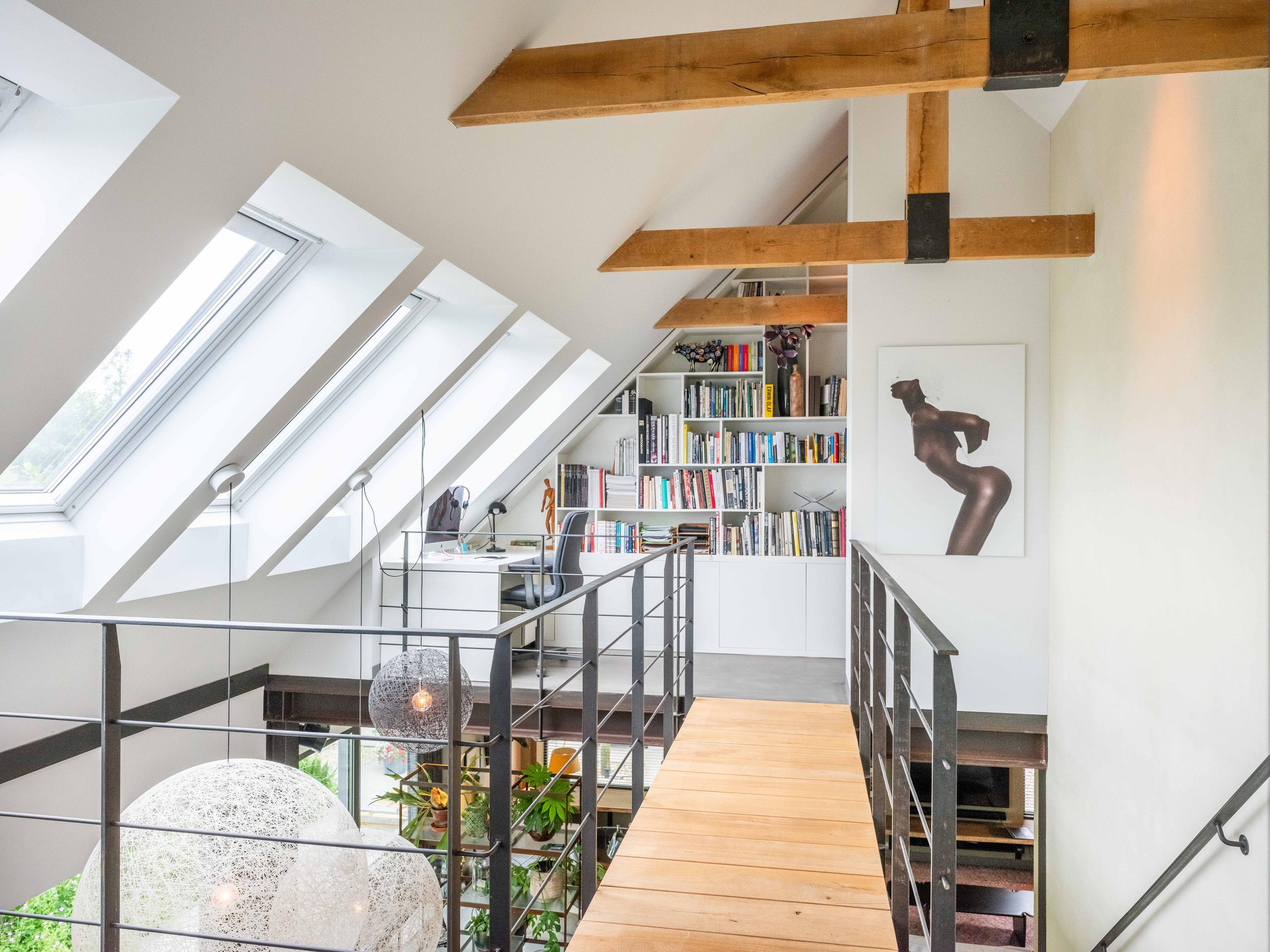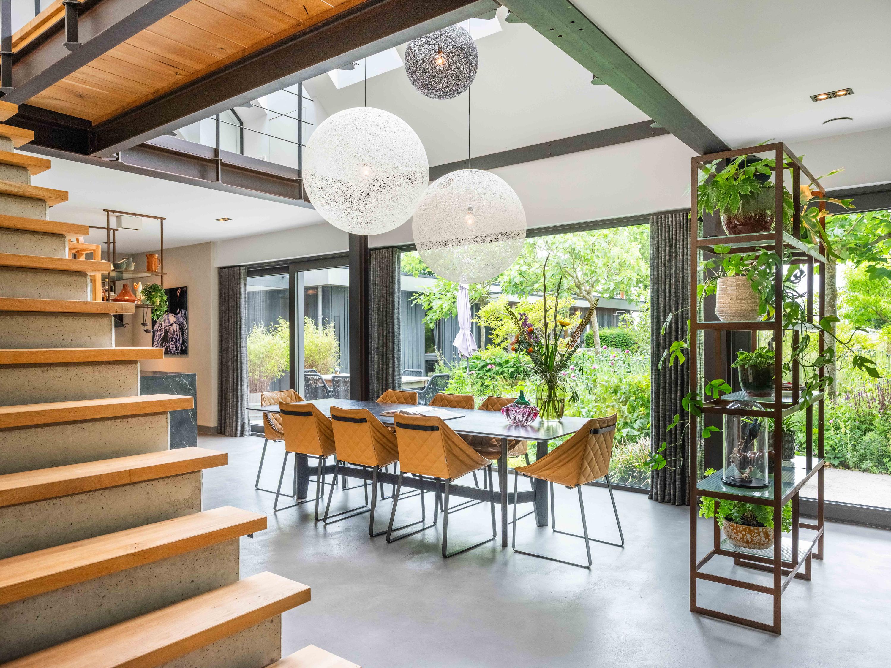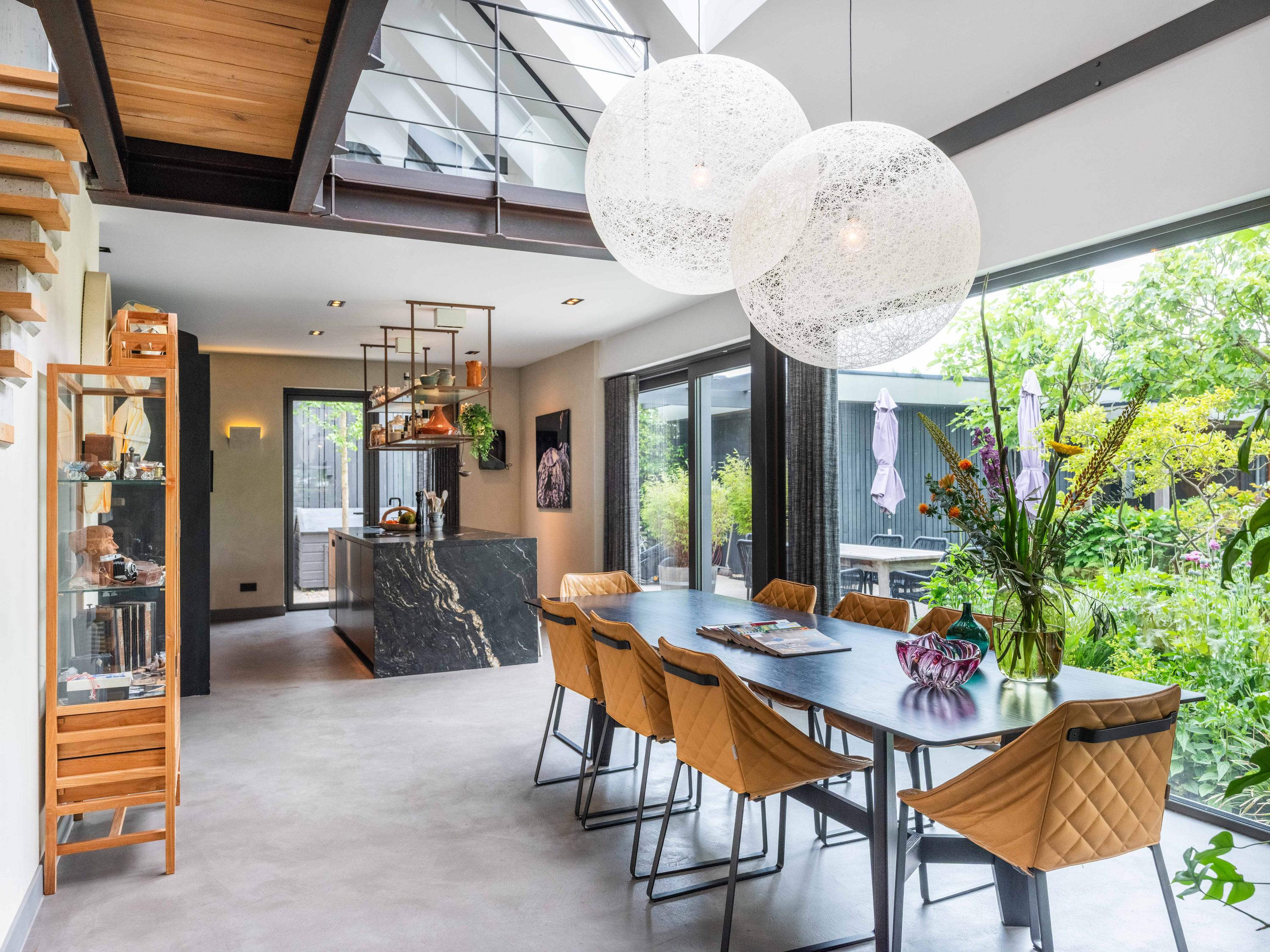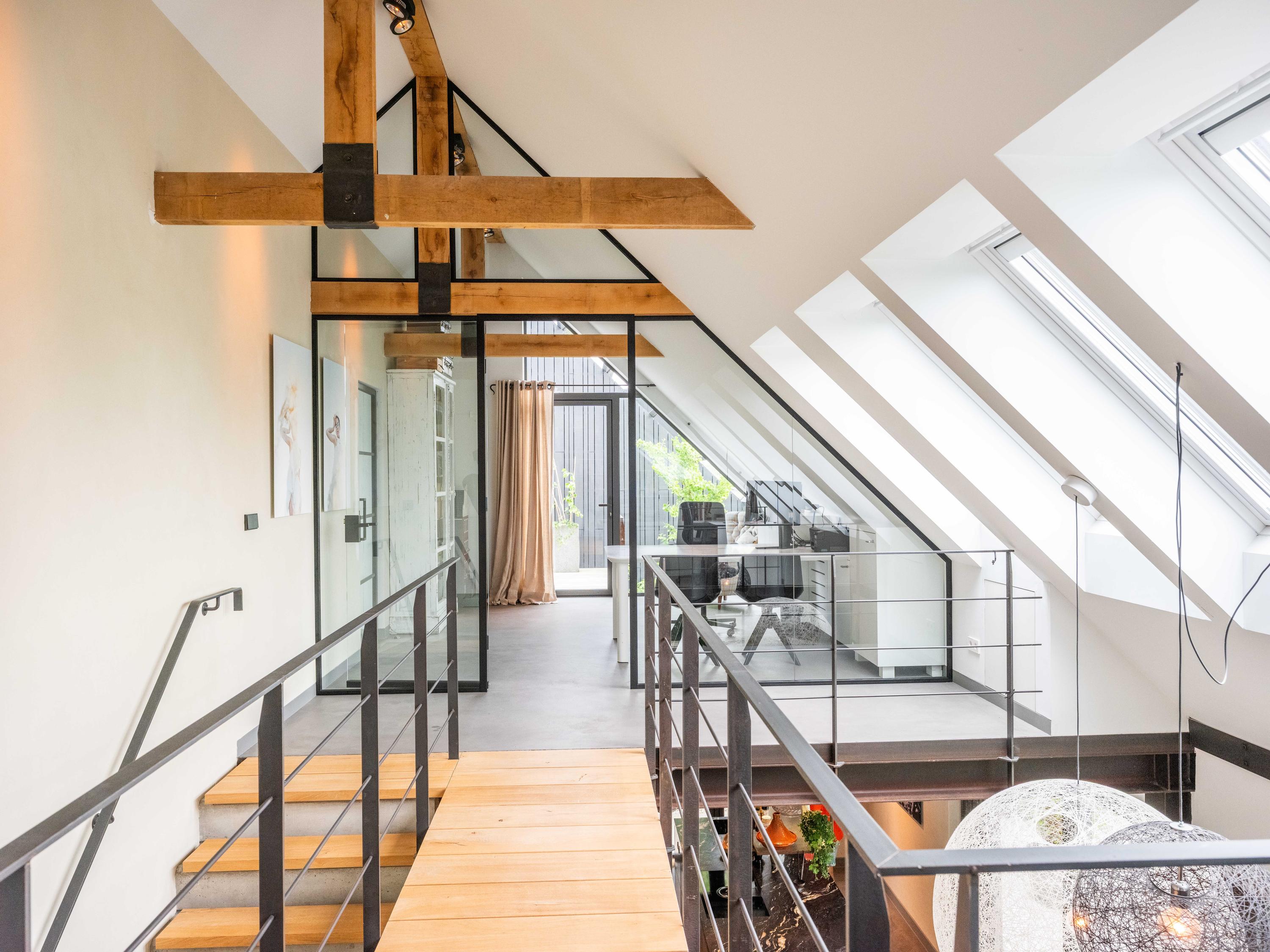 We nemen u graag mee naar binnen. Via de entree betreden we de sfeervolle woonkamer met open keuken. De keuken is volledig uitgerust en biedt alles wat het hart van de kookliefhebber begeert. Wat direct opvalt, zijn de grote raampartijen die zorgen voor een prachtige lichtinval en een weids uitzicht op de groene tuin en de omliggende weilanden. Ook de trap naar de verdieping is een ware blikvanger – een architectonisch hoogstandje dat karakter toevoegt aan de ruimte. Het huis is als een loft opgezet met volledig open karakter.