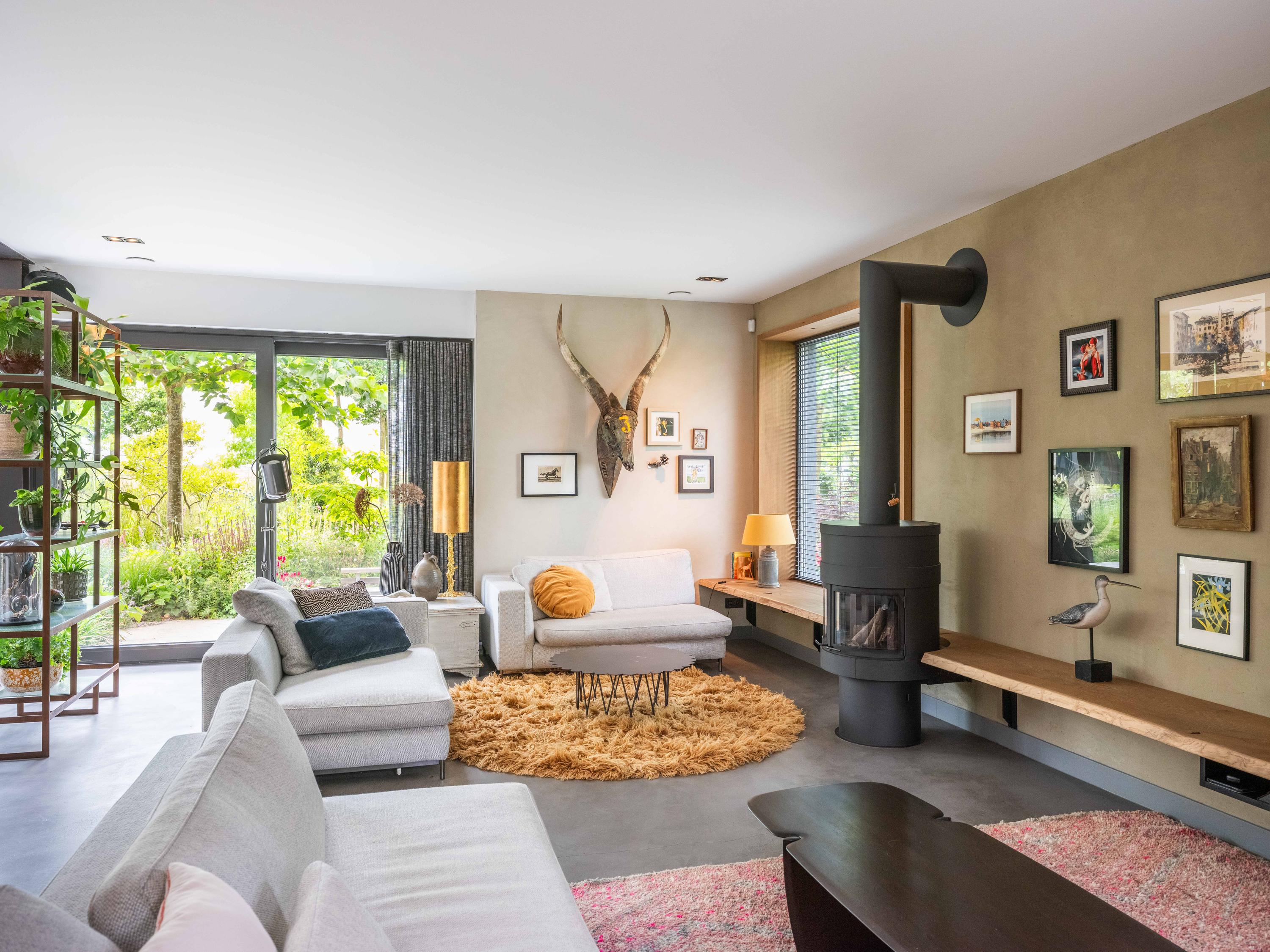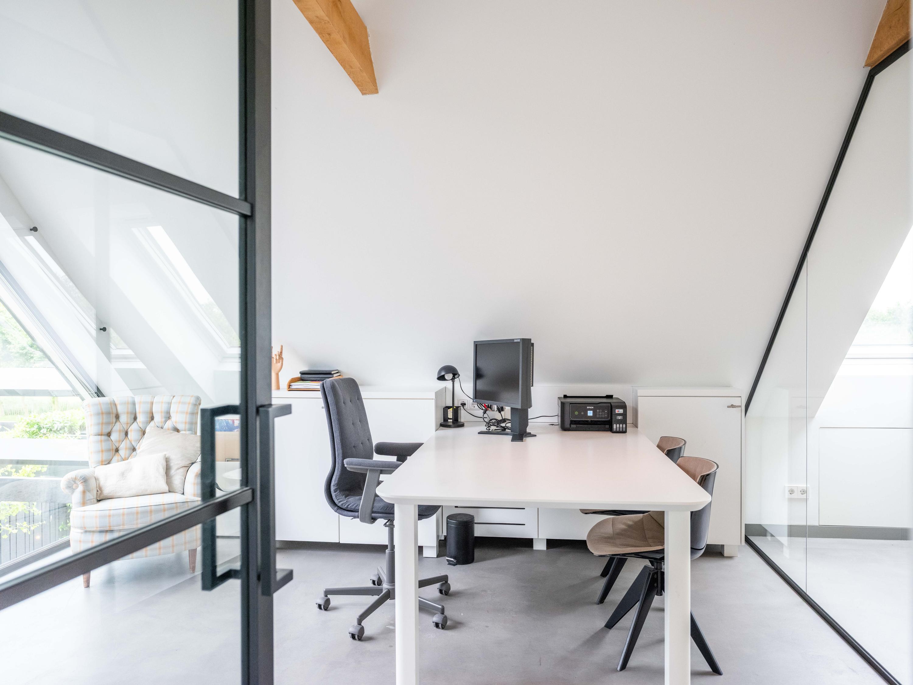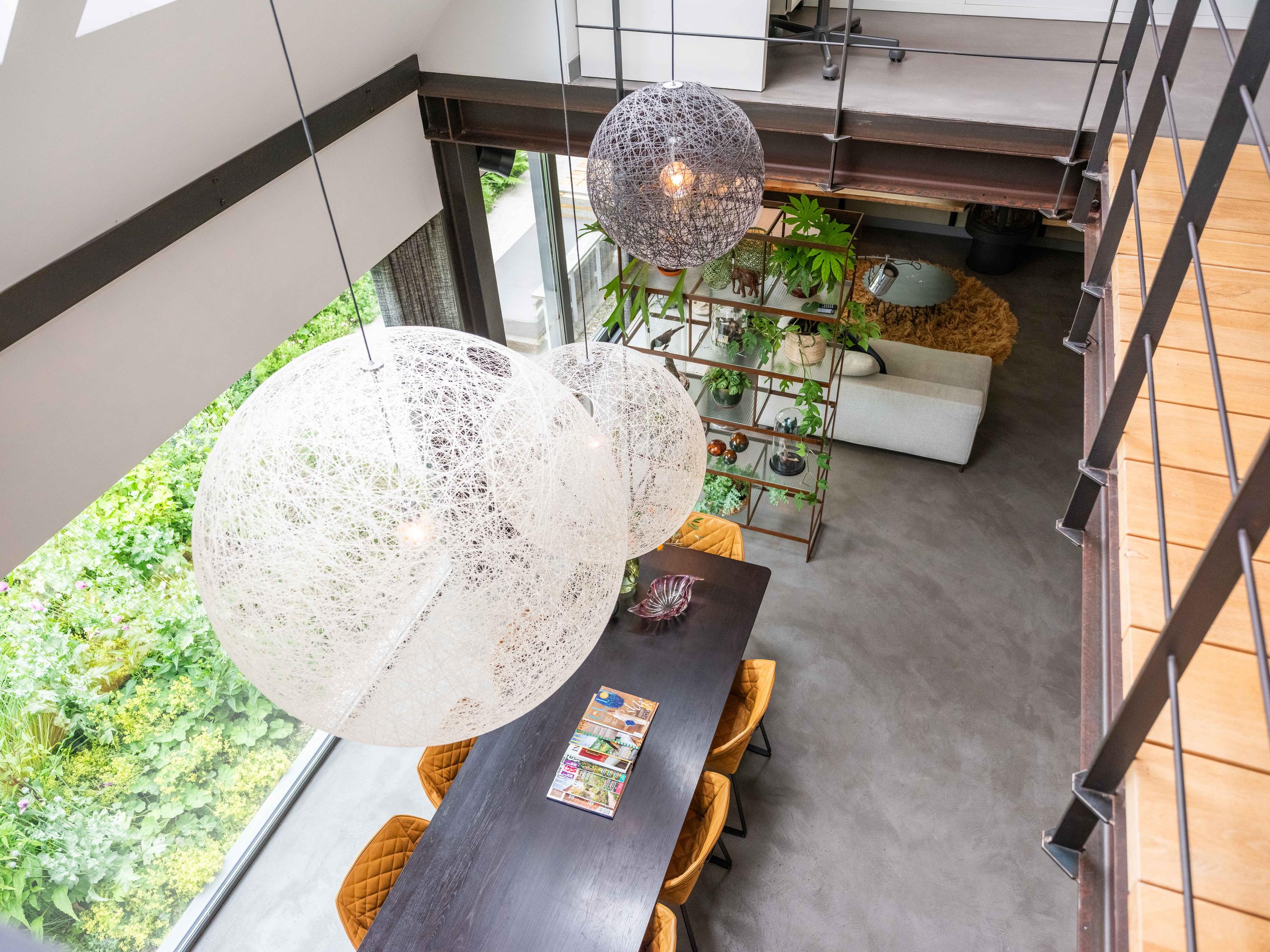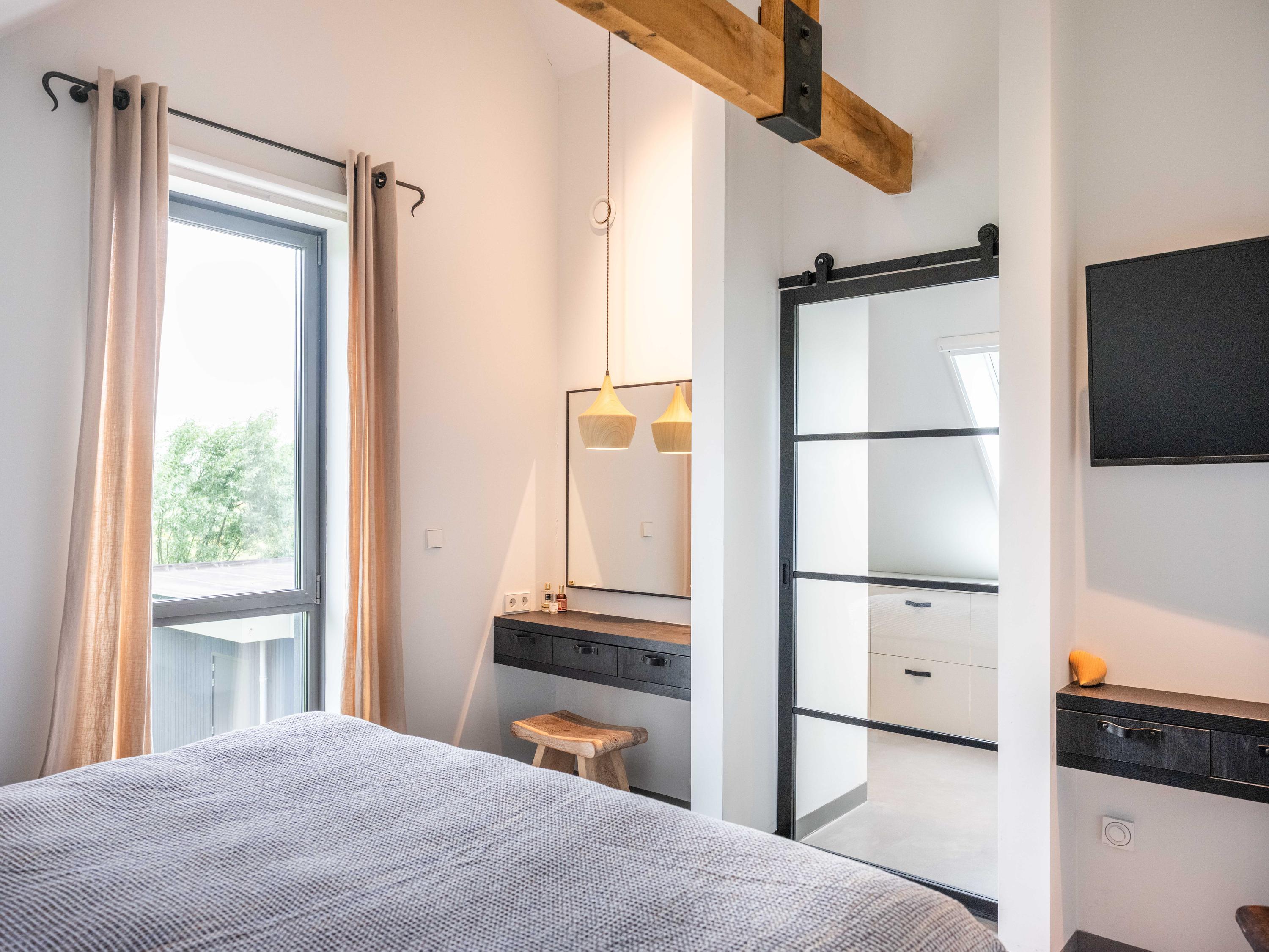 We nemen u graag mee naar binnen. Via de entree betreden we de sfeervolle woonkamer met open keuken. De keuken is volledig uitgerust en biedt alles wat het hart van de kookliefhebber begeert. Wat direct opvalt, zijn de grote raampartijen die zorgen voor een prachtige lichtinval en een weids uitzicht op de groene tuin en de omliggende weilanden. Ook de trap naar de verdieping is een ware blikvanger – een architectonisch hoogstandje dat karakter toevoegt aan de ruimte. Het huis is als een loft opgezet met volledig open karakter.