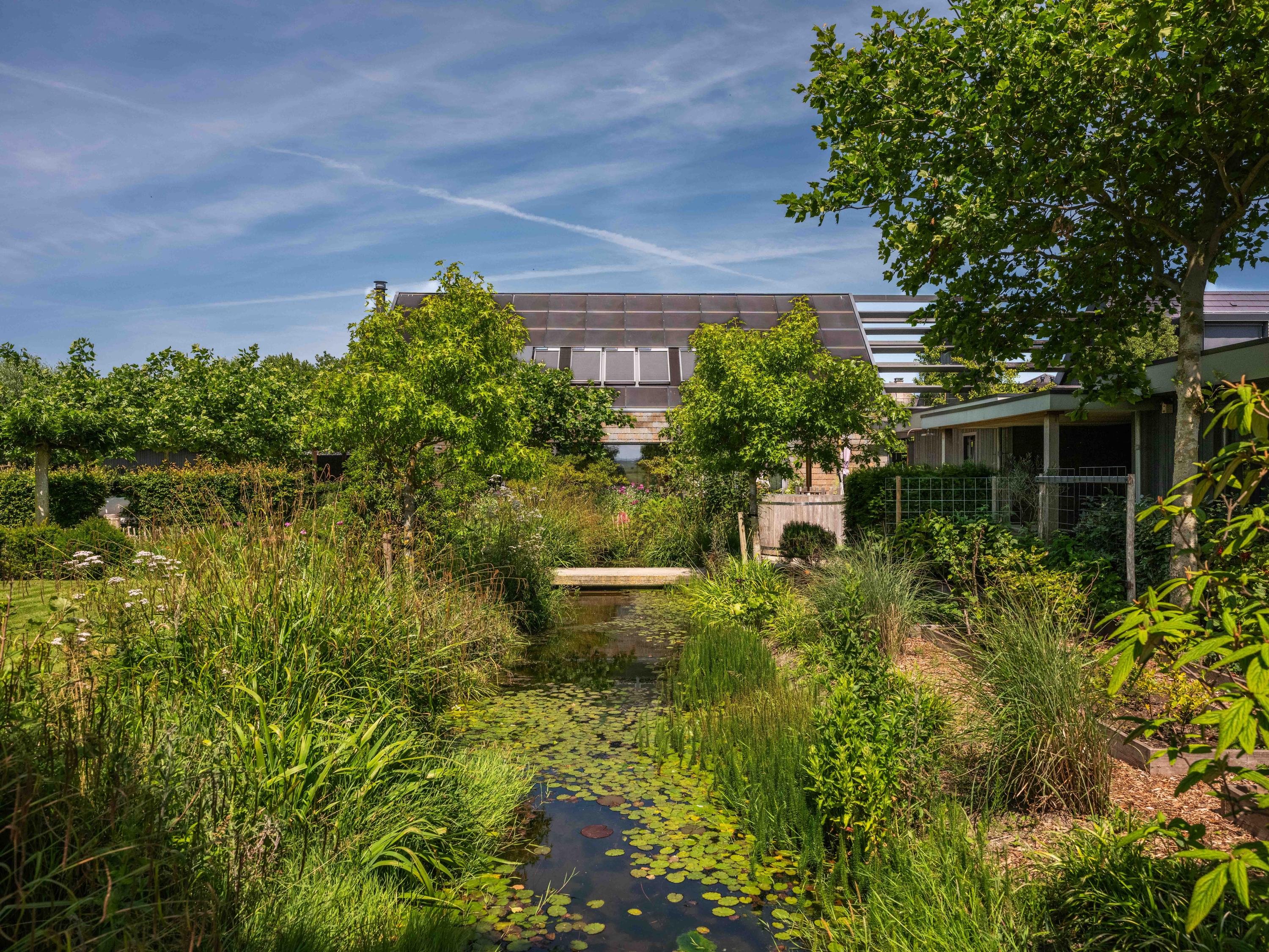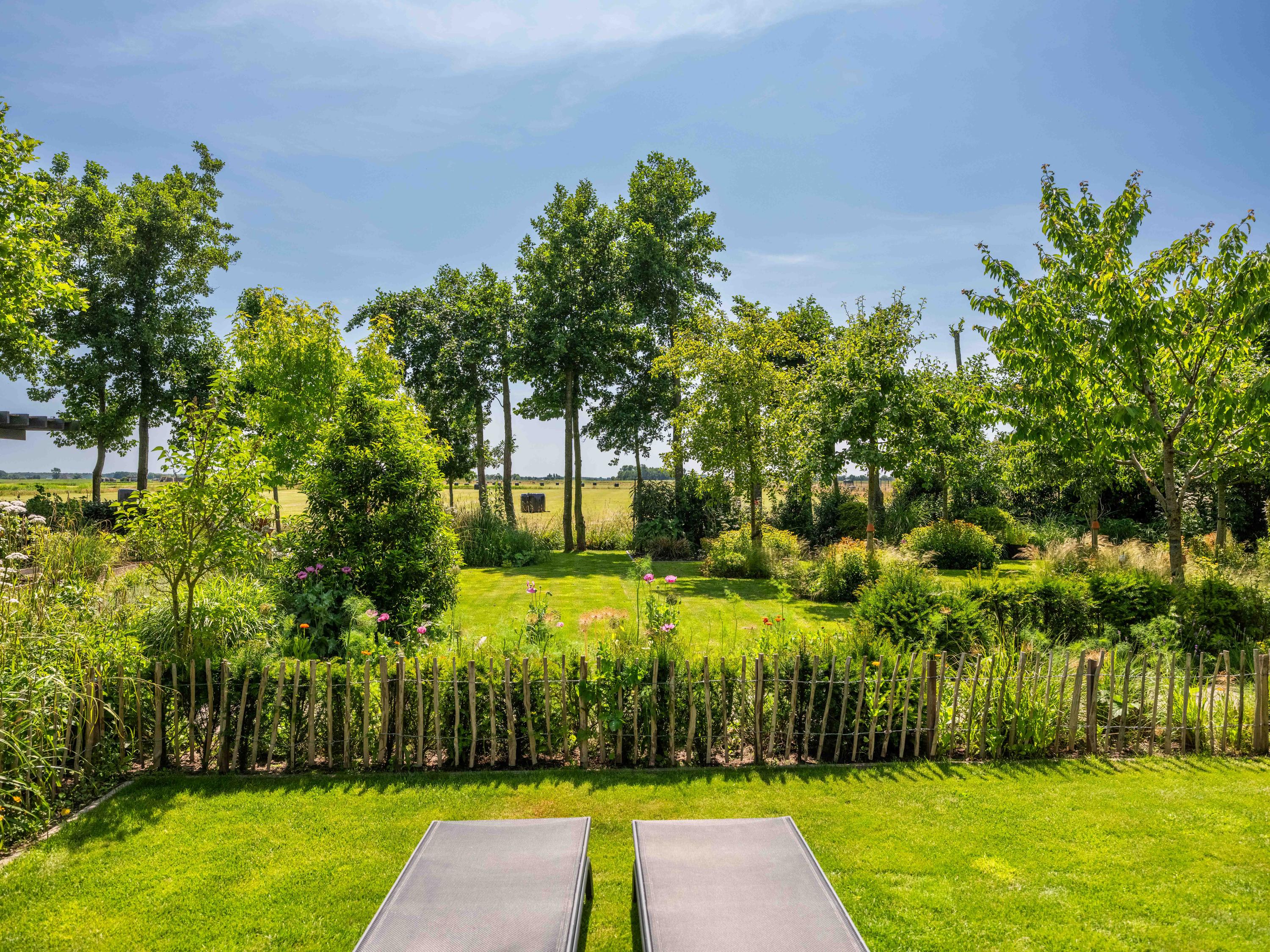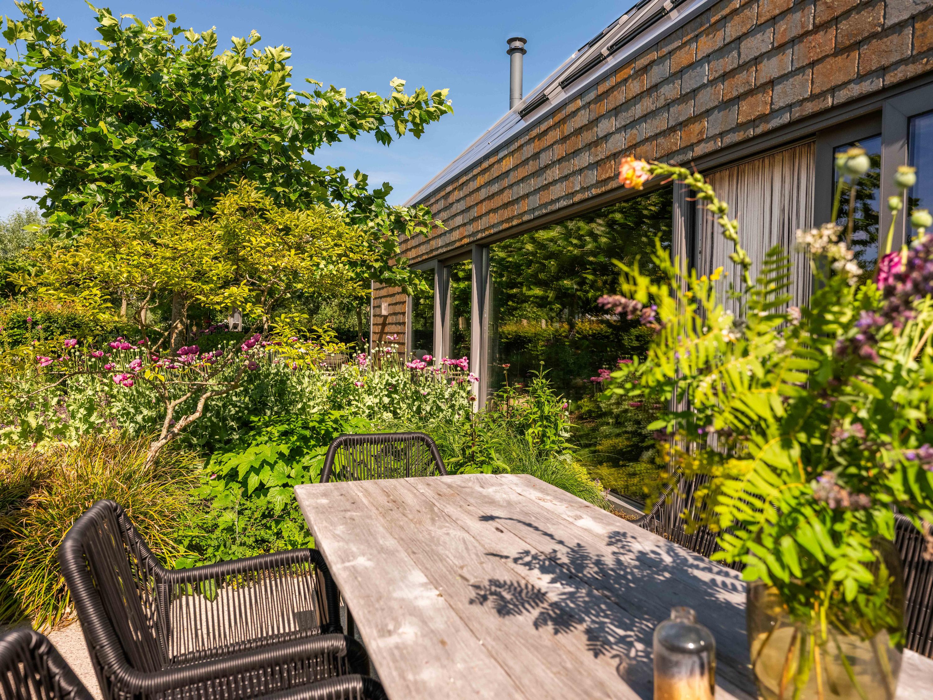 De tuin is een oase van rust en inspiratie, met meer dan fraaie beplanting, verschillende zitjes, een fantastische kas, kippen, zon- en schaduwplekken en een schitterend uitzicht. De kas is direct gekoppeld aan de fraai aangelegde moestuin. De kippen en een fruittuin maken het plaatje daarbij af.
