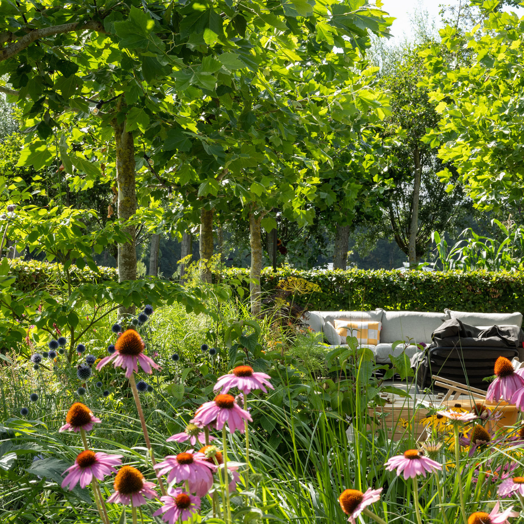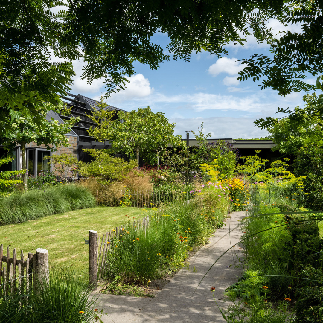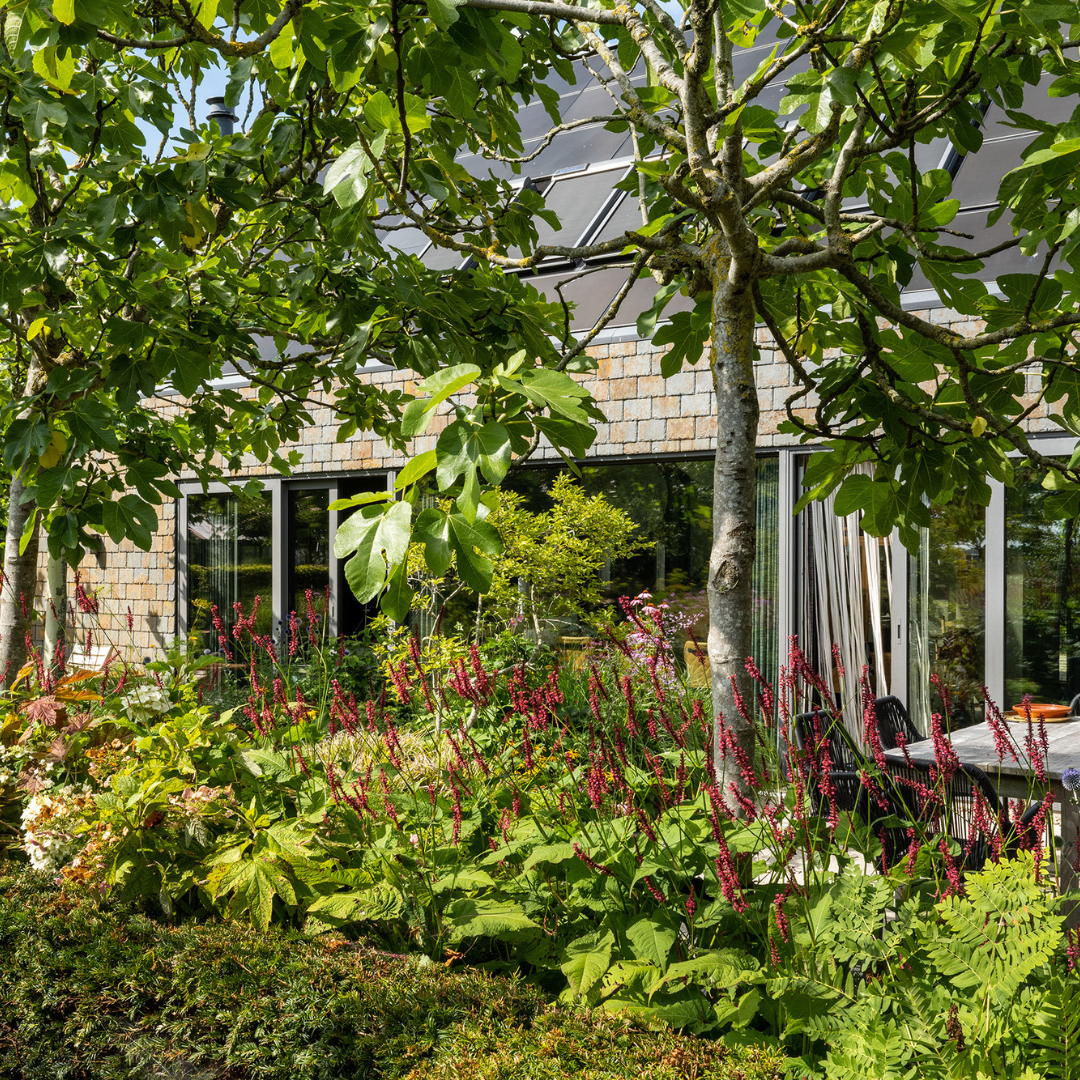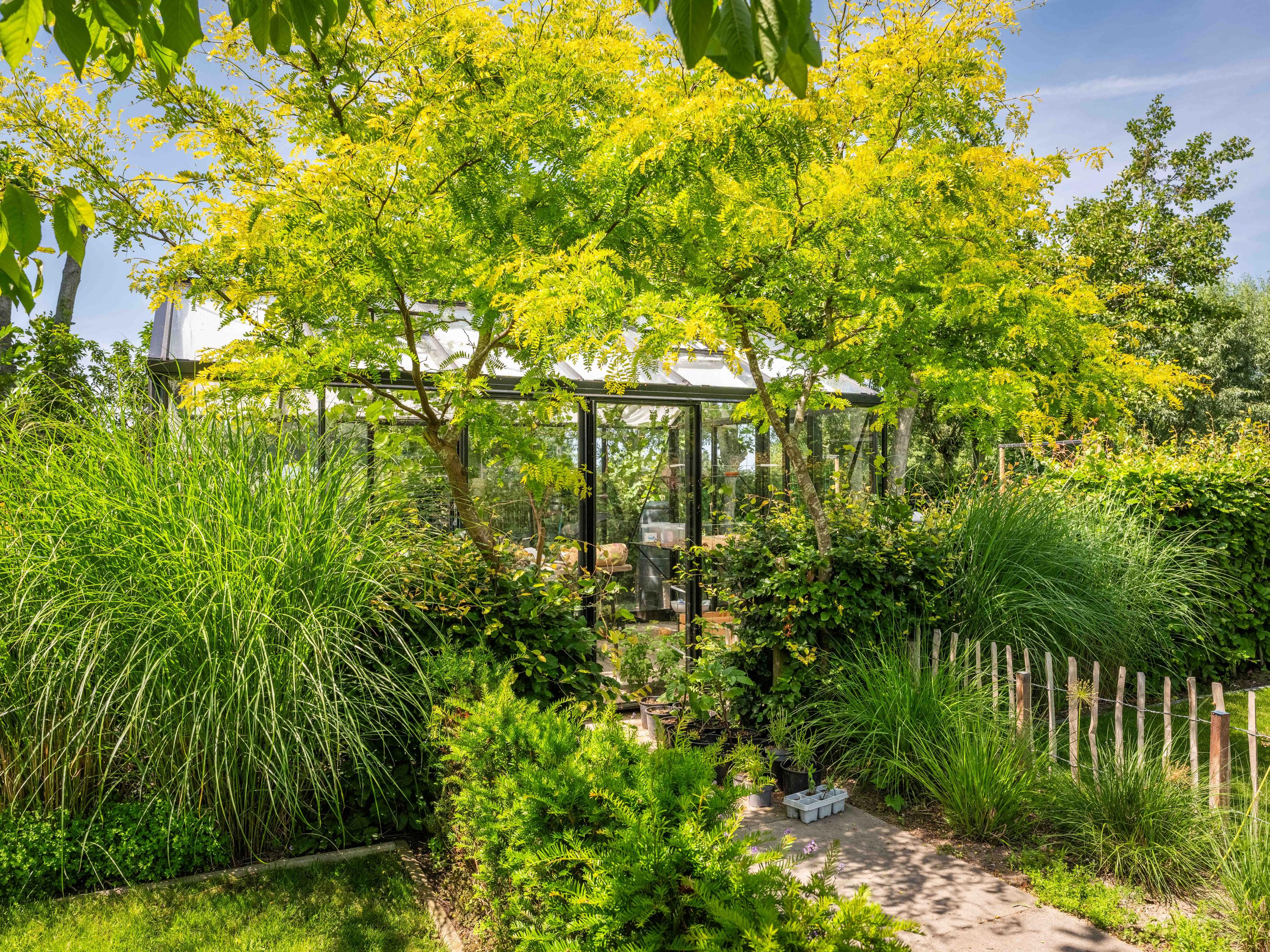 De tuin is een oase van rust en inspiratie, met meer dan fraaie beplanting, verschillende zitjes, een fantastische kas, kippen, zon- en schaduwplekken en een schitterend uitzicht. De kas is direct gekoppeld aan de fraai aangelegde moestuin. De kippen en een fruittuin maken het plaatje daarbij af.