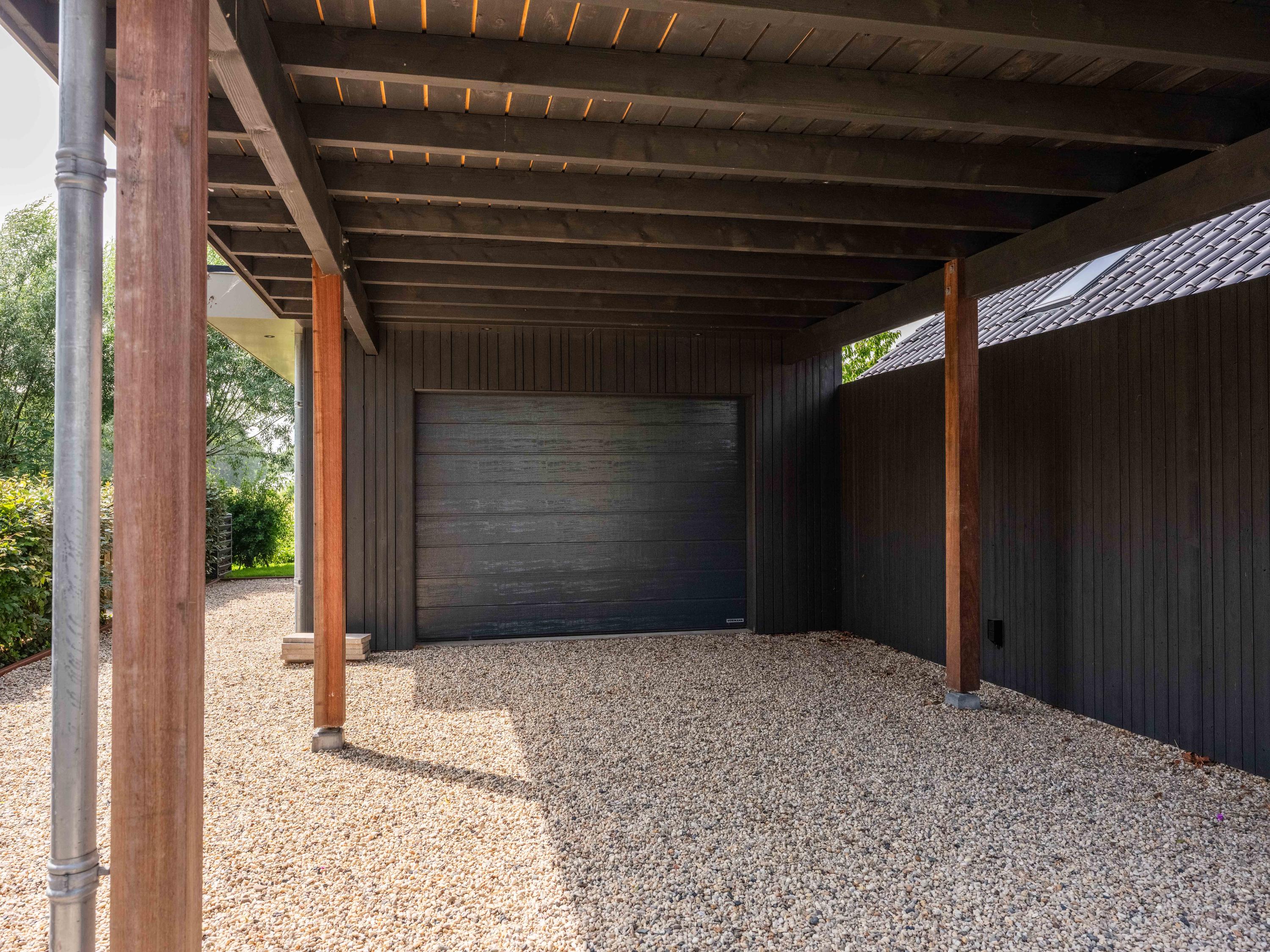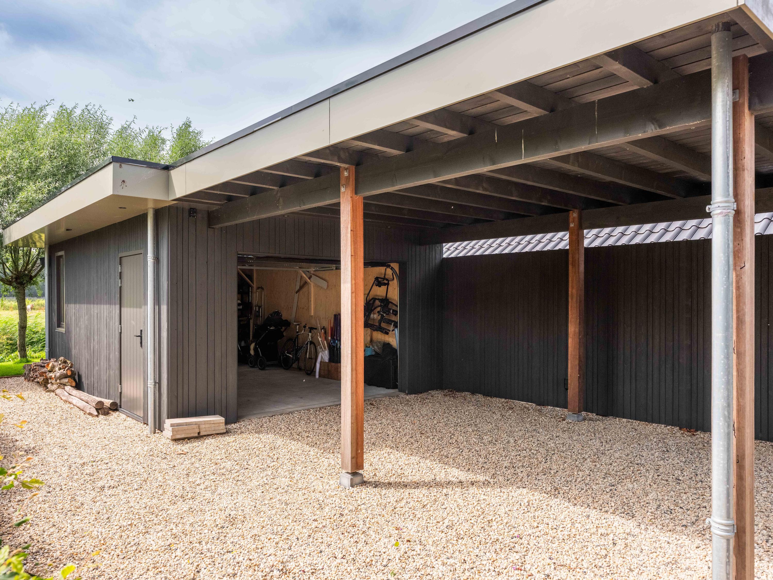 De vrijstaande garage met overdekte carport biedt ruim plek aan de auto en/of andere vervoersmiddelen, maar kan ook prima dienst doen als fijne werkplaats. Op het eigen terrein kunnen eenvoudig meerdere auto's geparkeerd worden.