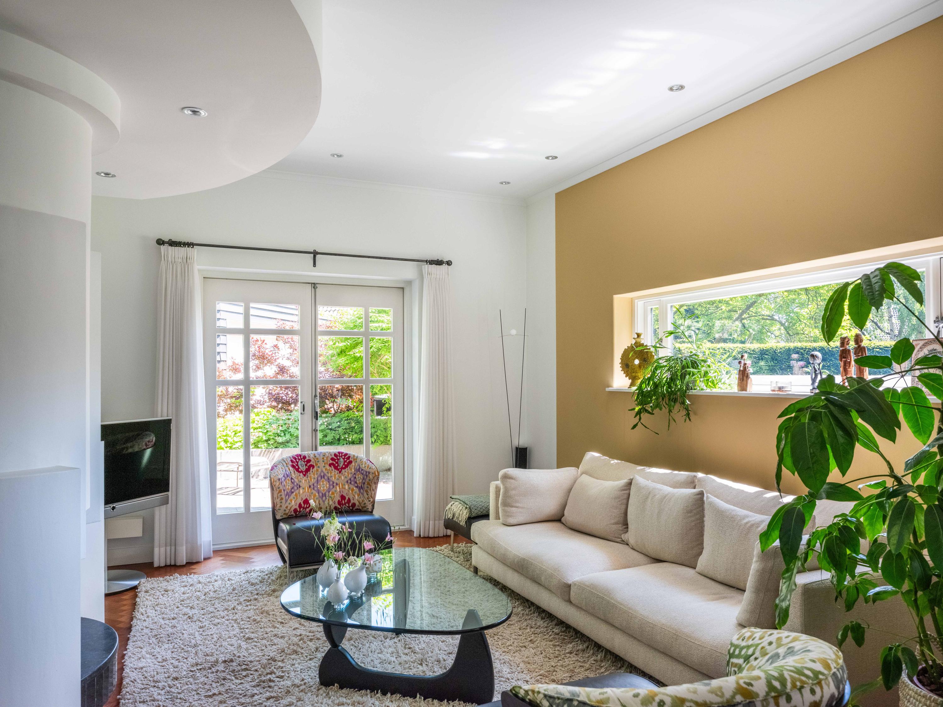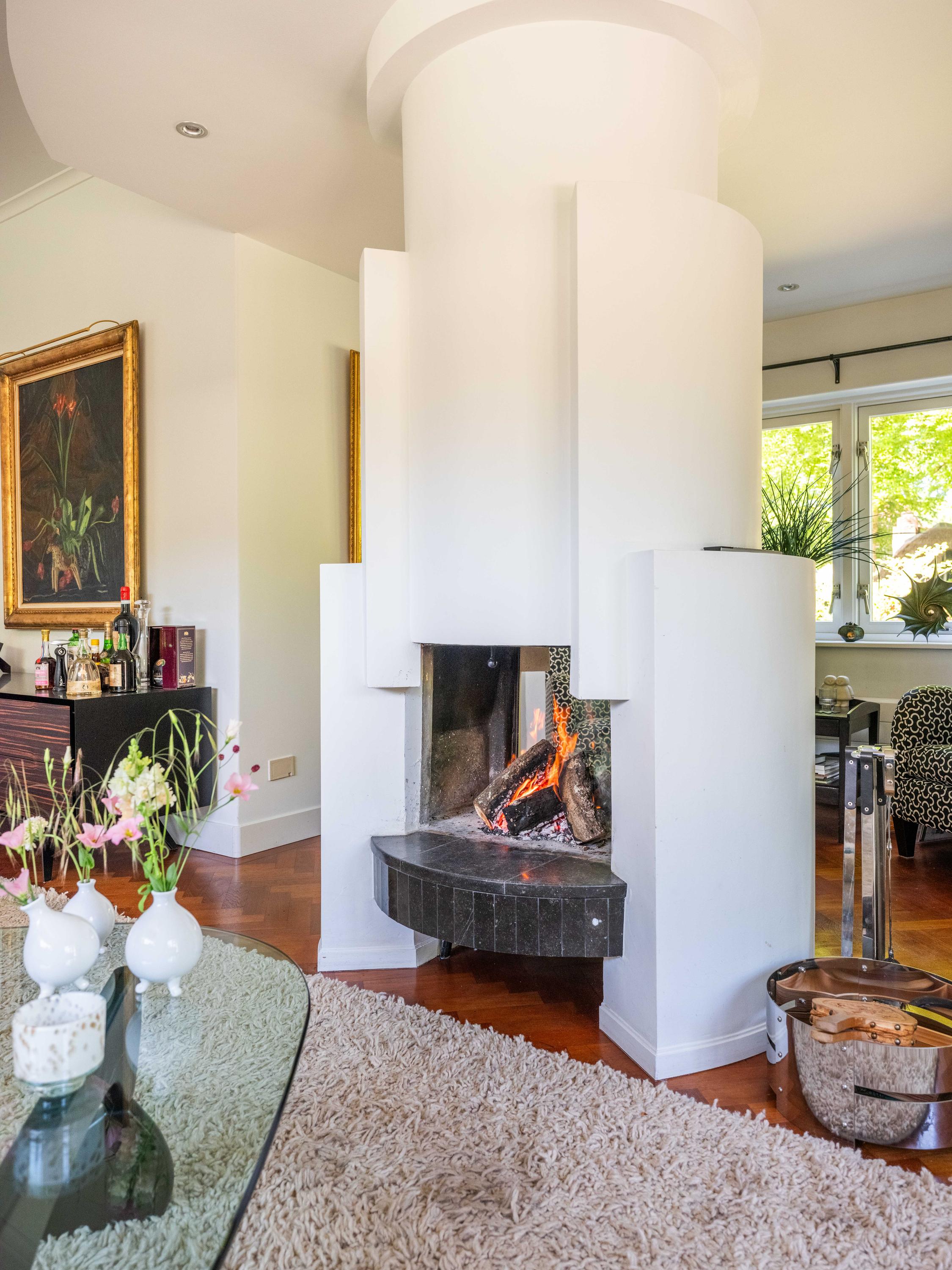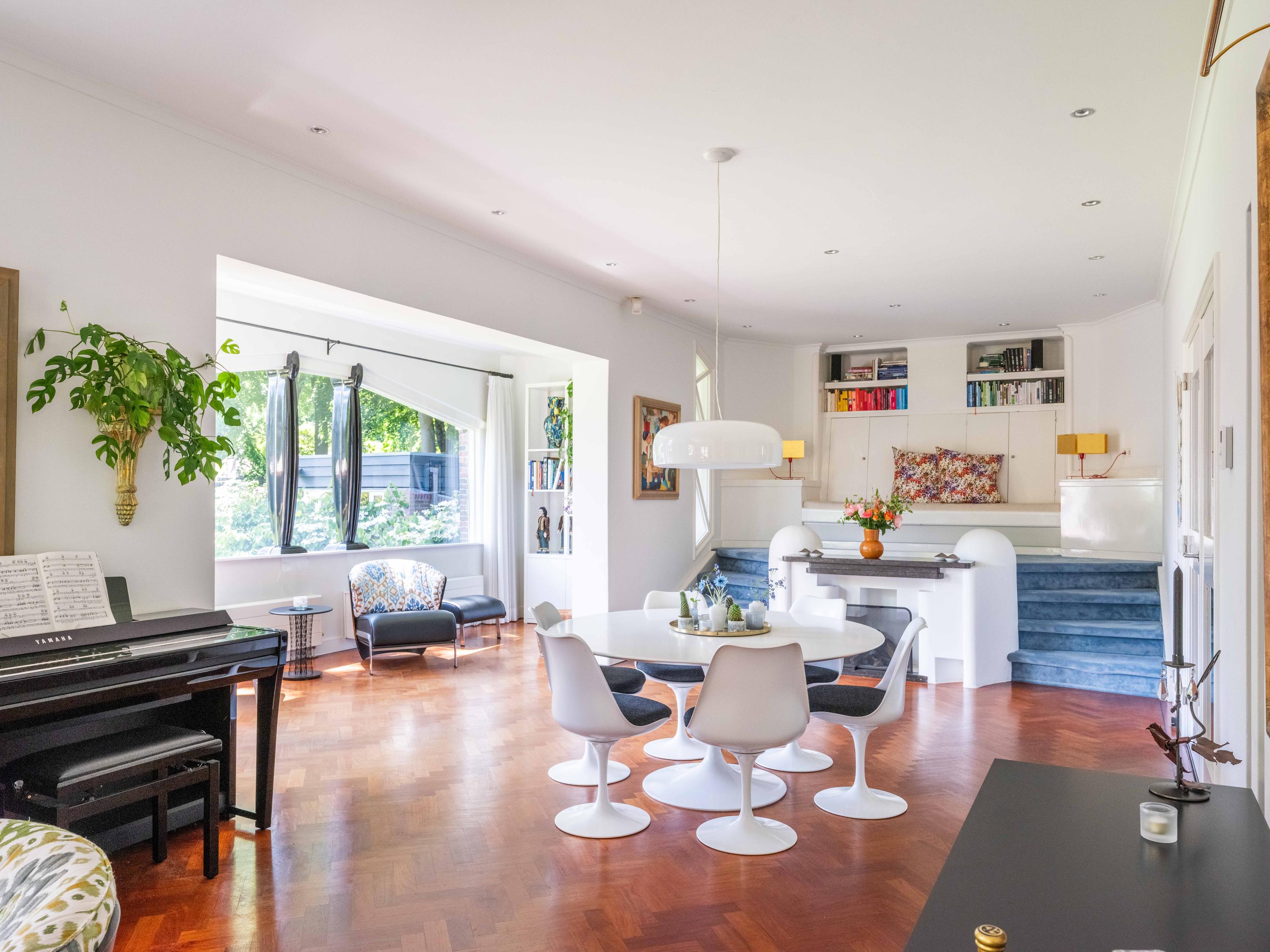 Openslaande deuren leiden naar de royale woonkamer met open haard, een eetgedeelte en serre. Opvallend is het verhoogde gedeelte "de stuurhut". Een mooie parketvloer met bies, de ronde vormen van de open haard , de "kompasbollen" bij de verhoging en het trapeziumvormige raam met kolommen geven het geheel een bijzondere uitstraling.