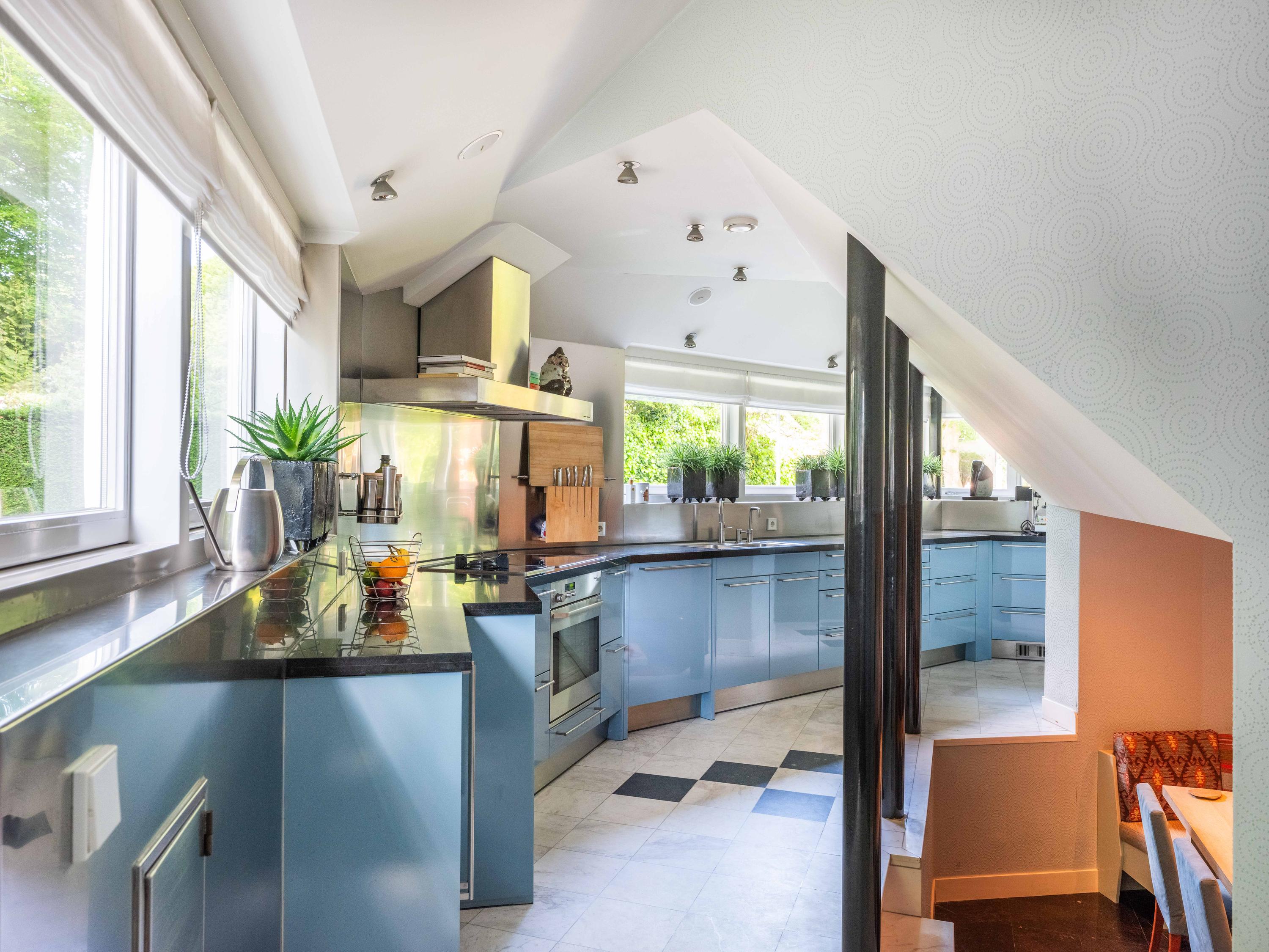 Via de hal bereiken we de woonkeuken voorzien van moderne inbouwapparatuur. Door de vorm, een halve zeshoek, is deze speels en bijzonder van opzet, dit ook door het eetgedeelte, met ruimte voor een grote tafel, dat een niveau lager is gelegen.