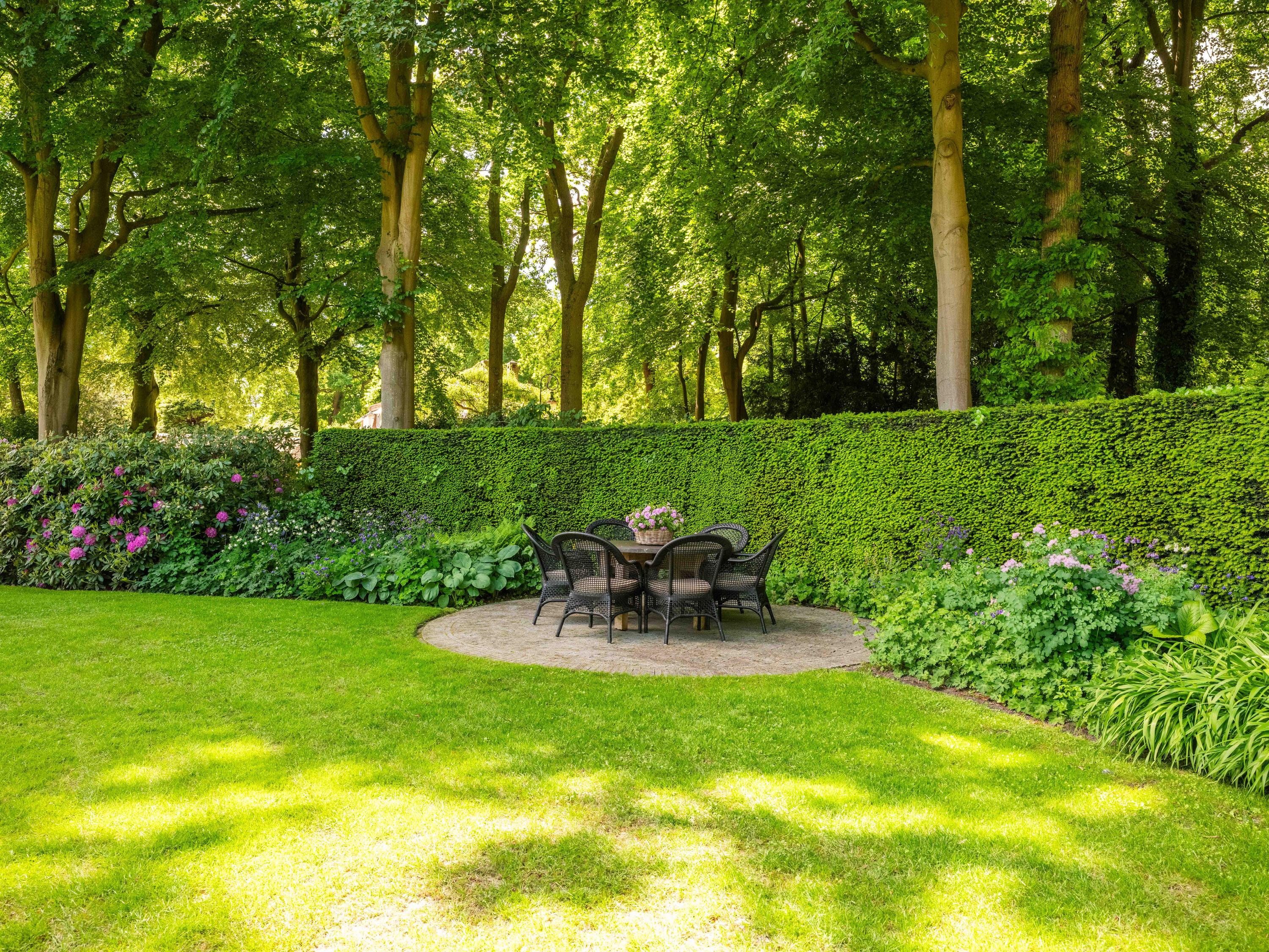De prachtige parktuin met ligusterhagen, bloempartijen en imposante bomen is rondom de villa gelegen. Naast de villa staat een in dezelfde stijl gebouwde en volledig geïsoleerde schuur voor bijvoorbeeld de fiets, tuinspullen, etc. Hier treft men ook de opvang voor het centrale stofzuigersysteem en de pomp en bewateringsinstallatie voor de tuin.