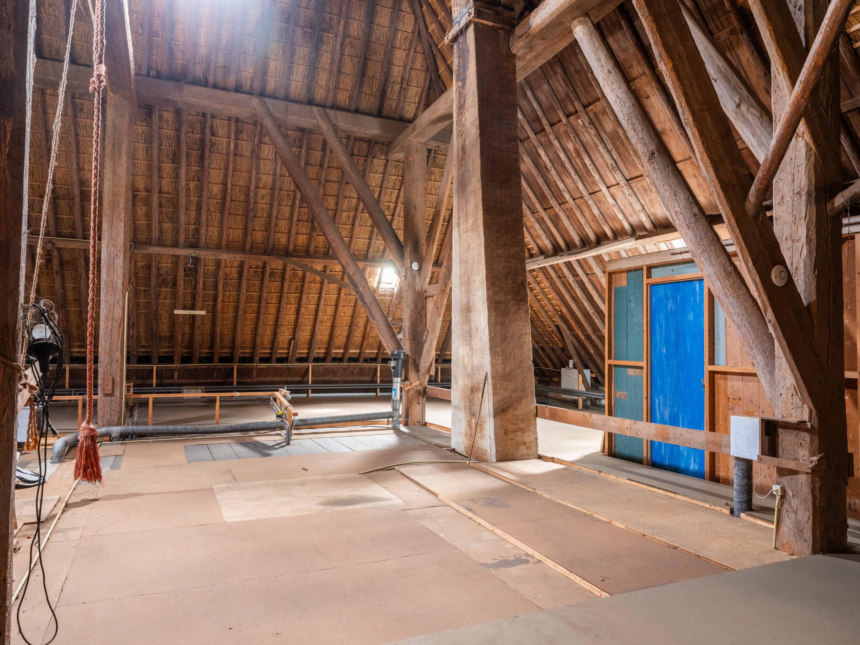 De eerste verdieping van de boerderij, nu een inpandige bergruimte, is nog helemaal naar eigen inzicht in te delen en te verbouwen naar extra woonruimte. Een gigantisch grote ruimte met direct zicht op de houten balken en de rieten kap. Wel vinden we hier nog de oude verwarmde knechtenkamer, deze dient nu als opslagruimte.