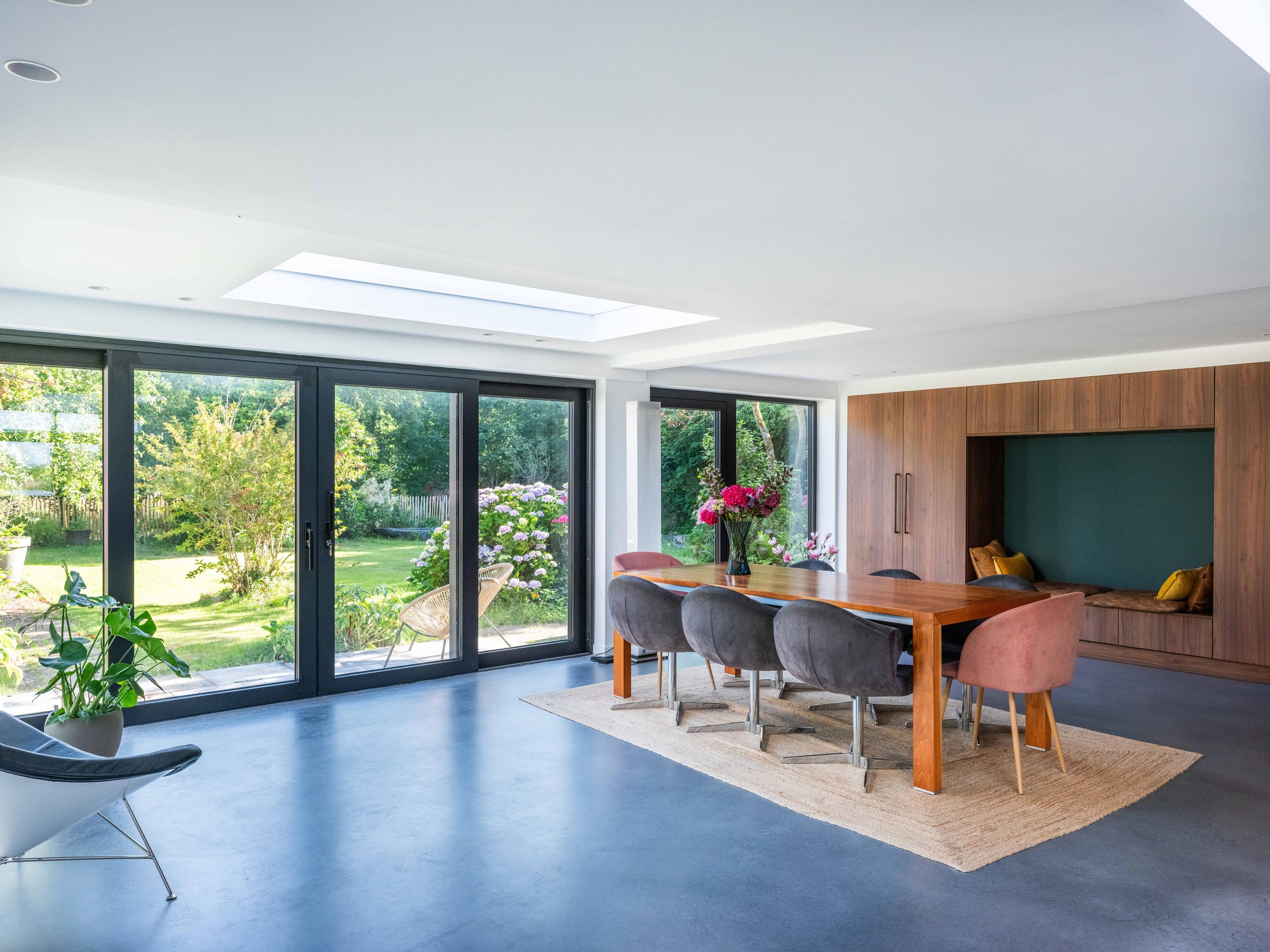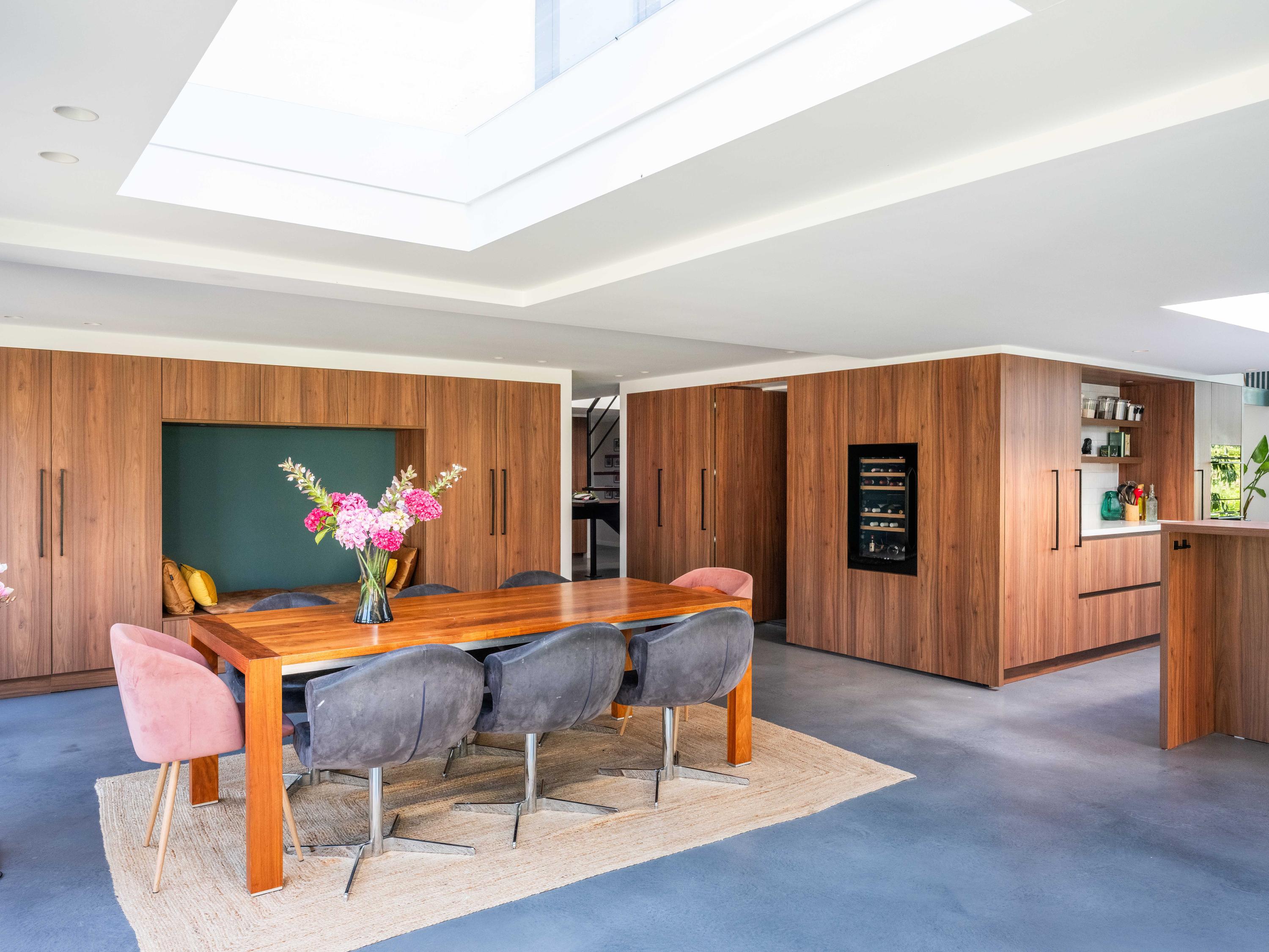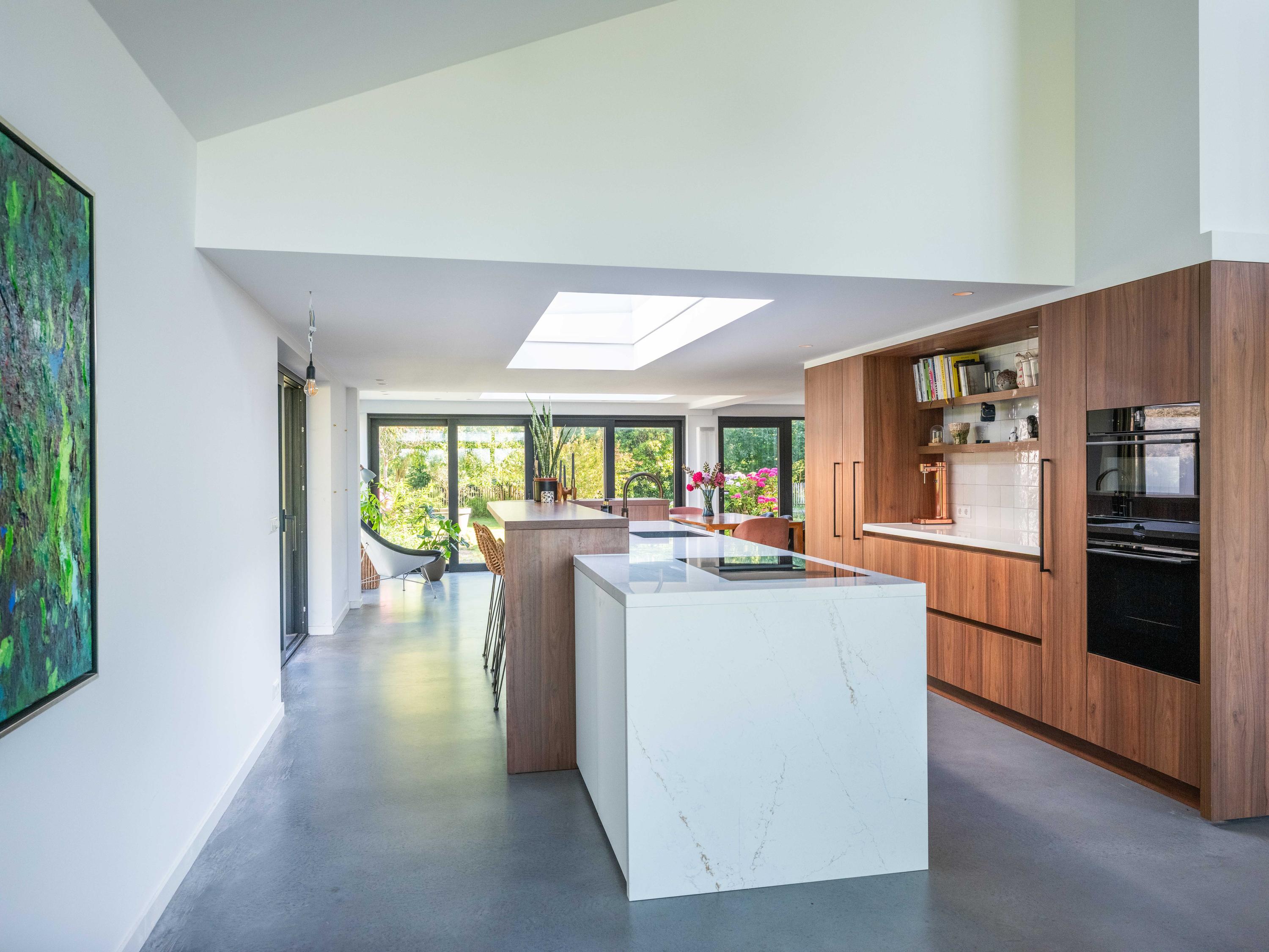 De op maat gemaakte keuken in rijk notenhout is een droom voor iedere kookliefhebber: zeer compleet, met hoogwaardige apparatuur waaronder een luxe wijn wijnklimaatkast. Een architectonisch hoogstandje is de notenhouten wand met verborgen deur; hierachter schuilt een ruimte die perfect dienst kan doen als riante bijkeuken. De zitkamer aan de voorzijde biedt een gezellige speel-/leeshoek en een panoramisch uitzicht over de polder. Aan de achterzijde vindt u de lichte eetkamer met grote dakramen, maatwerkkasten en openslaande deuren naar de tuin.