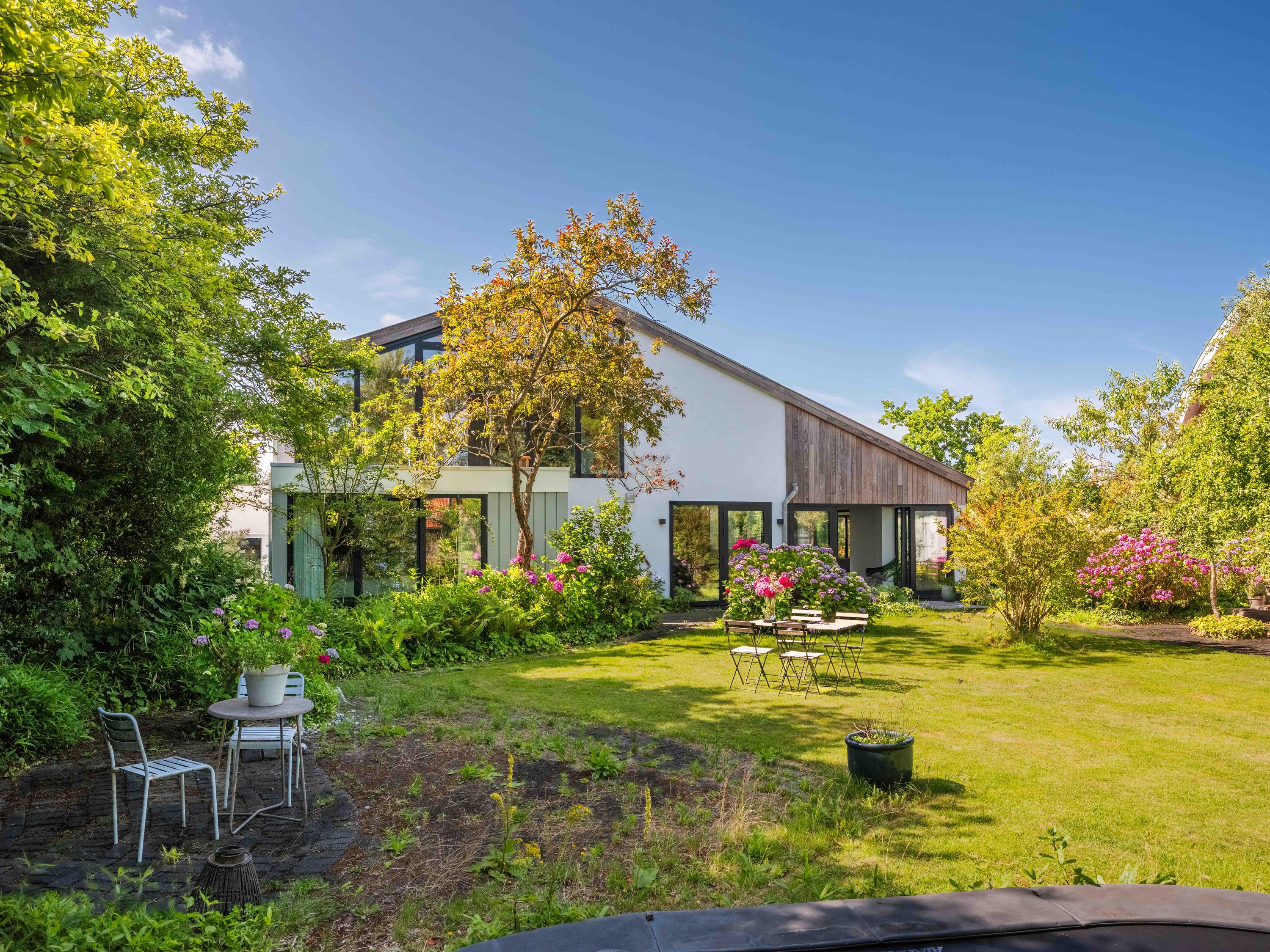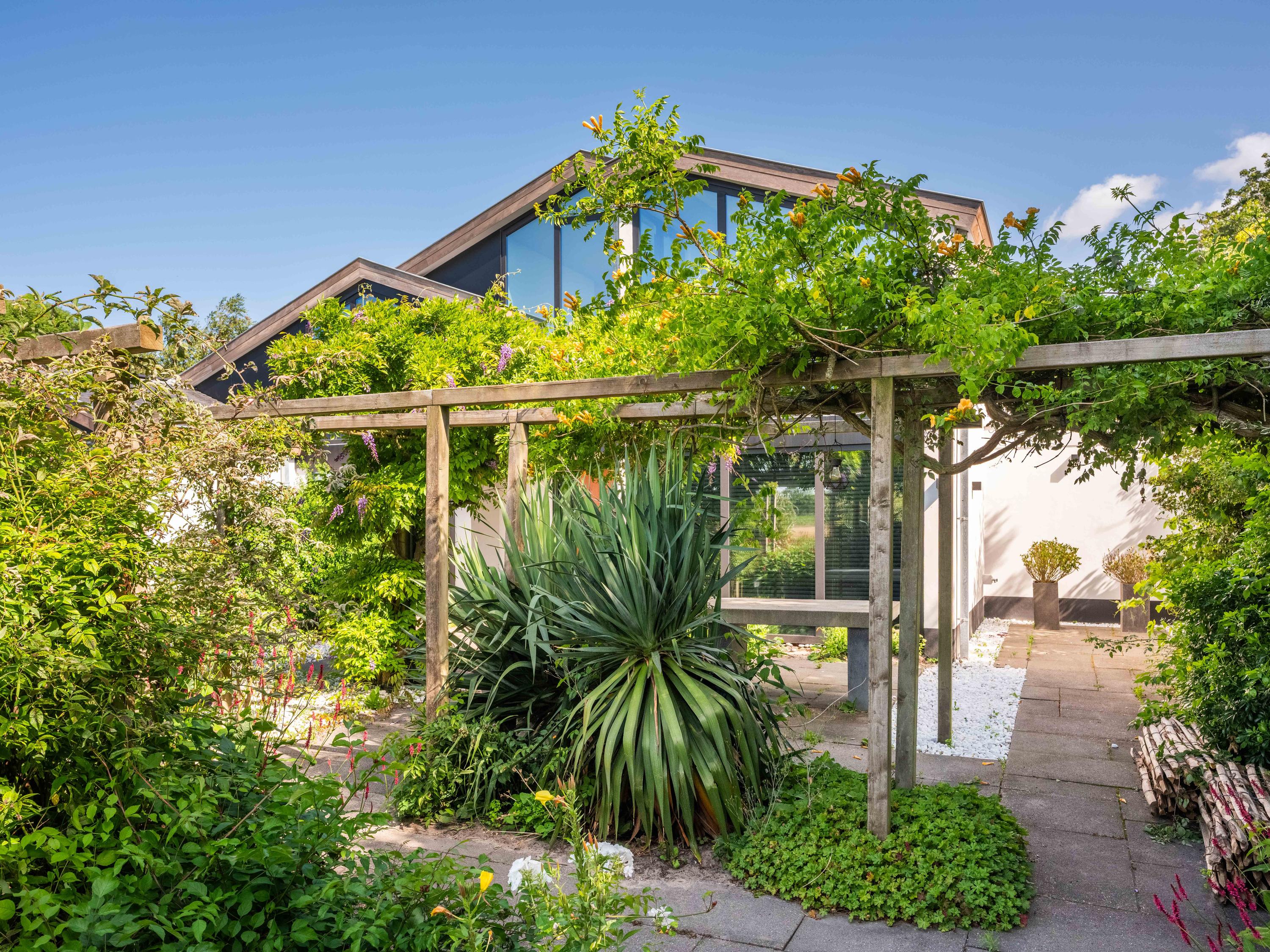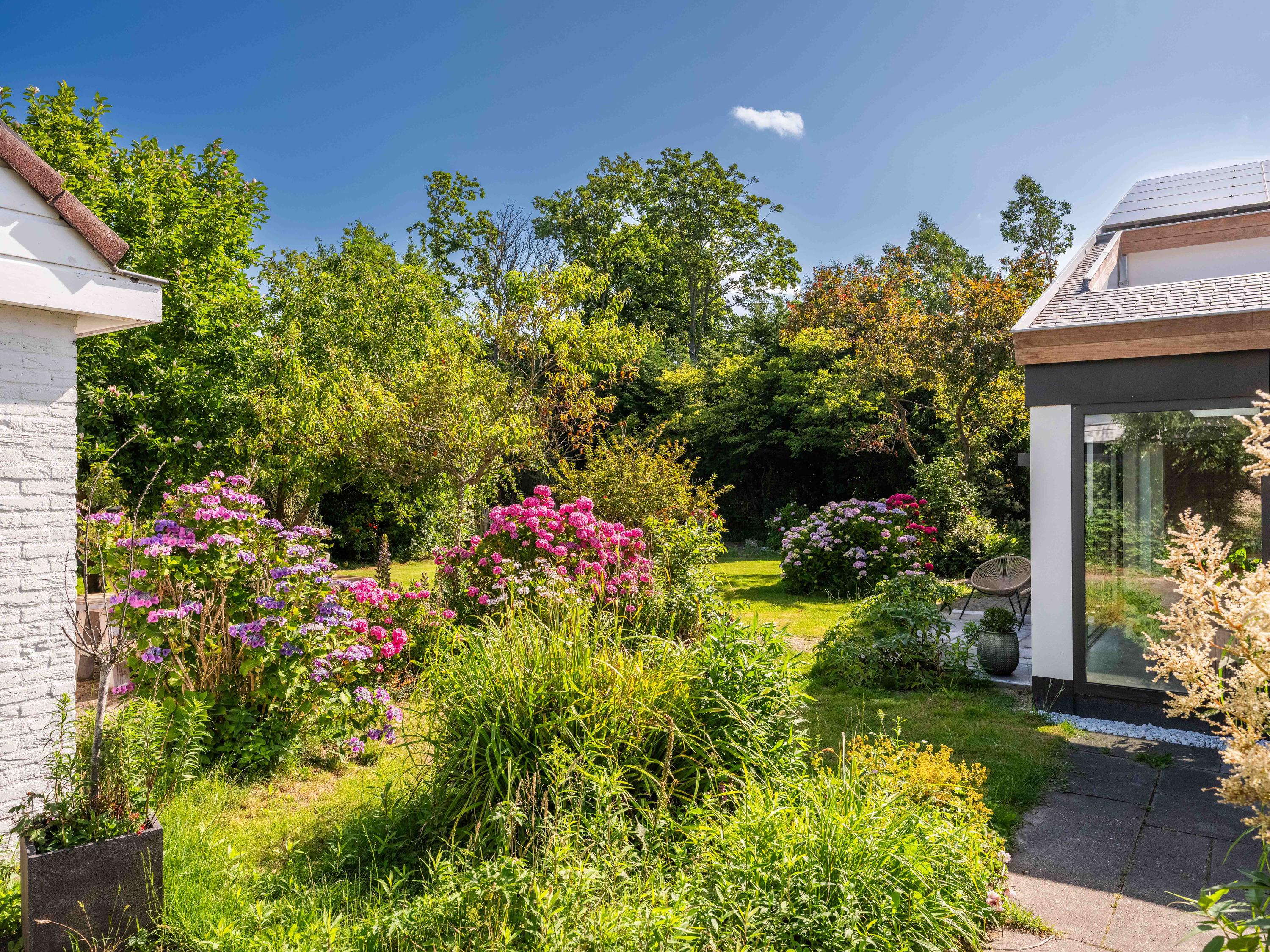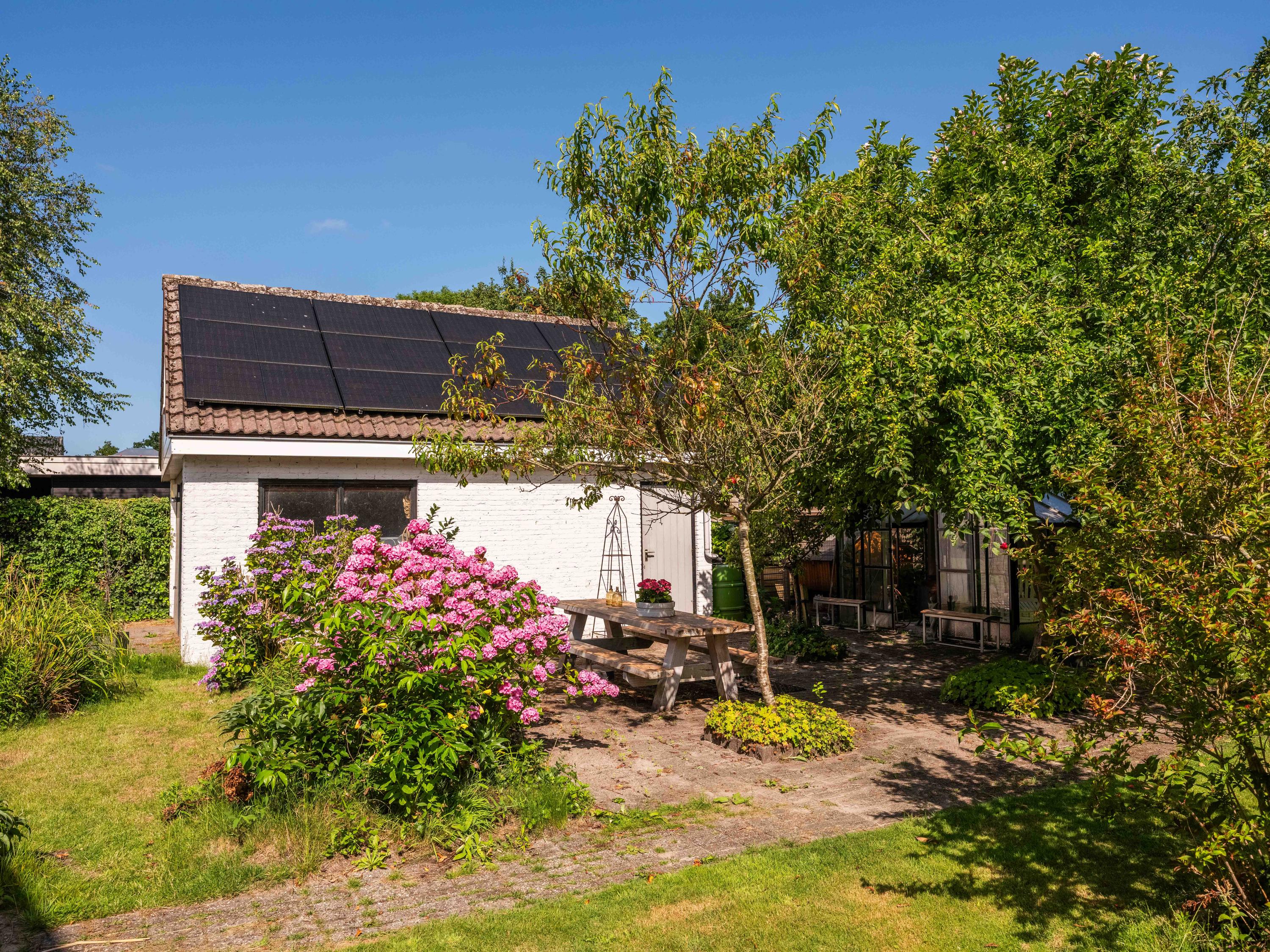 De rondom aangelegde tuin biedt volop privacy, zon én schaduw. Er is een kas voor de tuinliefhebber, nu in gebruik als sfeervolle borrelruimte met buitenhaard; de perfecte plek voor lange zomeravonden met vrienden en familie. Ook is er een grote vrijstaande stenen garage (ca. 50 m²) met bergvliering, geschikt voor twee auto's.