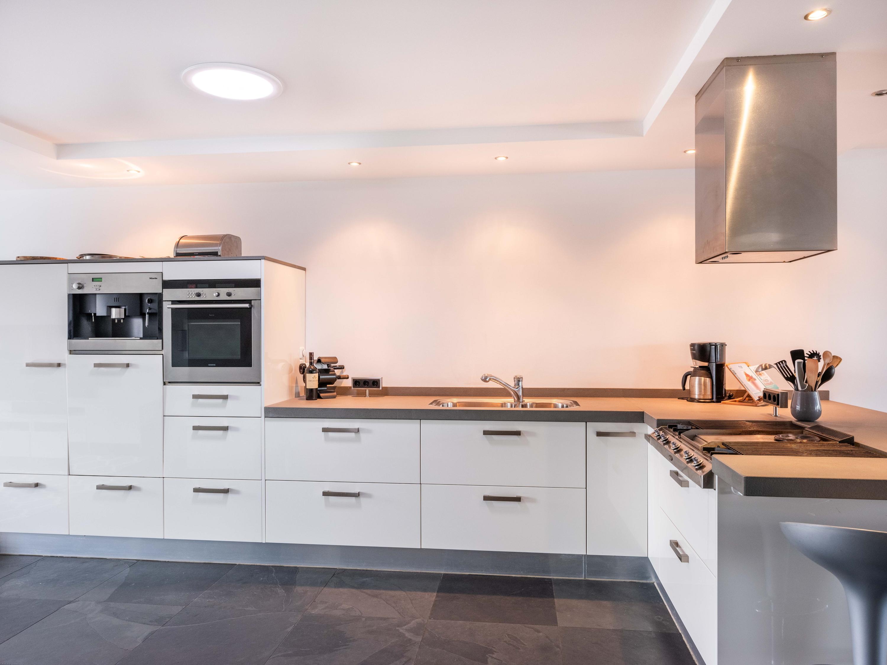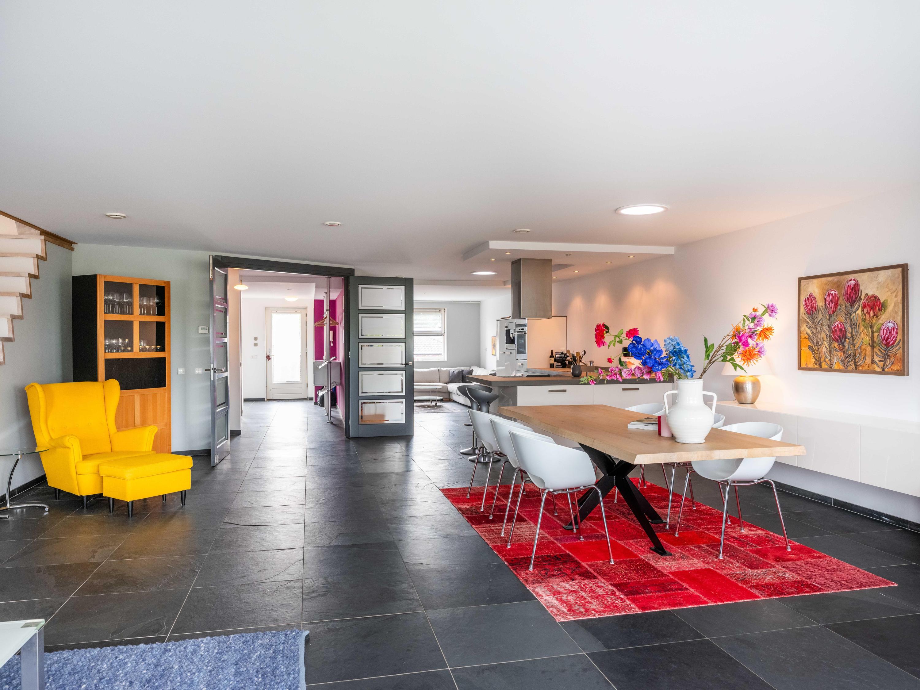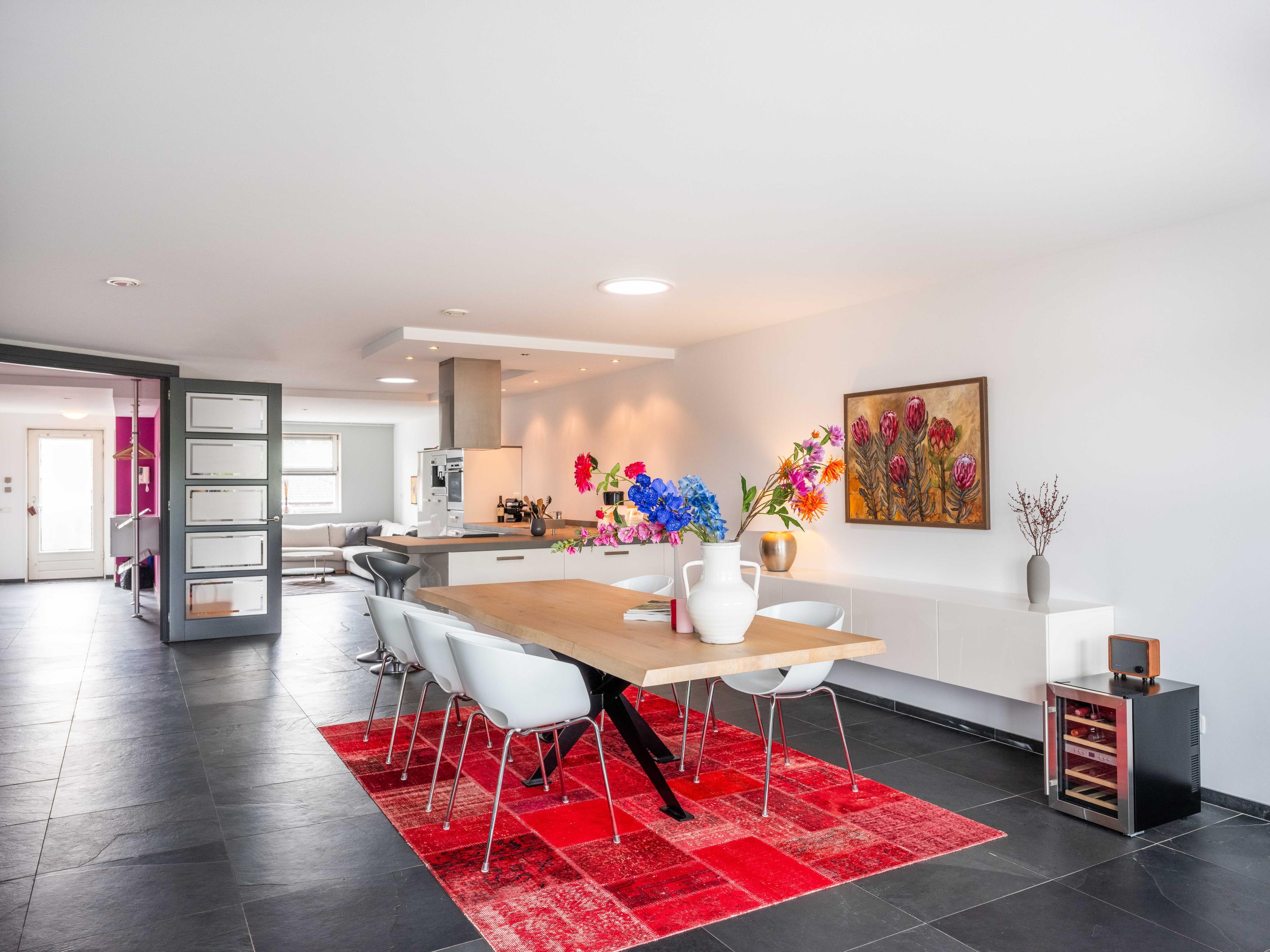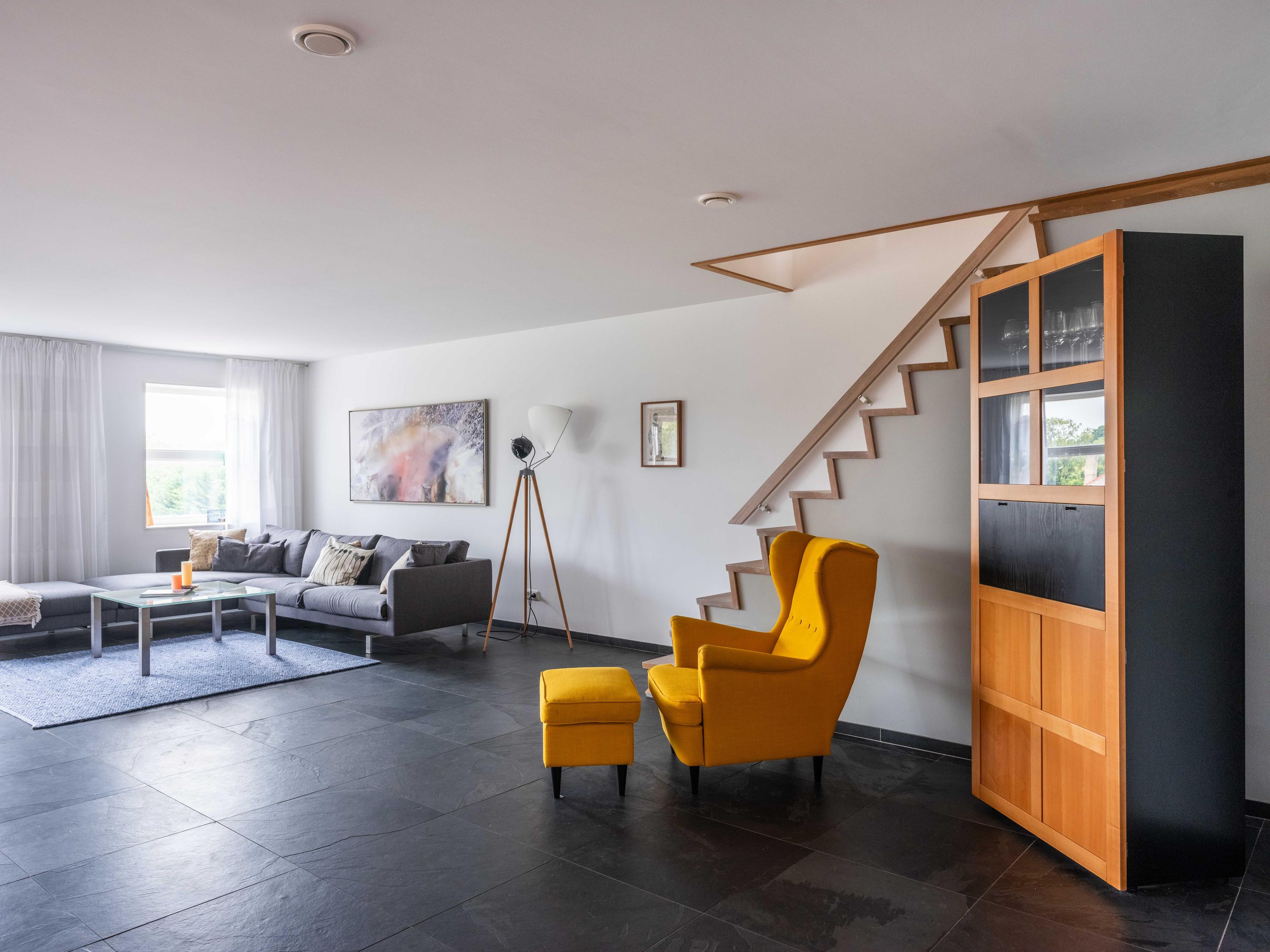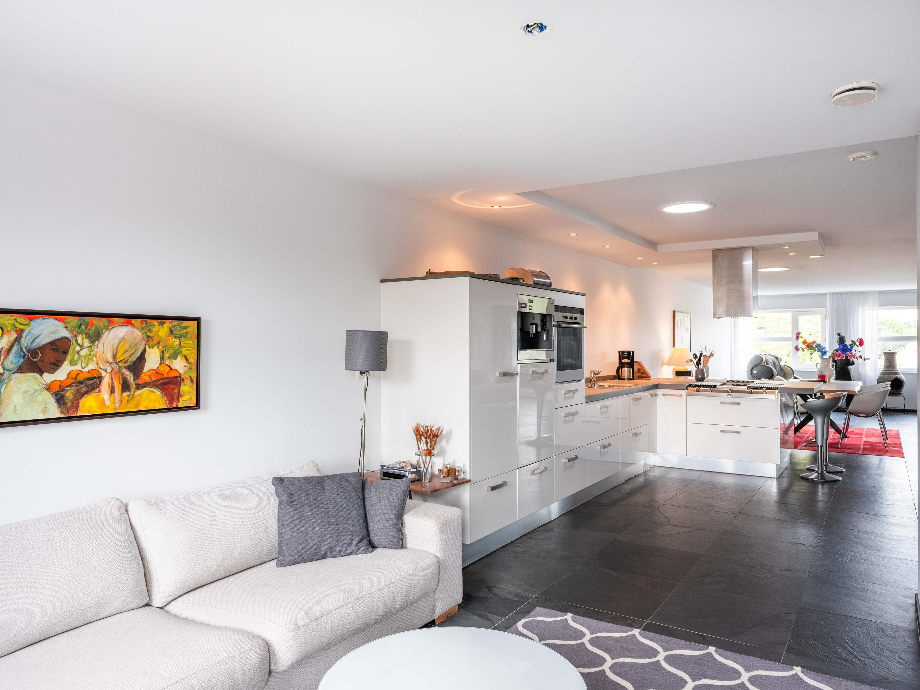 De royale woonkamer is voorzien van grote raampartijen en twee lighttubes, die zorgen voor veel natuurlijk licht. De woonkamer beschikt daarnaast over twee sfeervolle zithoeken en ruimte voor een grote eettafel. De ruimte loopt over in de open keuken, volledig uitgerust met hoogwaardige inbouwapparatuur en voorzien van veel opbergruimte. Op deze verdieping bevindt zich tevens een kantoor/slaapkamer en de eerste badkamer met een douche, toilet en wastafel. Tevens hier de technische ruimte met plek voor de c.v.-ketel, warmte-terugwin unit en de verdeler voor de vloerverwarming.