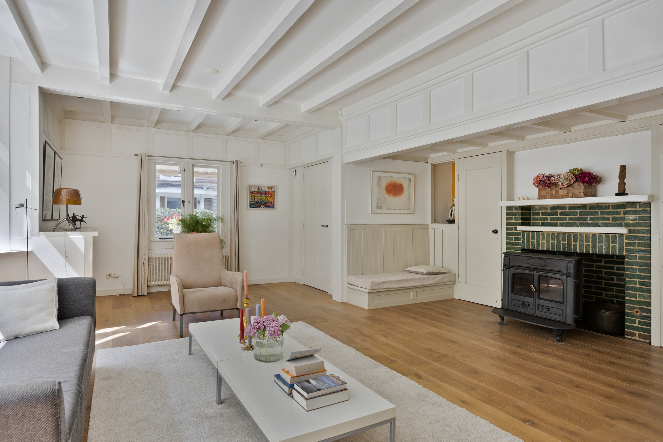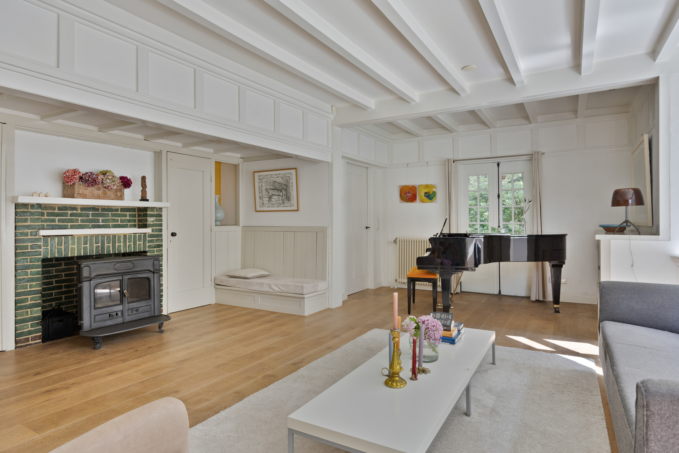 De royale woonkamer met erker, houtkachel, originele buffetkasten en karakteristiek balkenplafond ademt sfeer en authenticiteit. Zowel de woonkamer, keuken als TV-kamer beschikken over een originele schouw. Vanuit de hal is tevens de diepe kelder bereikbaar, ideaal voor bijvoorbeeld wijnopslag.