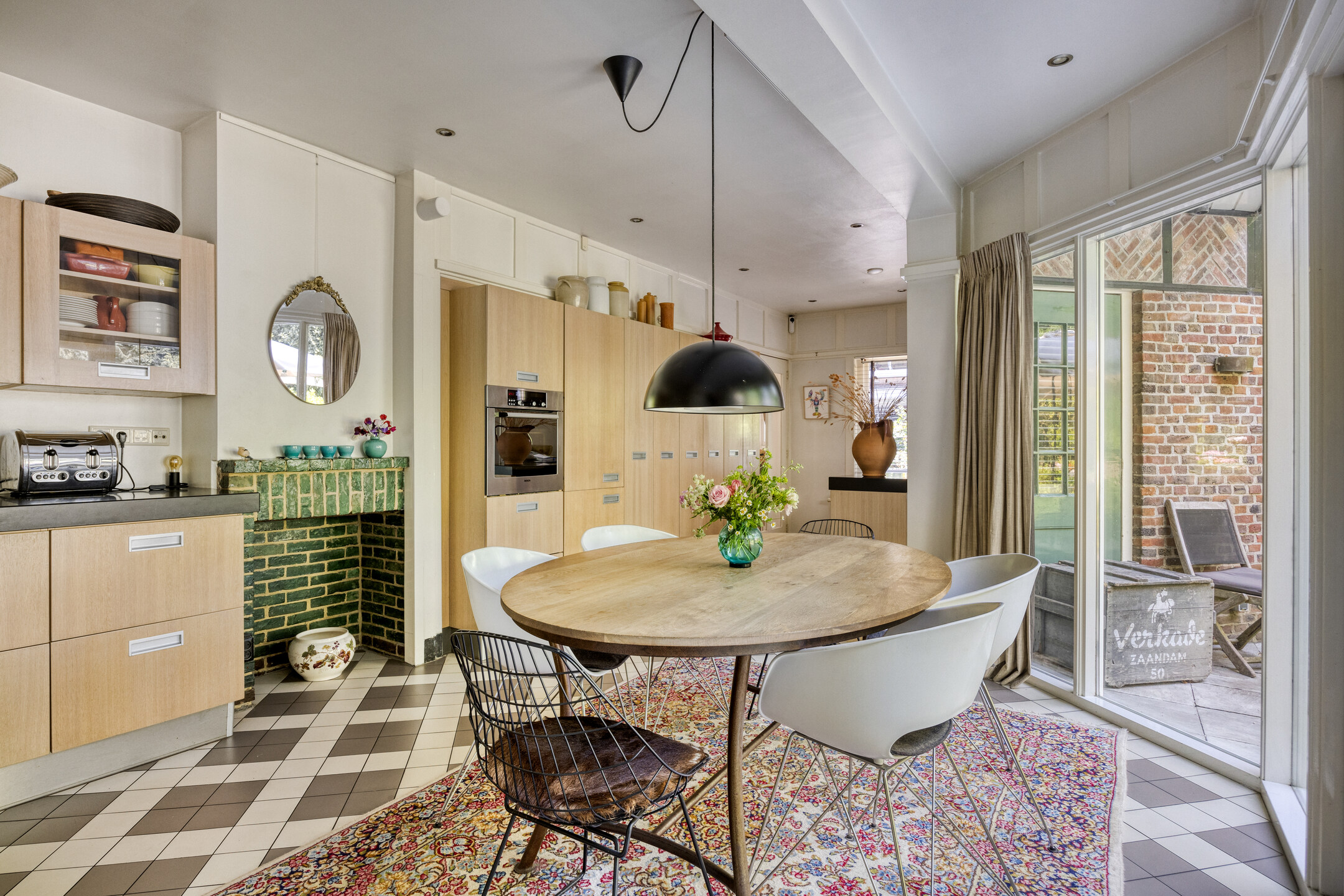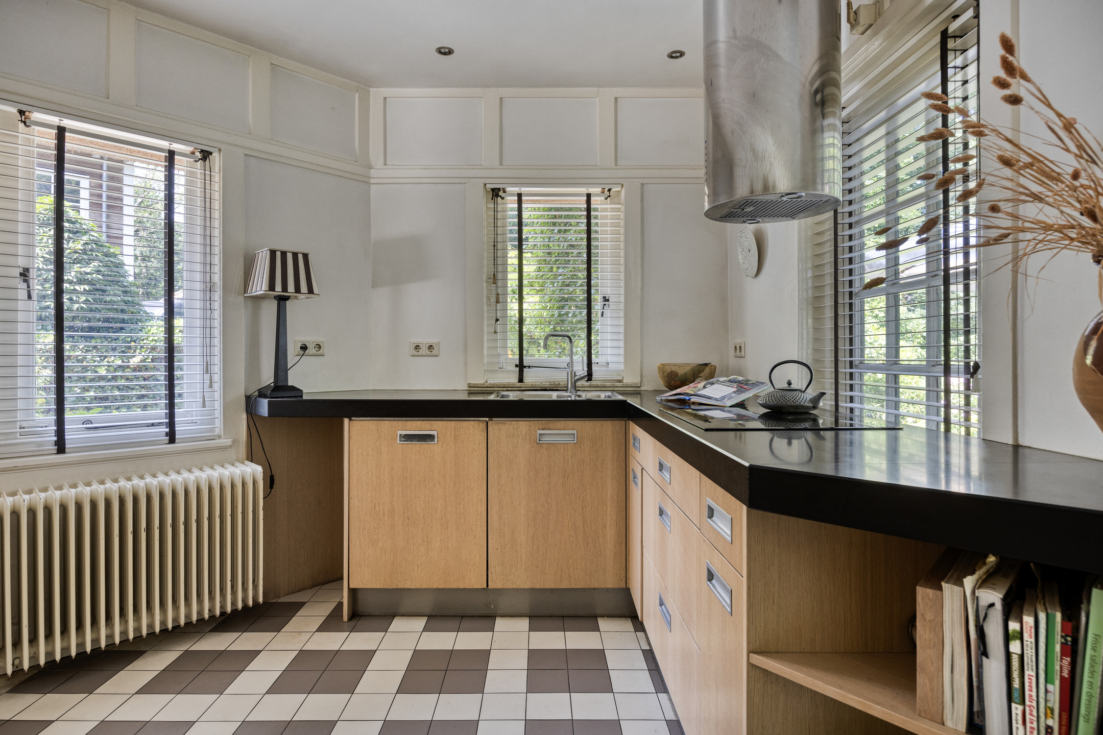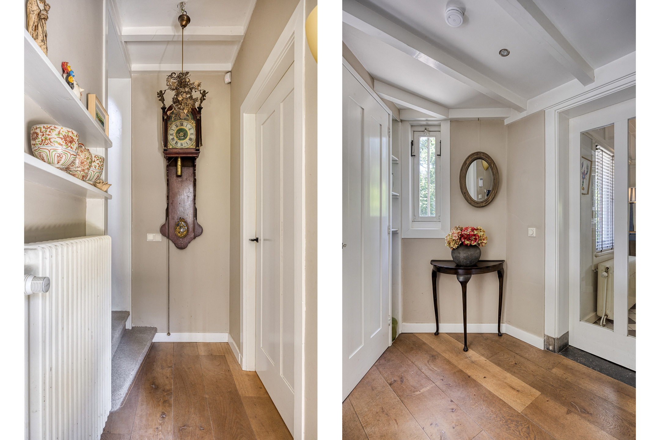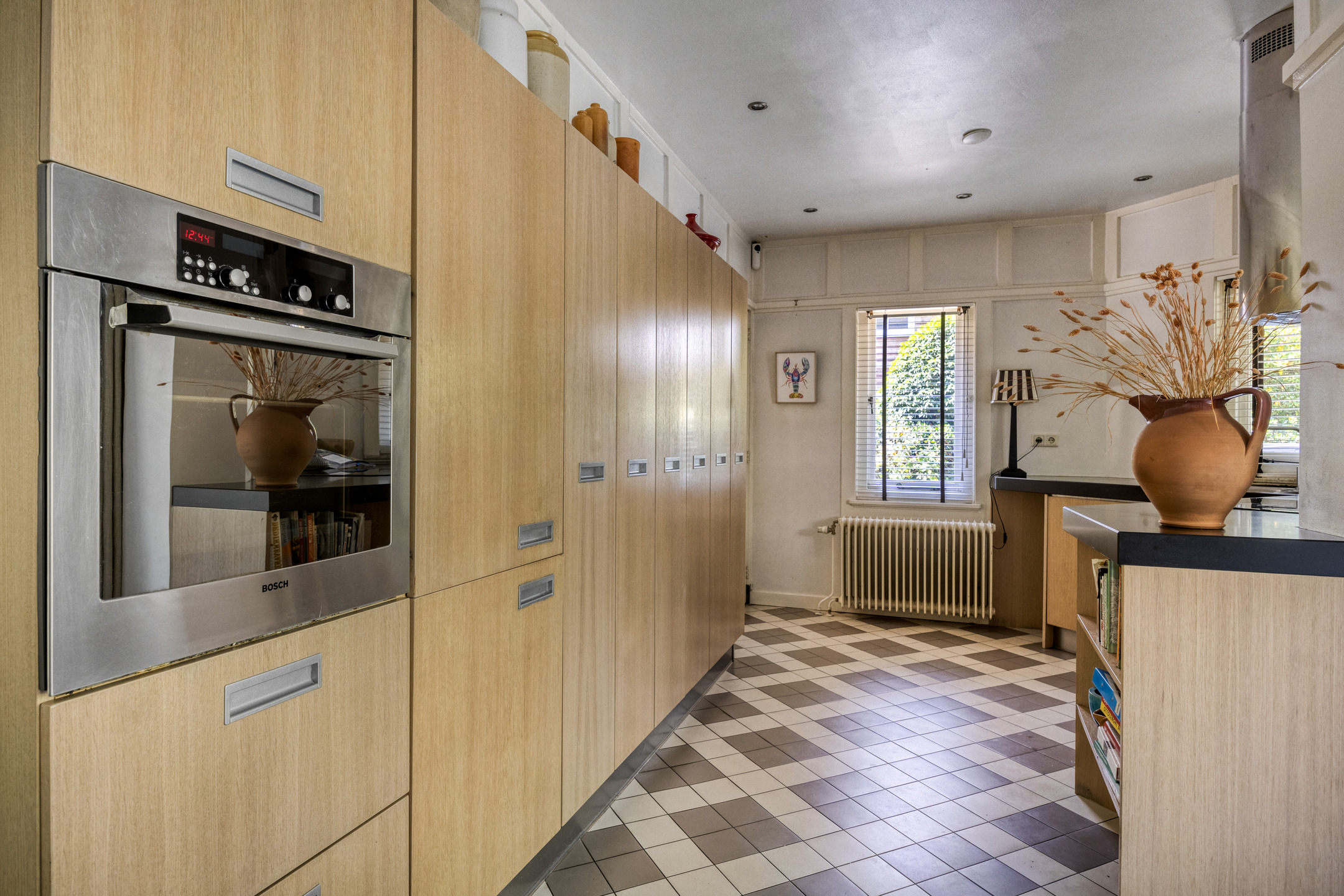 Aansluitend bevindt zich de praktische bijkeuken met vloerverwarming, wasmachine- en drogeraansluiting en een douche met toilet en fontein. Vanuit de keuken bereikt u de sfeervolle TV-kamer met massief eiken vloer, ingebouwde kasten en grote raampartijen met isolerend monumentenglas.