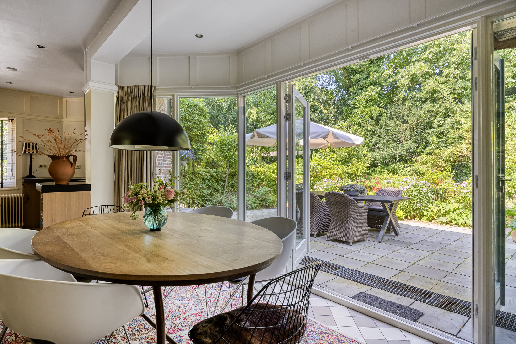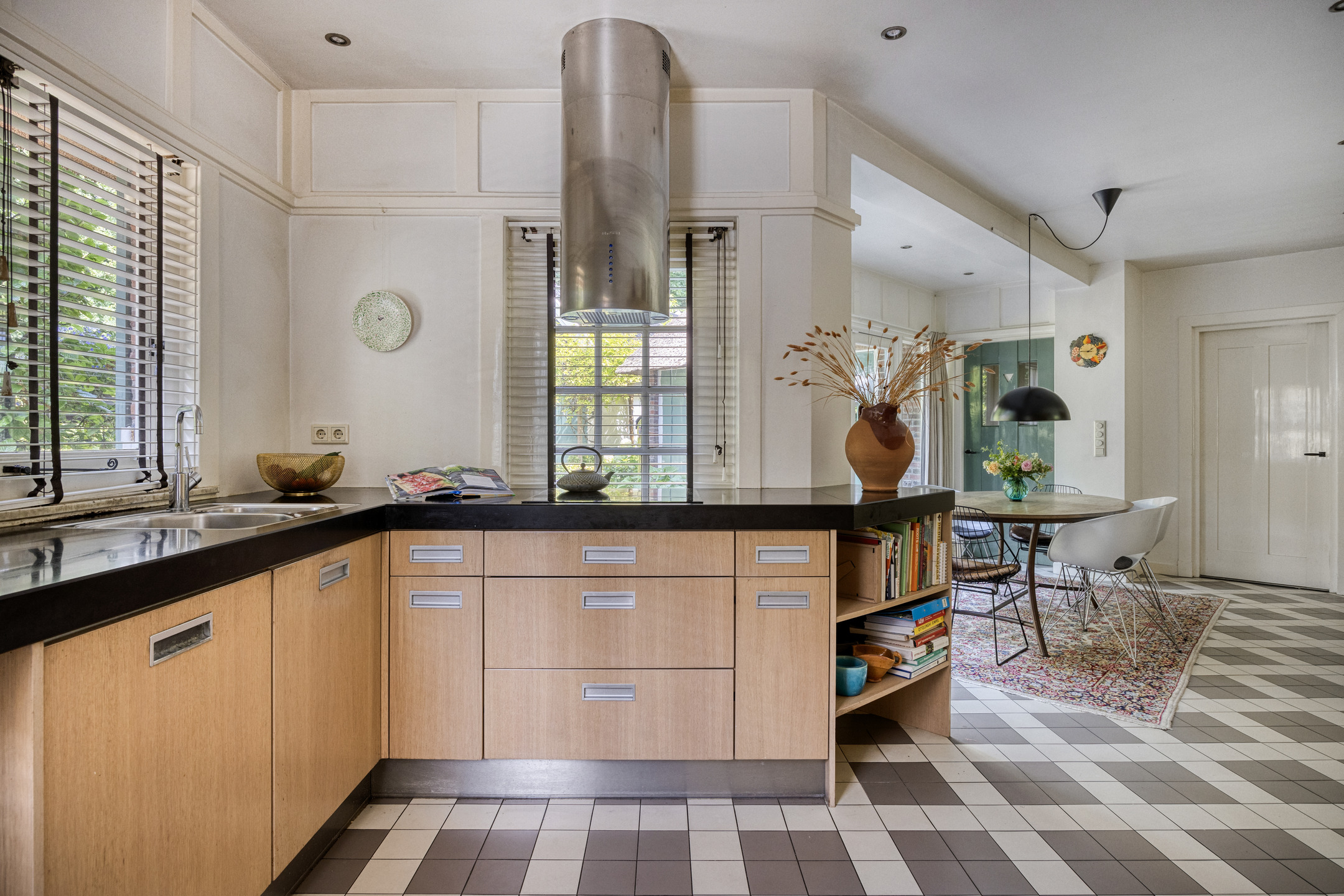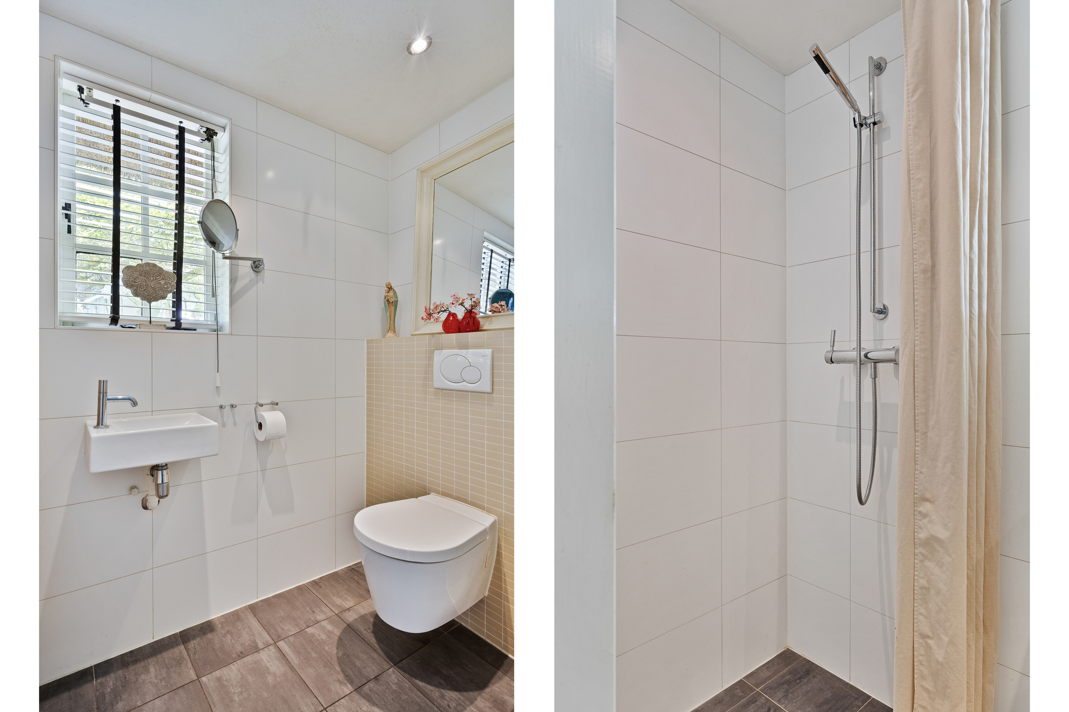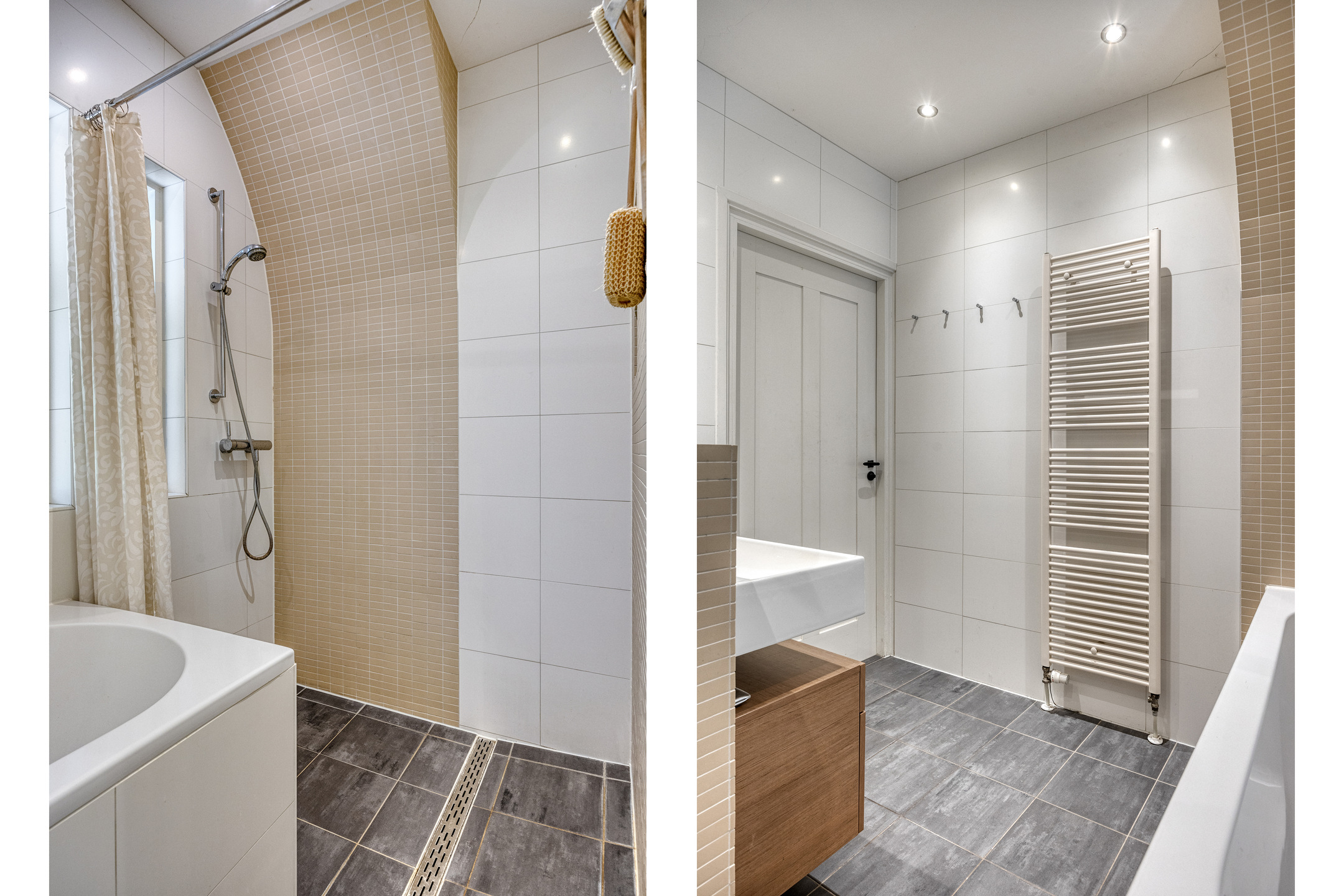 Aansluitend bevindt zich de praktische bijkeuken met vloerverwarming, wasmachine- en drogeraansluiting en een douche met toilet en fontein. Vanuit de keuken bereikt u de sfeervolle TV-kamer met massief eiken vloer, ingebouwde kasten en grote raampartijen met isolerend monumentenglas.